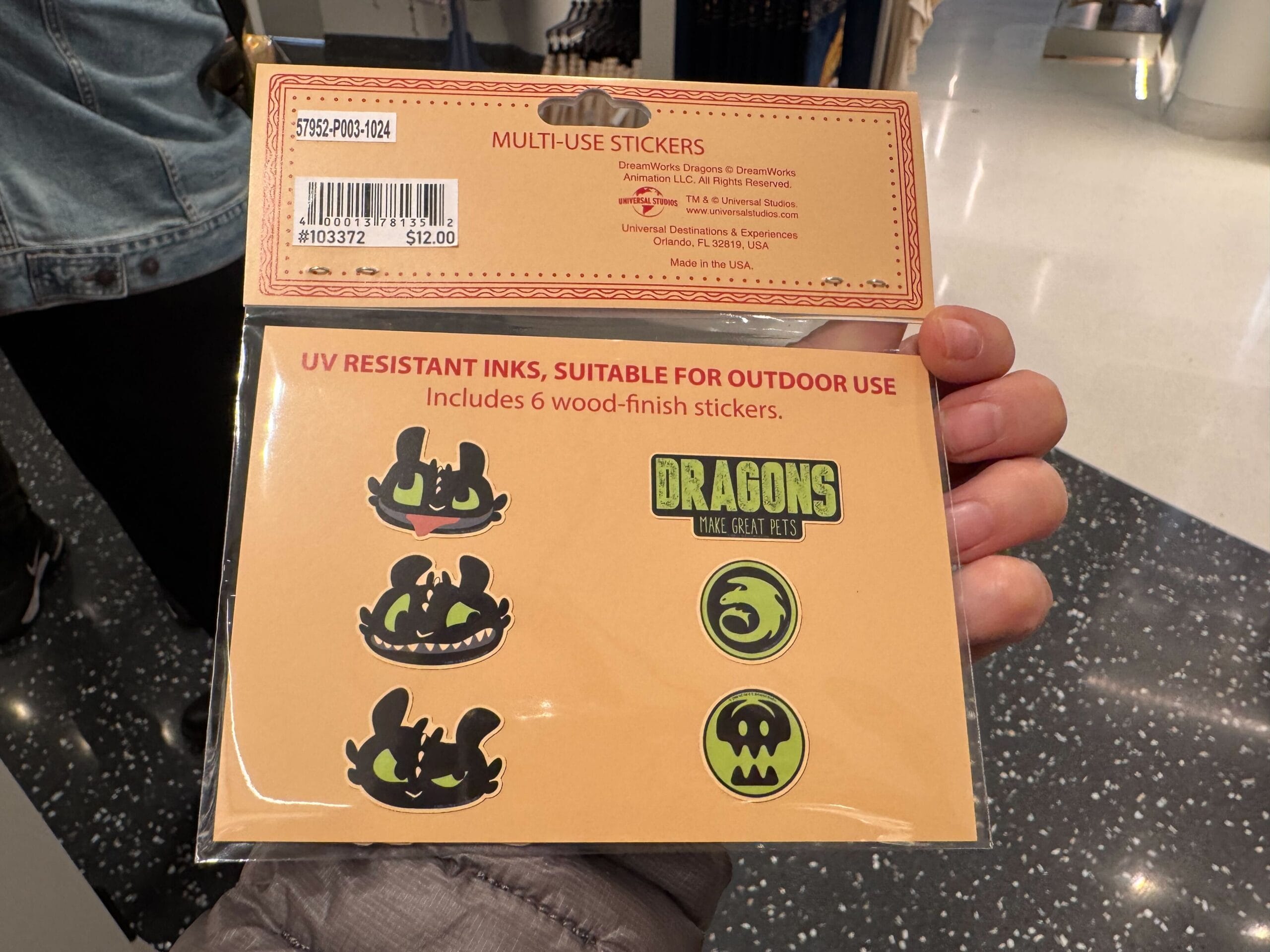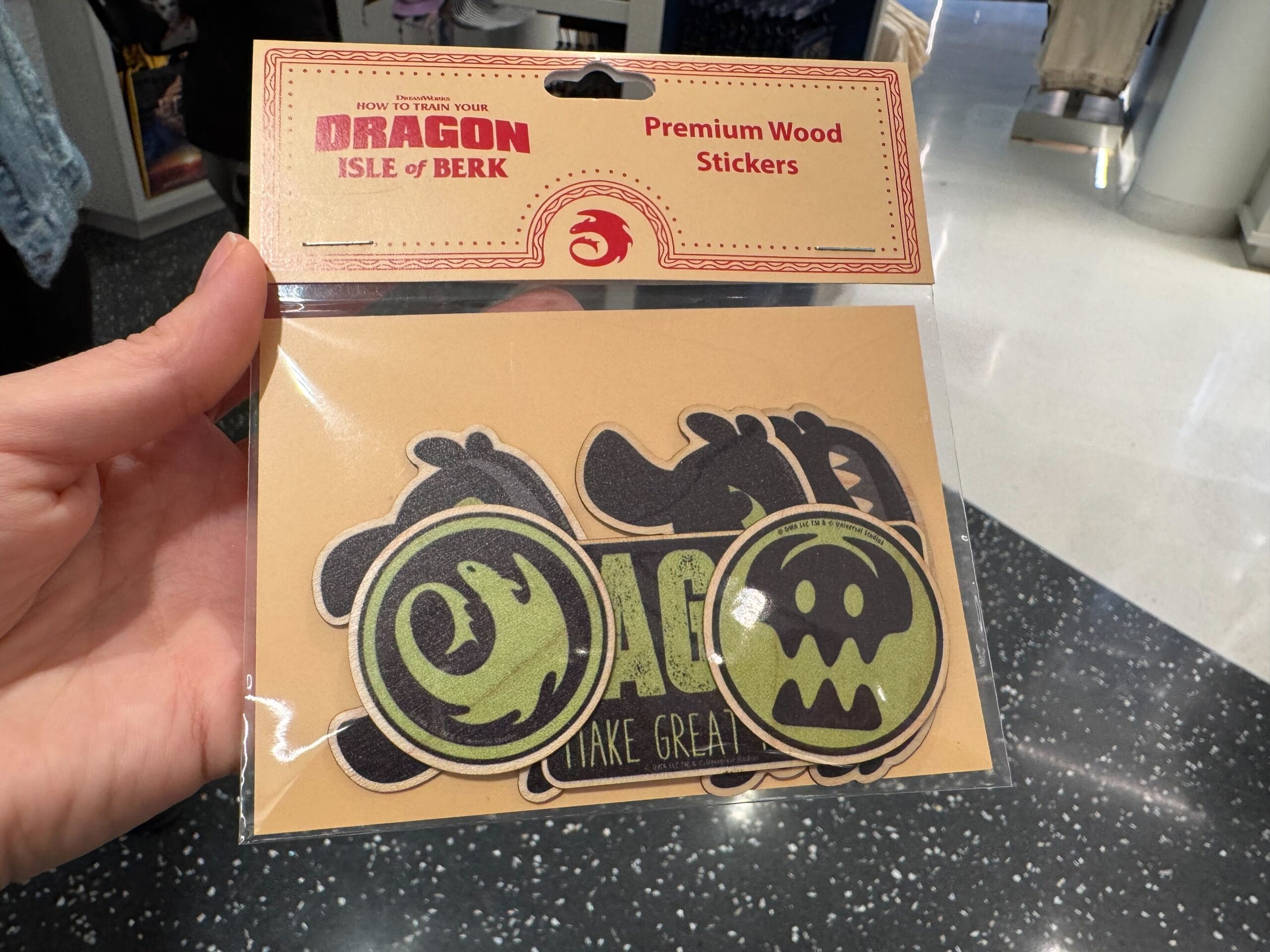 These six wood stickers are UV resistant and suitable for outdoor use. Three are Toothless’ face. One reads “Dragons make great pets” in green letters. Another features a dragon logo and the last is a skull logo.