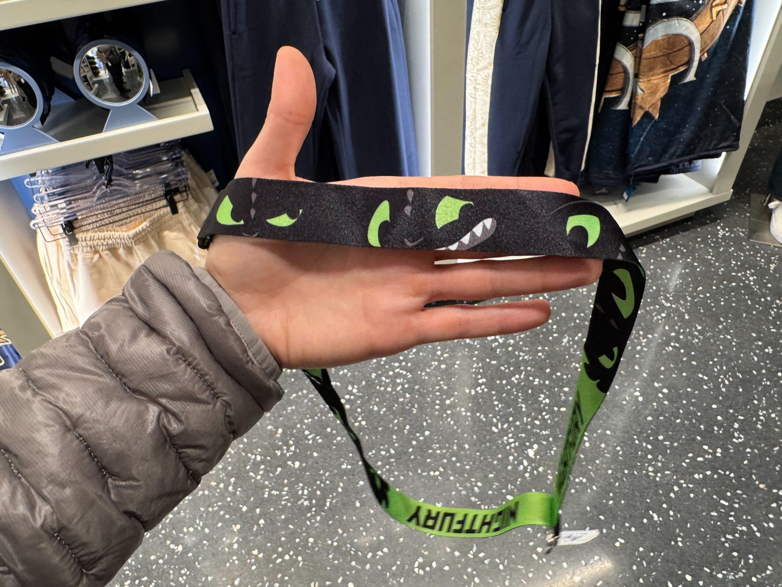 This green strap has a keyring on one end and black clip on the other end. Toothless is pictured on one side of the strap. “Night Fury” is on the other side.