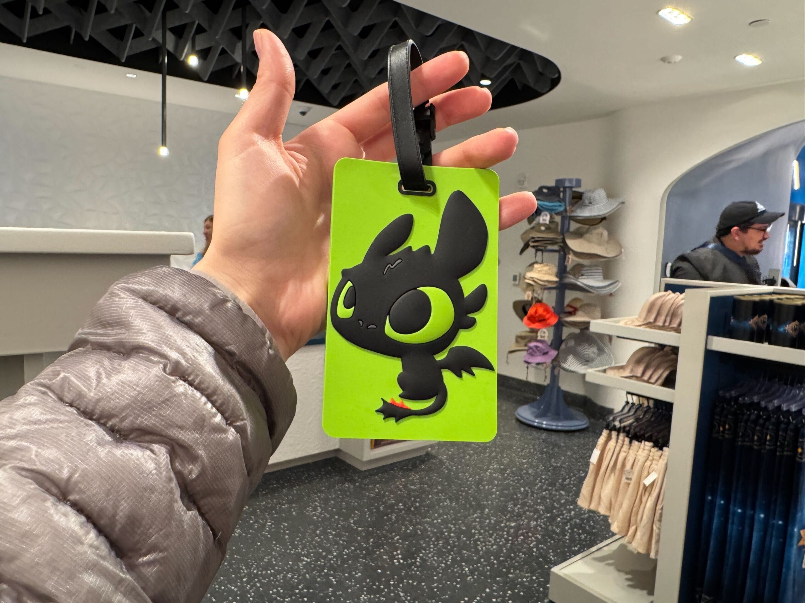 Lastly is this silicone luggage tag. On the green front is a puffy depiction of Toothless with a large head. On the other side is the clear slot. It has a black strap.