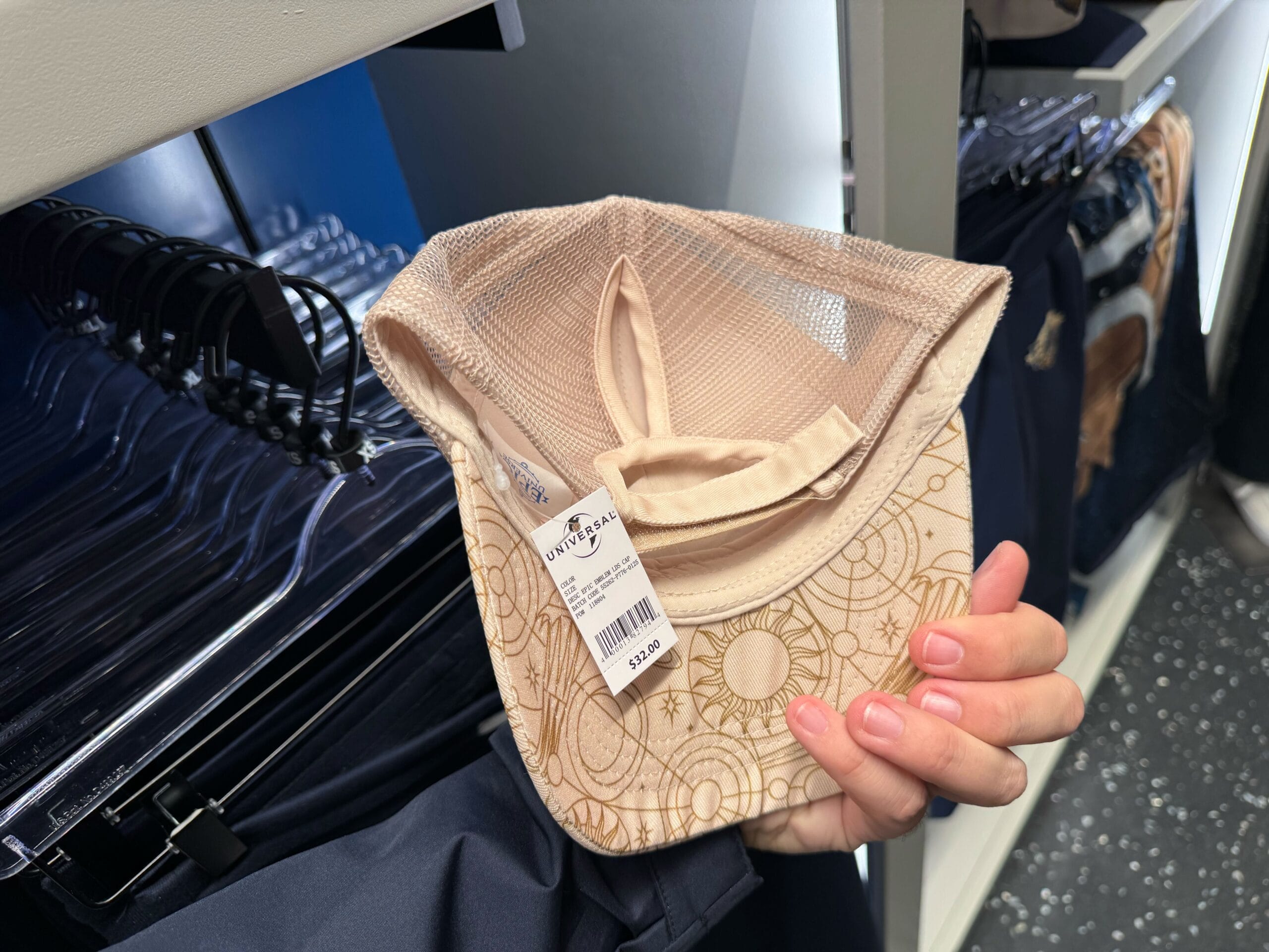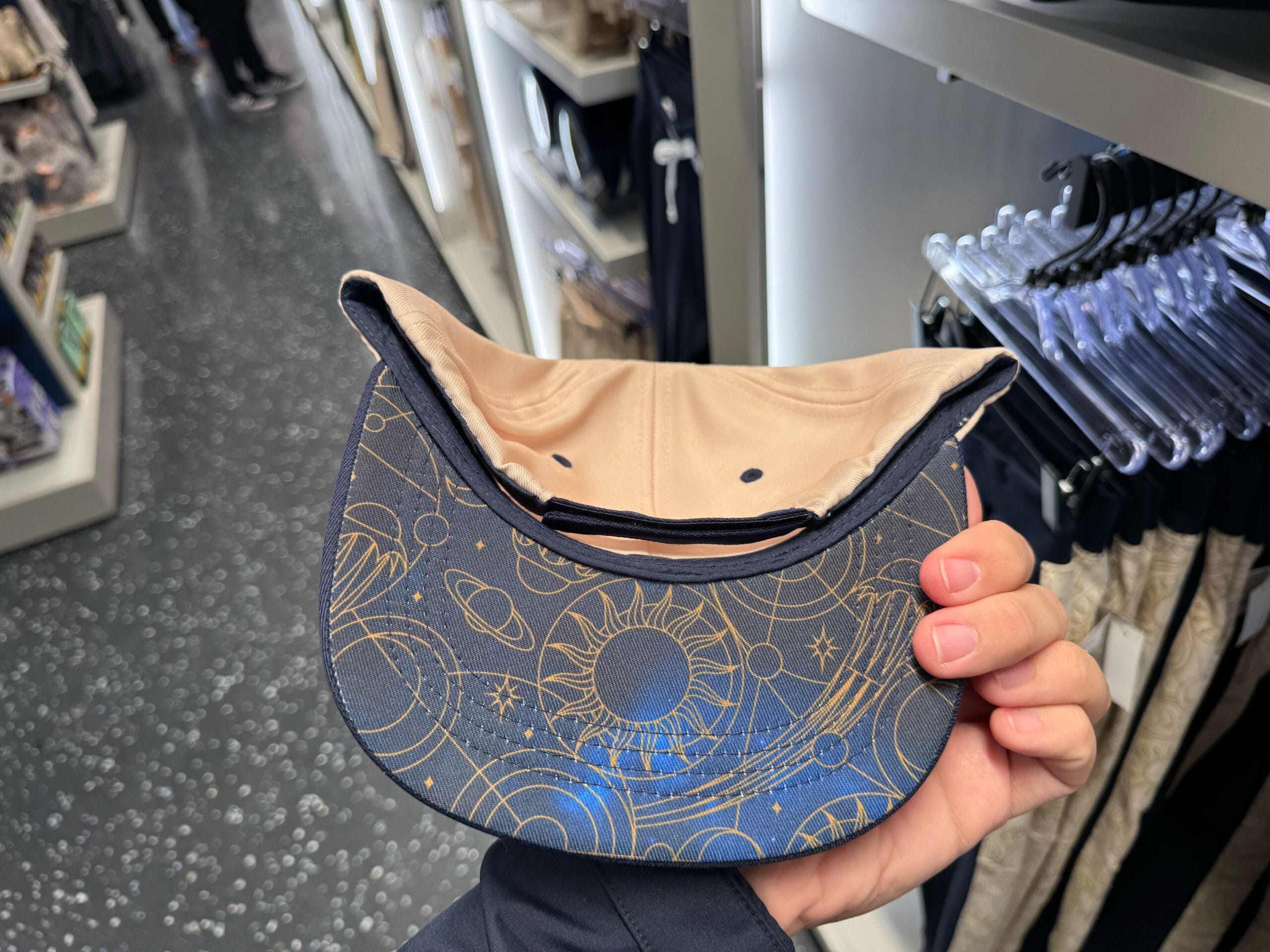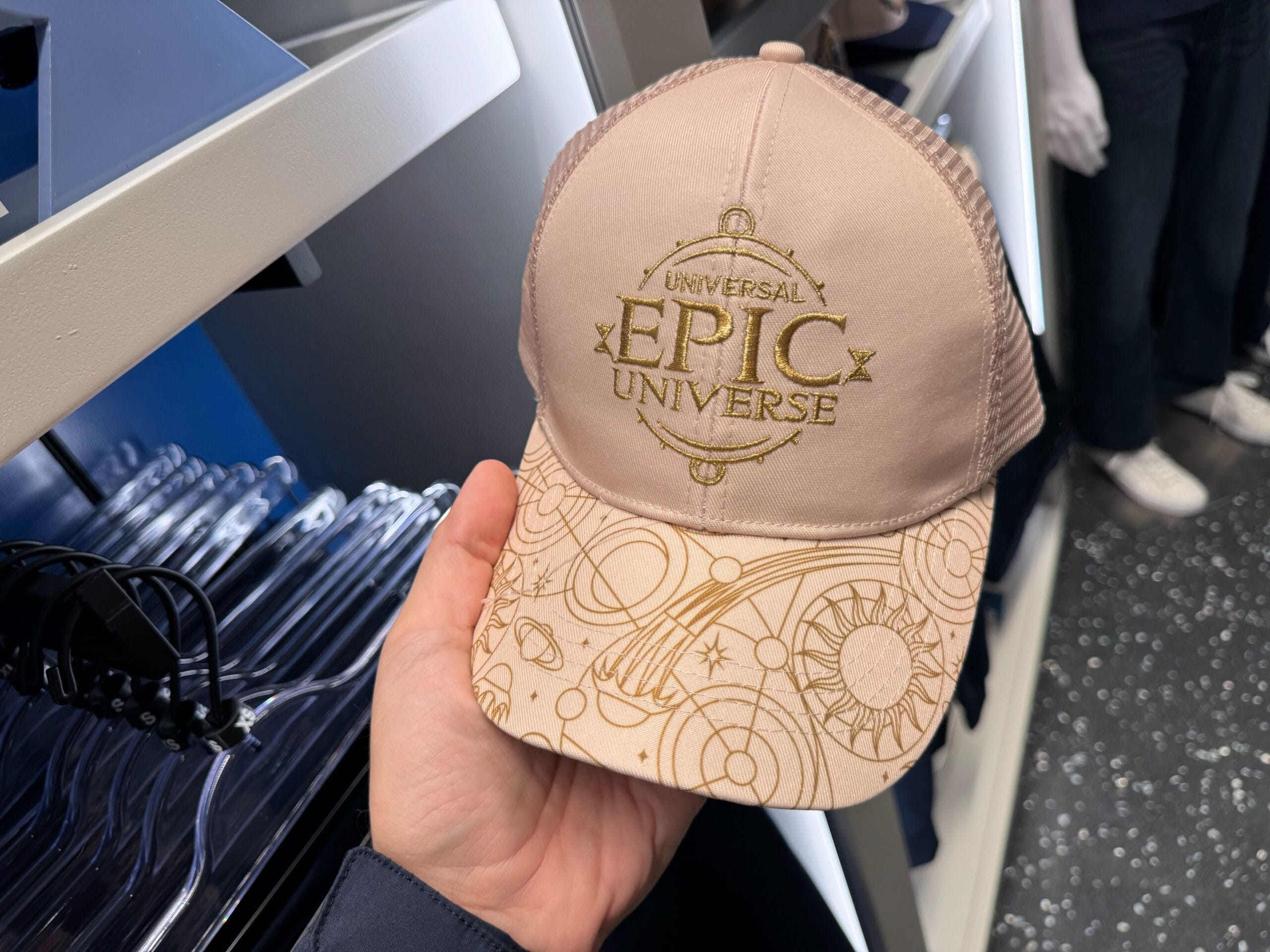 The celestial pattern is across the top of this hat’s beige brim. The minimalist Epic Universe logo is embroidered in gold across the front of the cap.