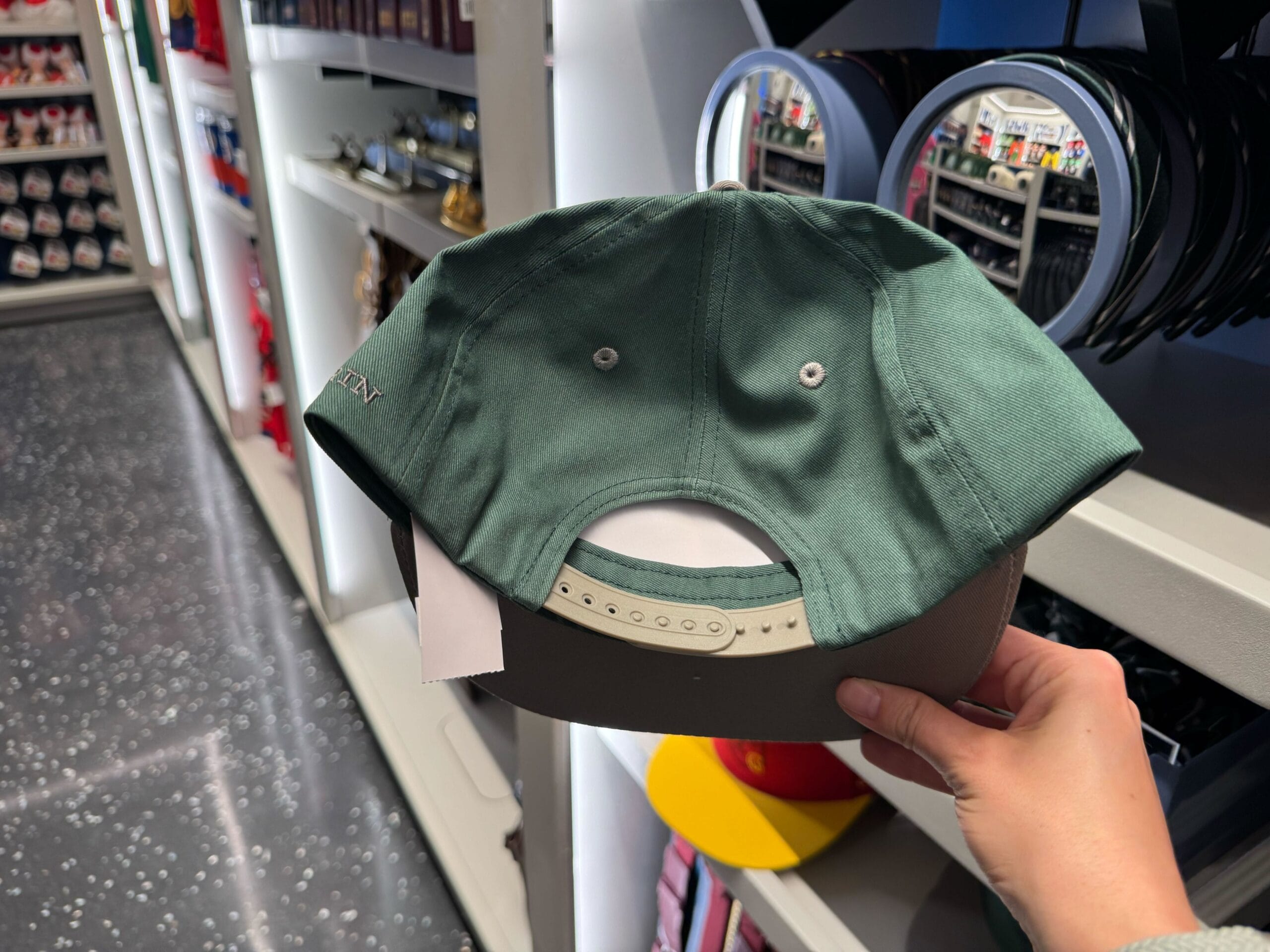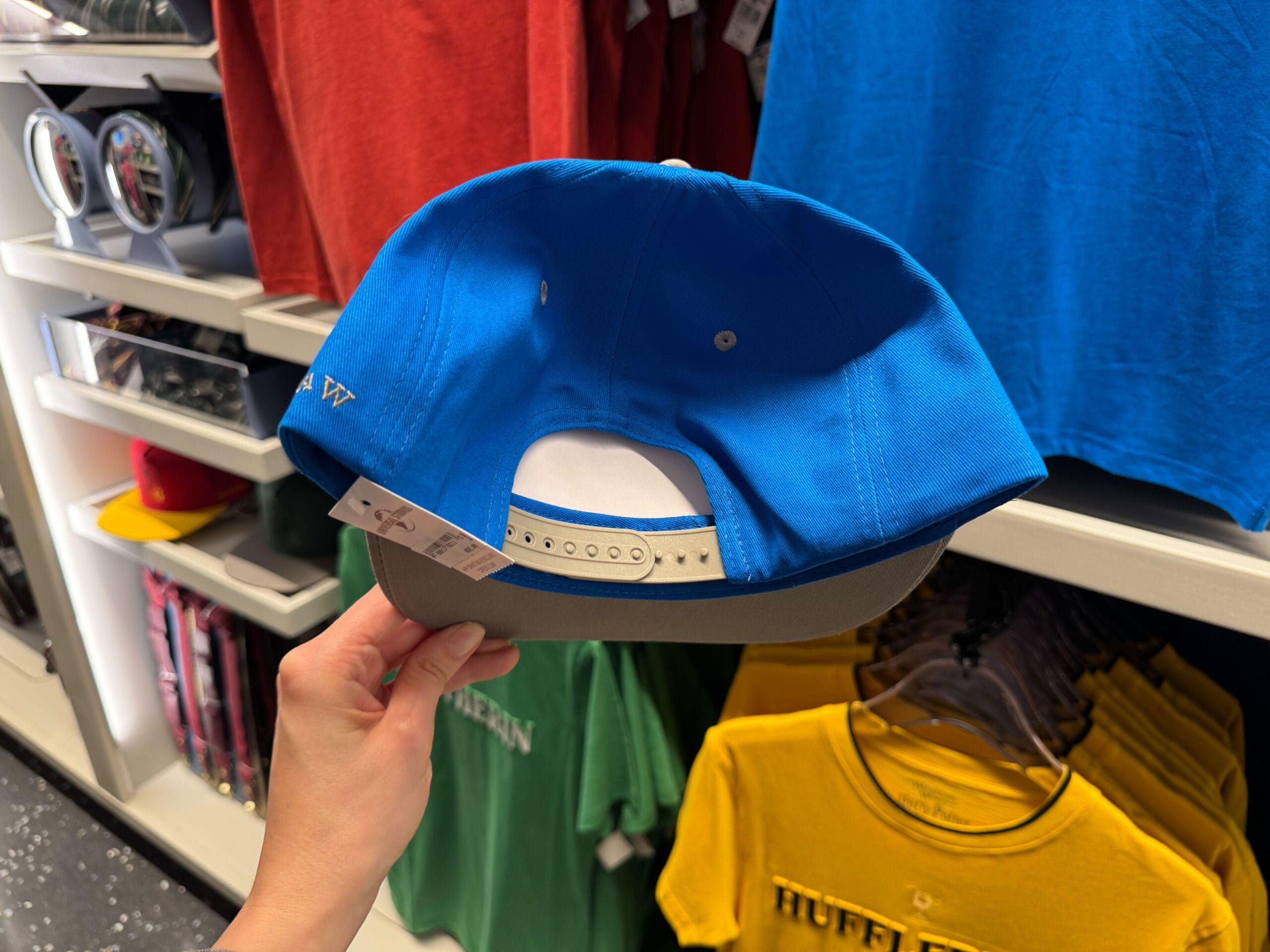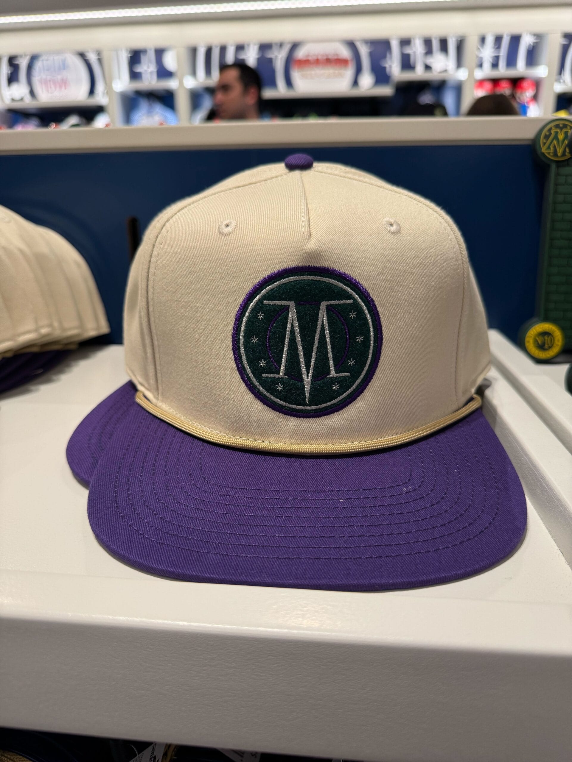 The celestial pattern is across the top of this hat’s beige brim. The minimalist Epic Universe logo is embroidered in gold across the front of the cap.