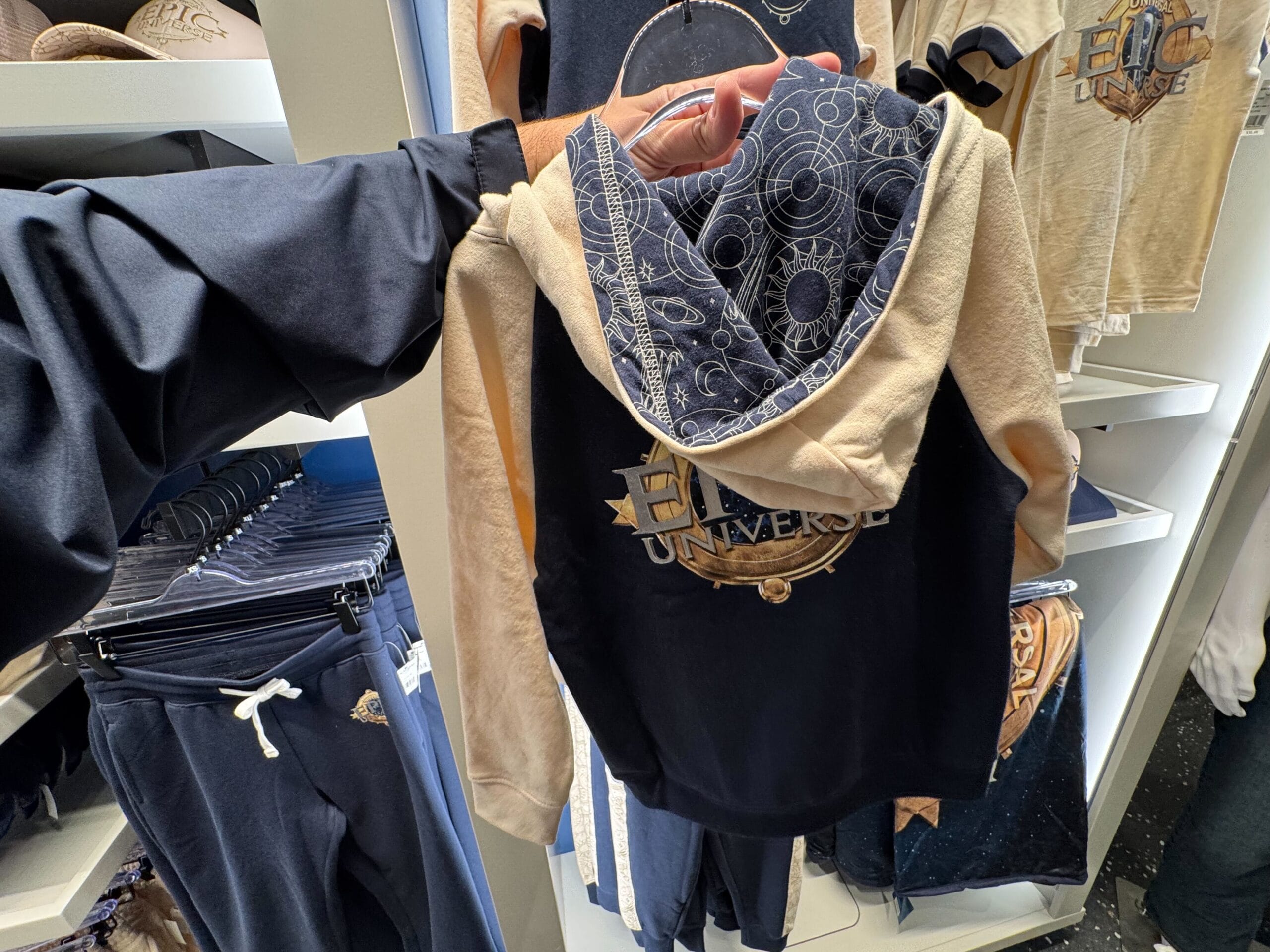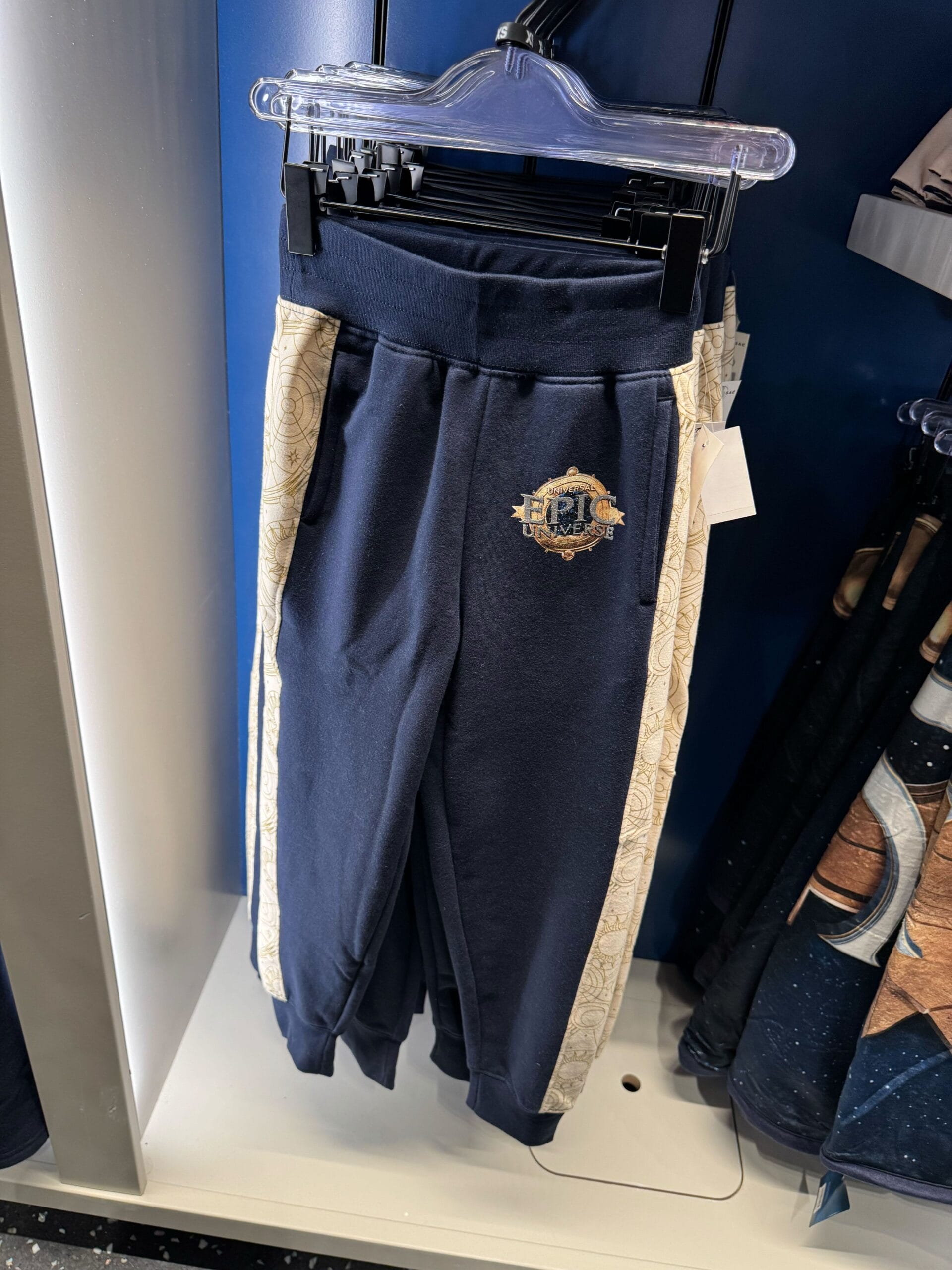 These pants are dark blue with beige stripes down the sides. The stripes are adorned with the celestial pattern. The Epic Universe logo is on the left pocket. It has an elastic waist and cuffs.