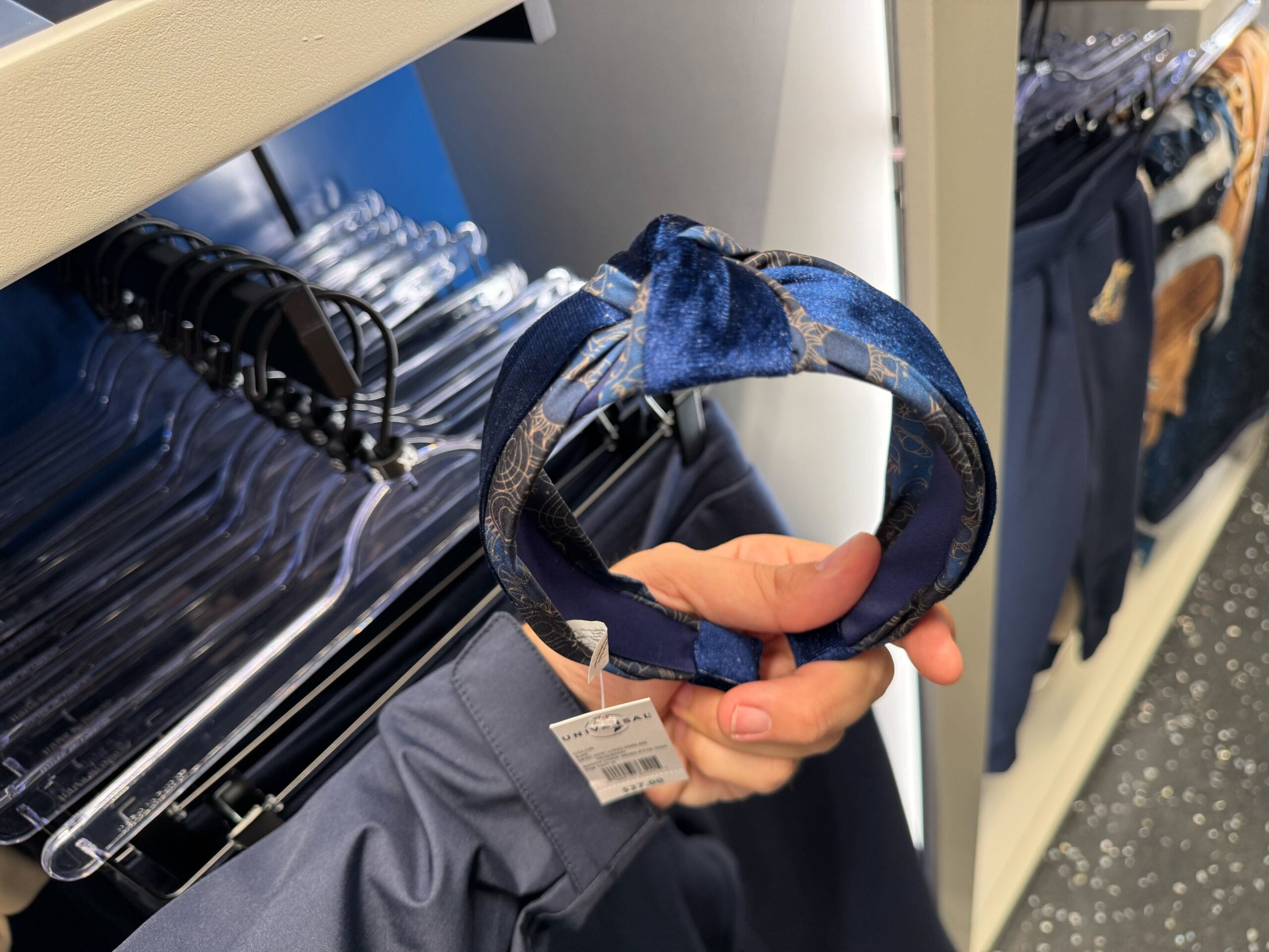 This headband features two fabrics. The satin lower layer is blue and black with a yellow-gold celestial pattern. The top layer is blue velvet.