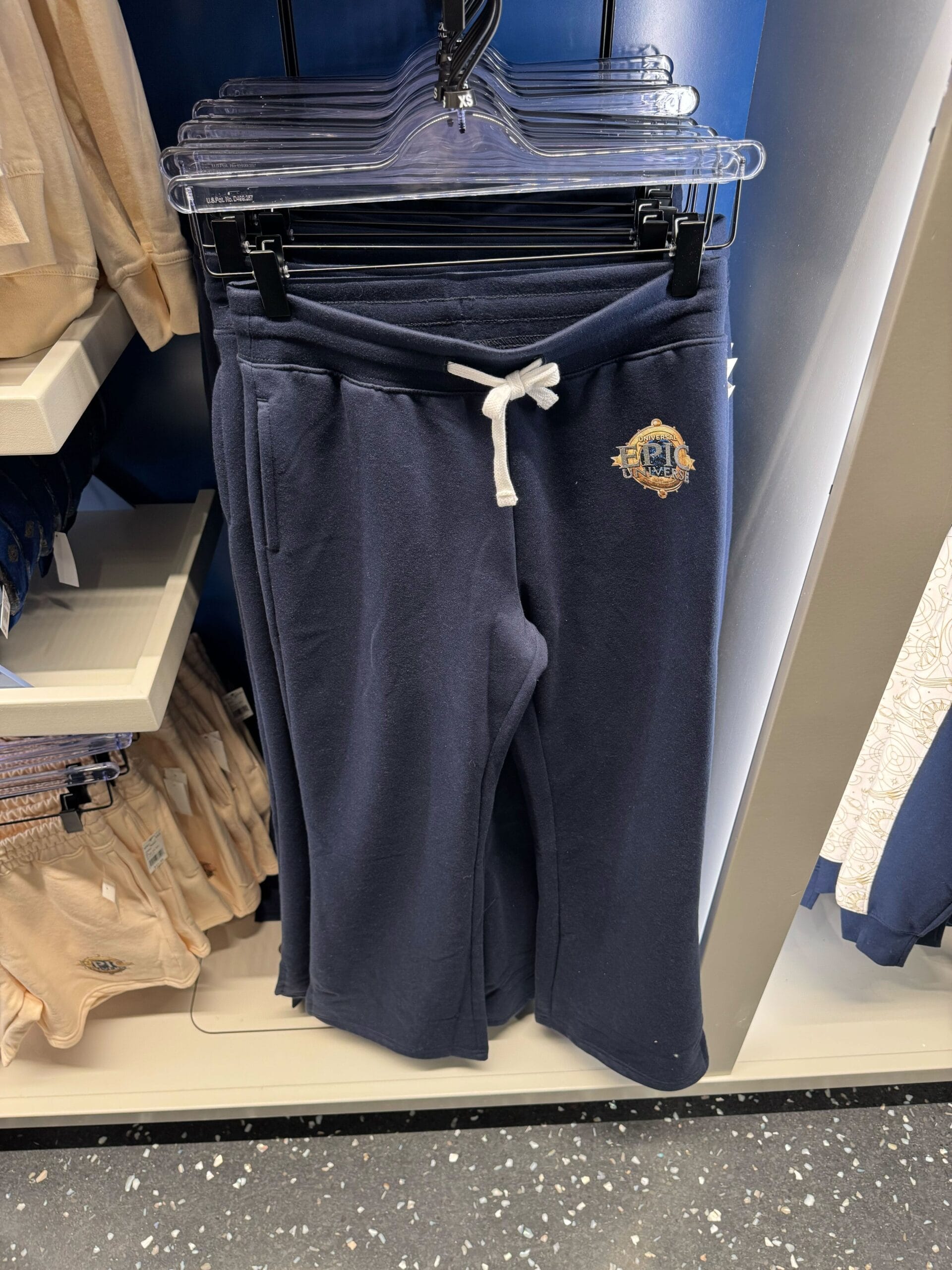 These pants are dark blue with a white drawstring at the waist. The Epic Universe logo is on the left leg.