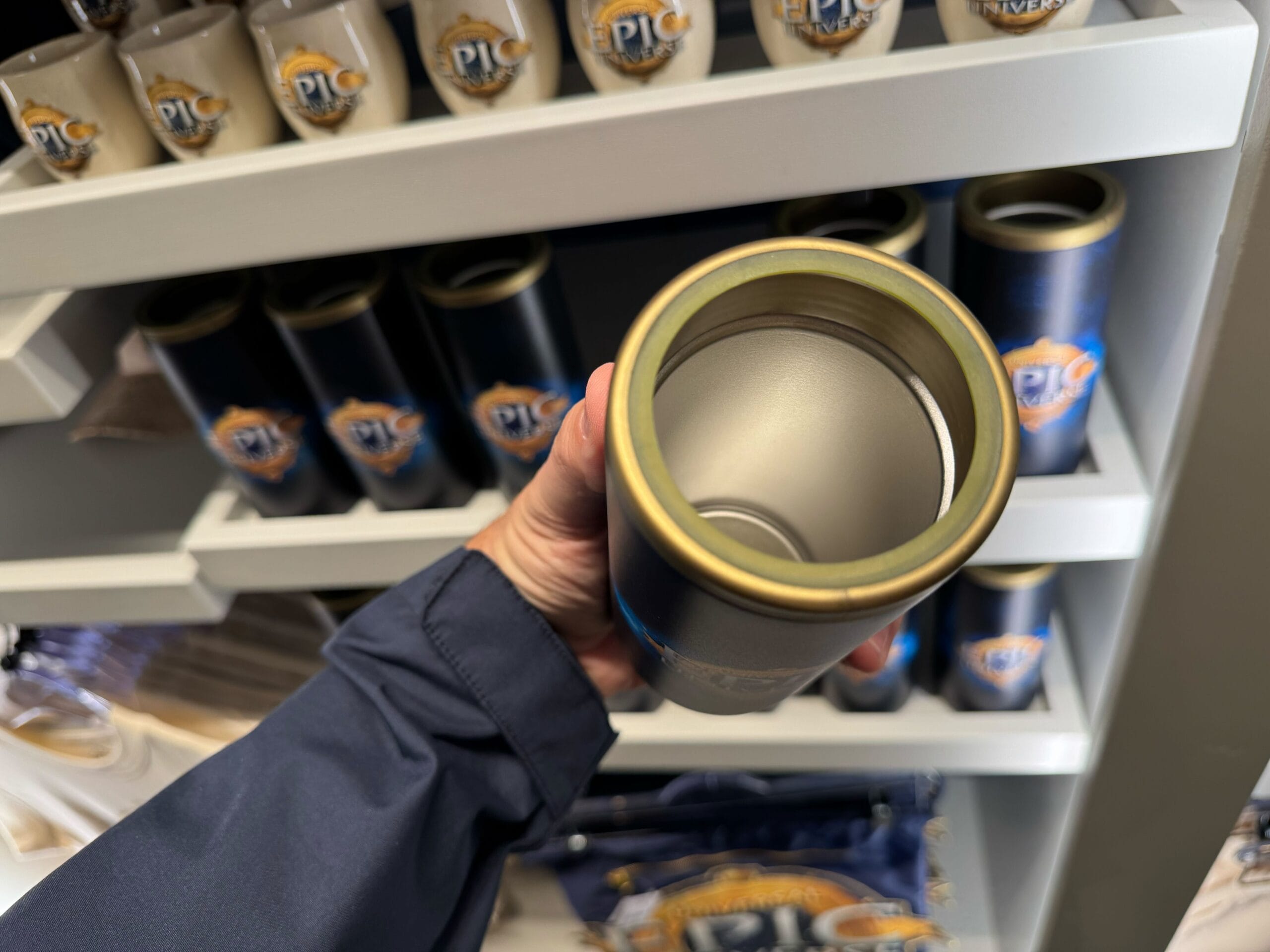 This is a stainless steel koozie. The exterior is a dark blue sky with the Epic Universe logo. It has a gold rim.