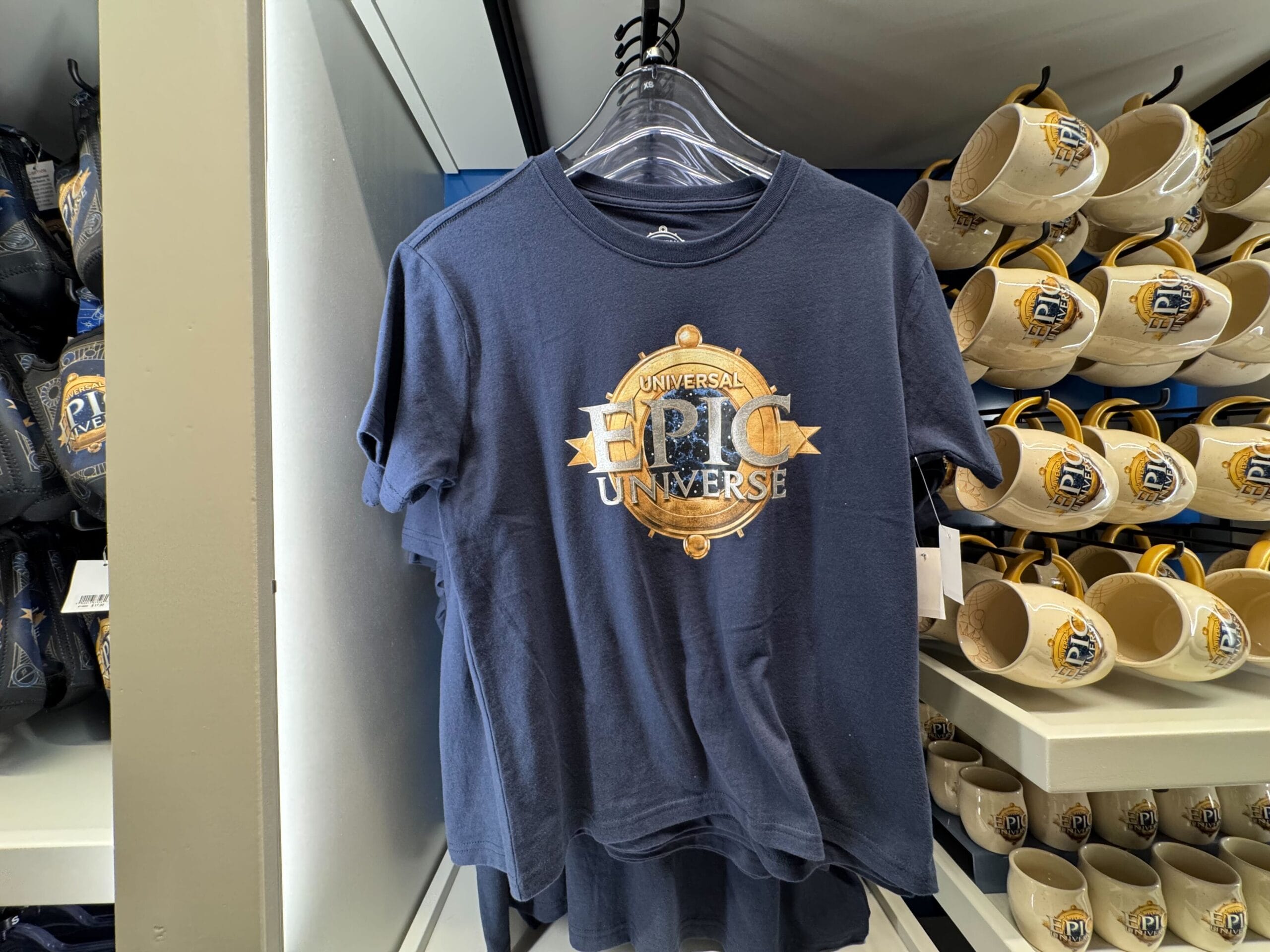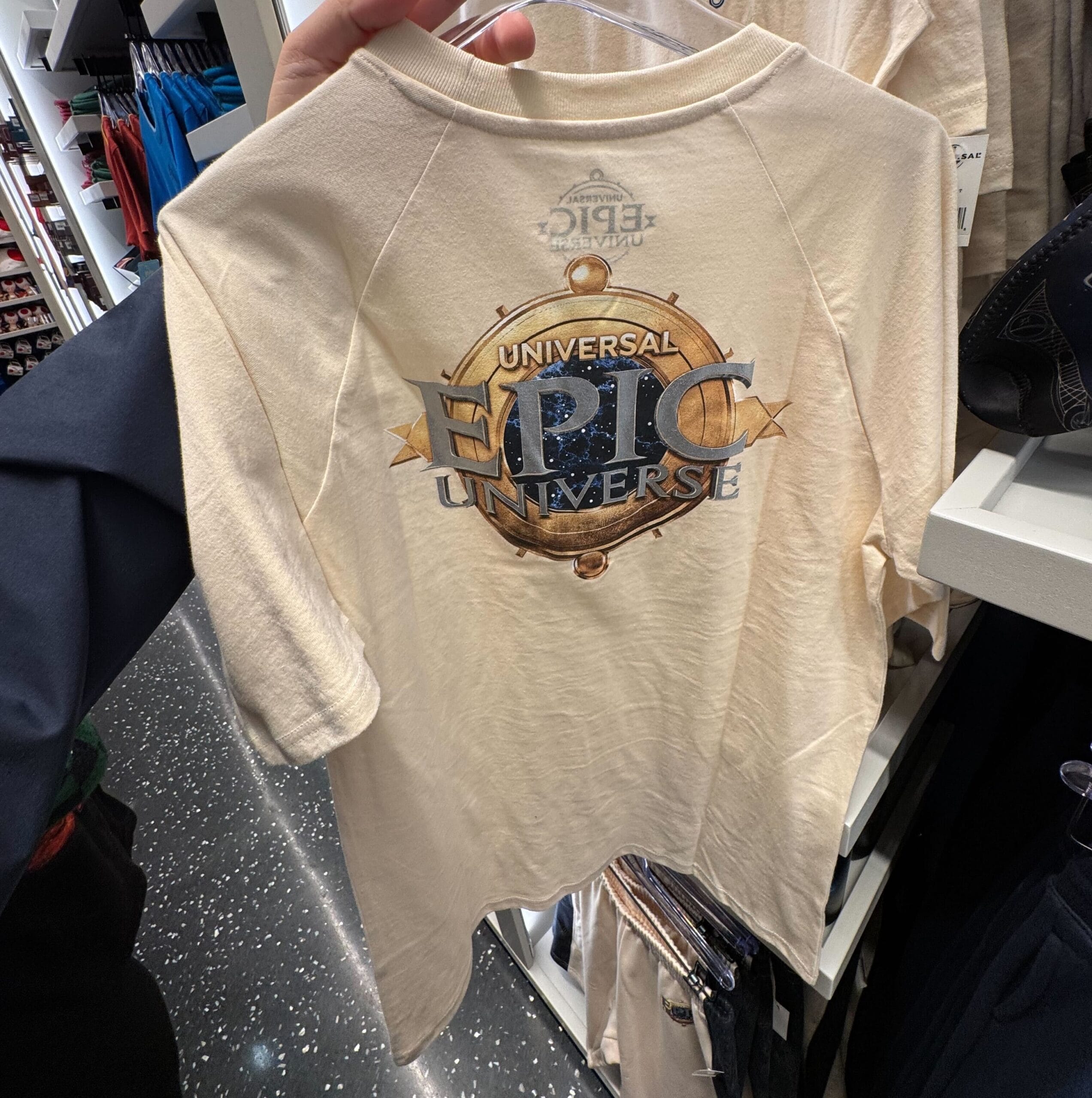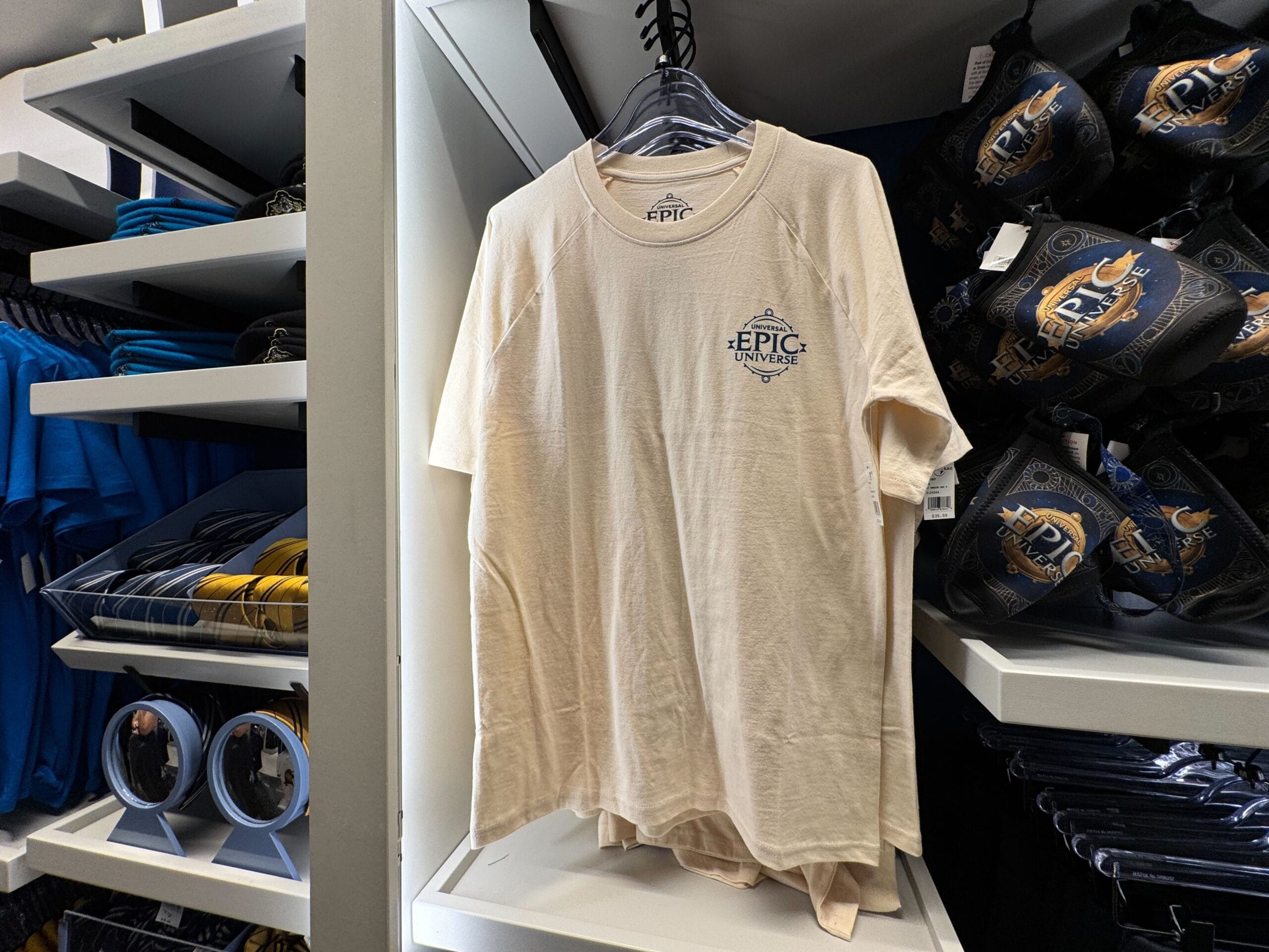 This beige tee has a minimalist version of the Epic Universe logo in blue on the left breast. The full logo is on the back.