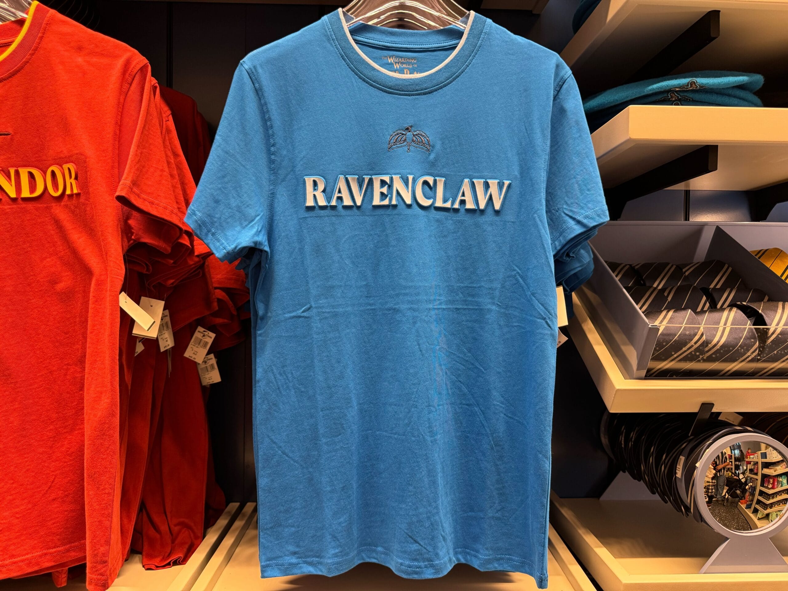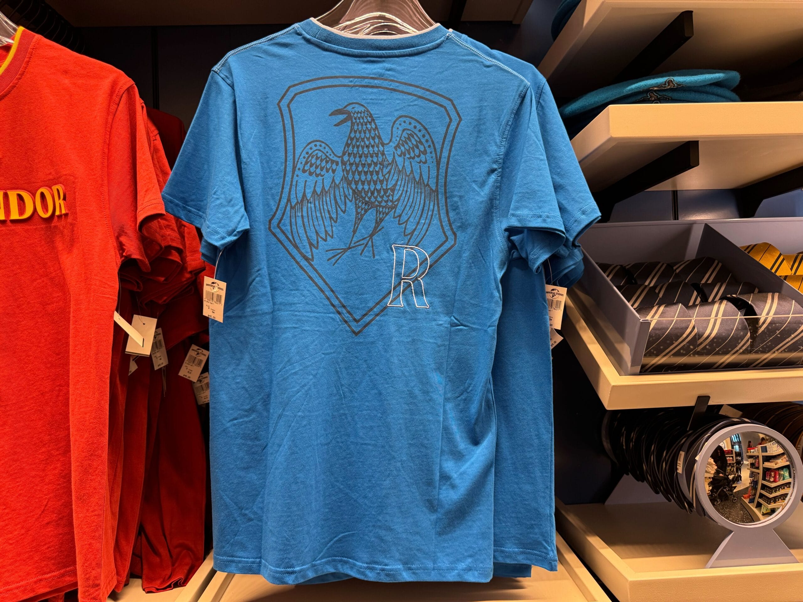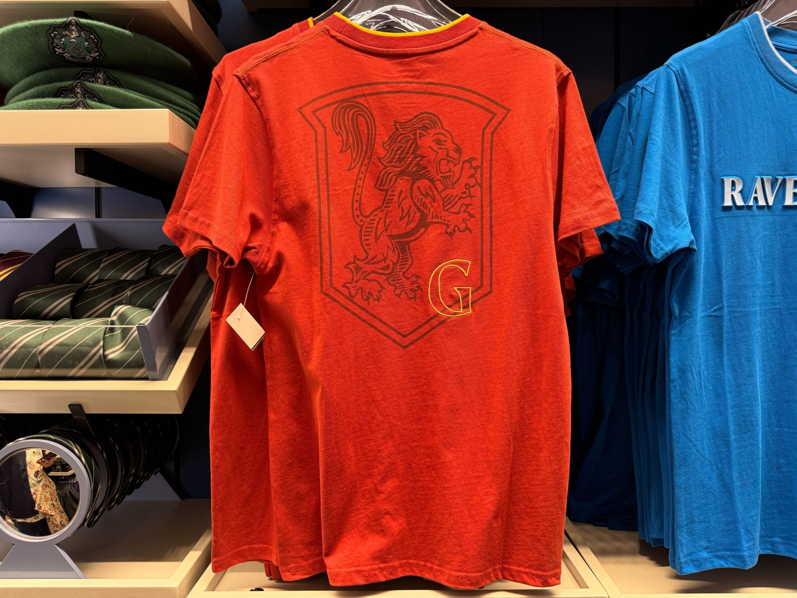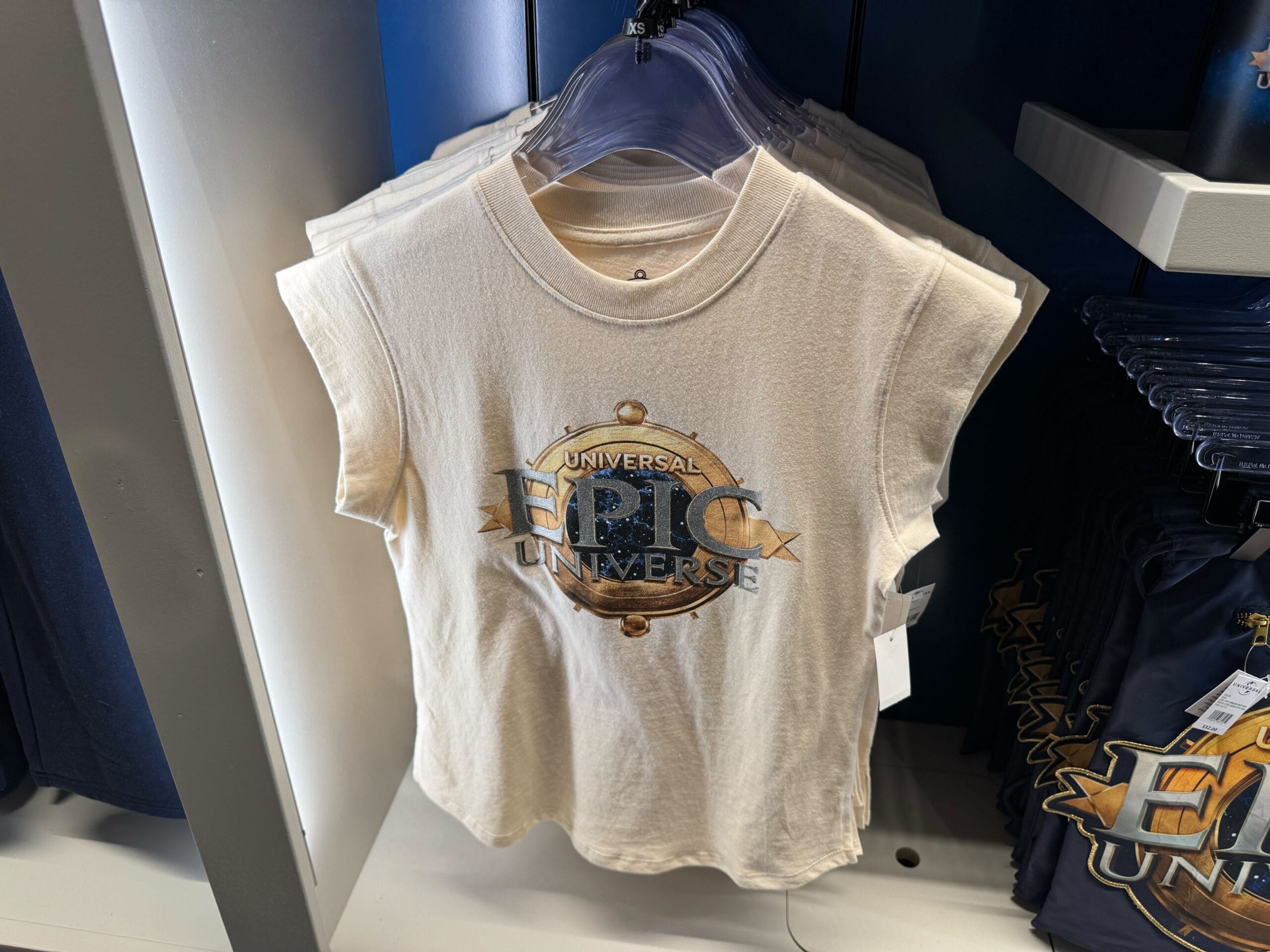 This beige tee has a minimalist version of the Epic Universe logo in blue on the left breast. The full logo is on the back.