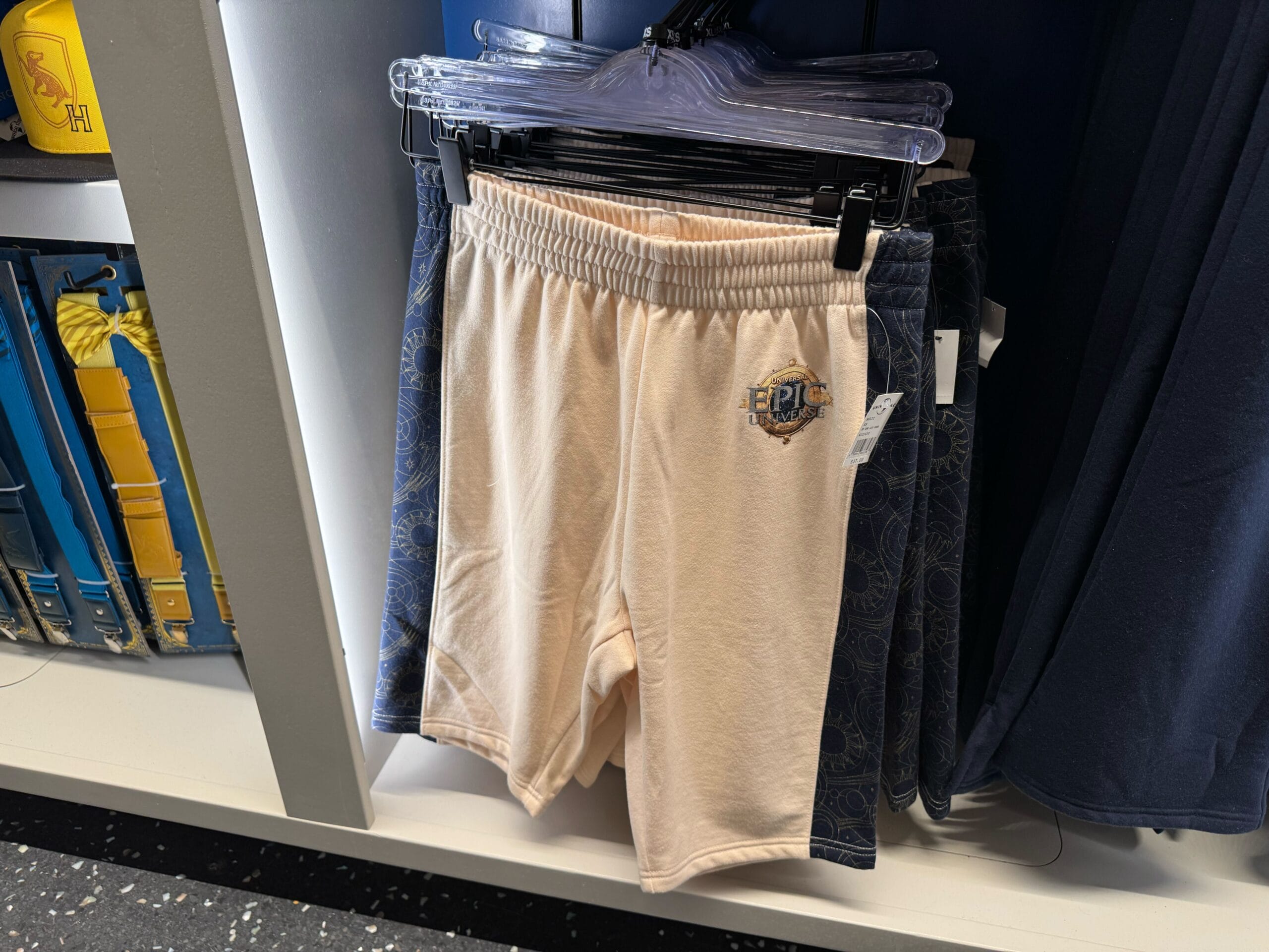 The shorts are beige with the Epic Universe logo on the left leg. Dark blue stripes down the sides feature the celestial pattern. These have an elastic waist.