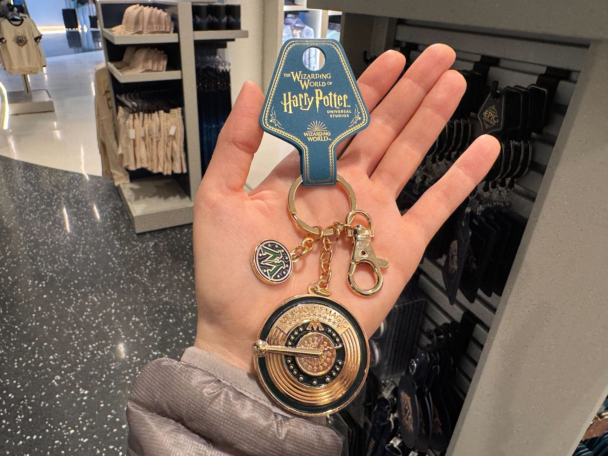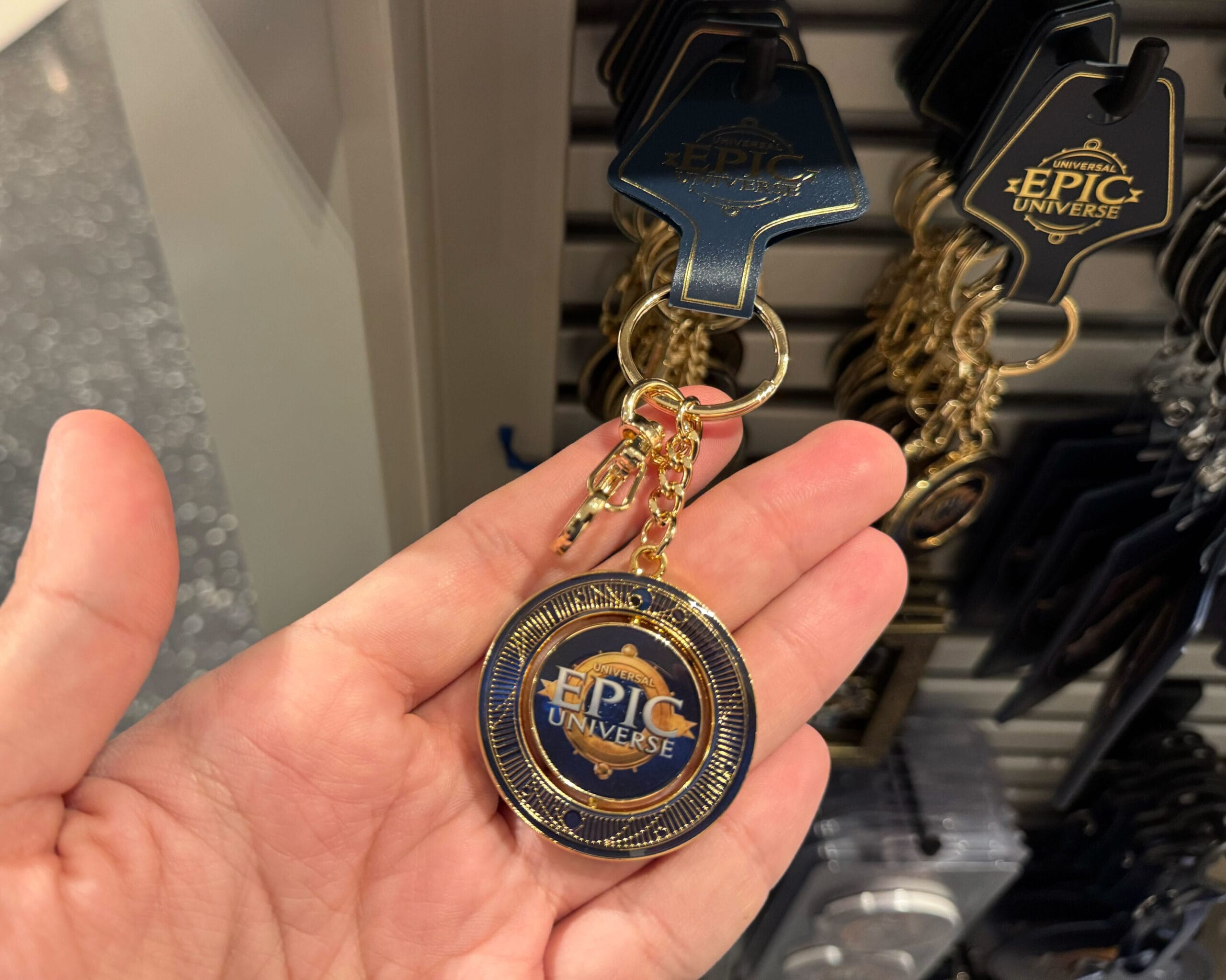 This keychain features the Epic Universe logo spinning on a medallion in a golden circle. The charm hangs from a small chain on a keyring. It also has a lobster claw clip.