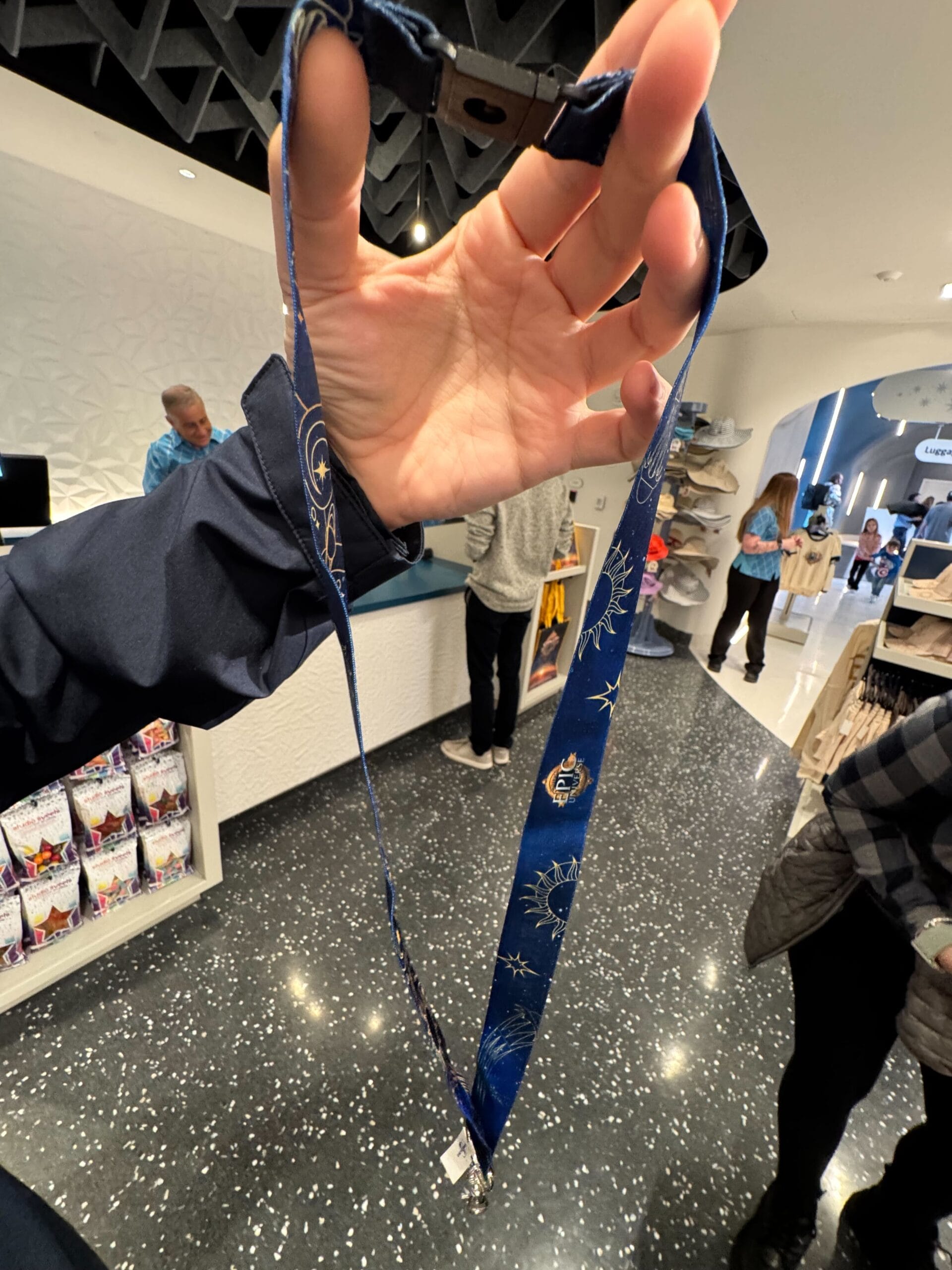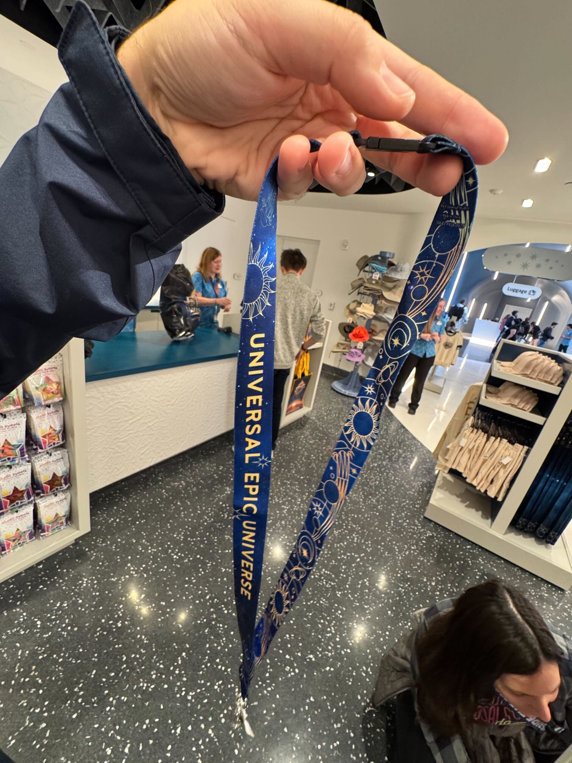 The lanyard is blue with the logo and “Universal Epic Universe” in yellow-gold lettering. The rest of the lanyard is patterned with celestial objects.