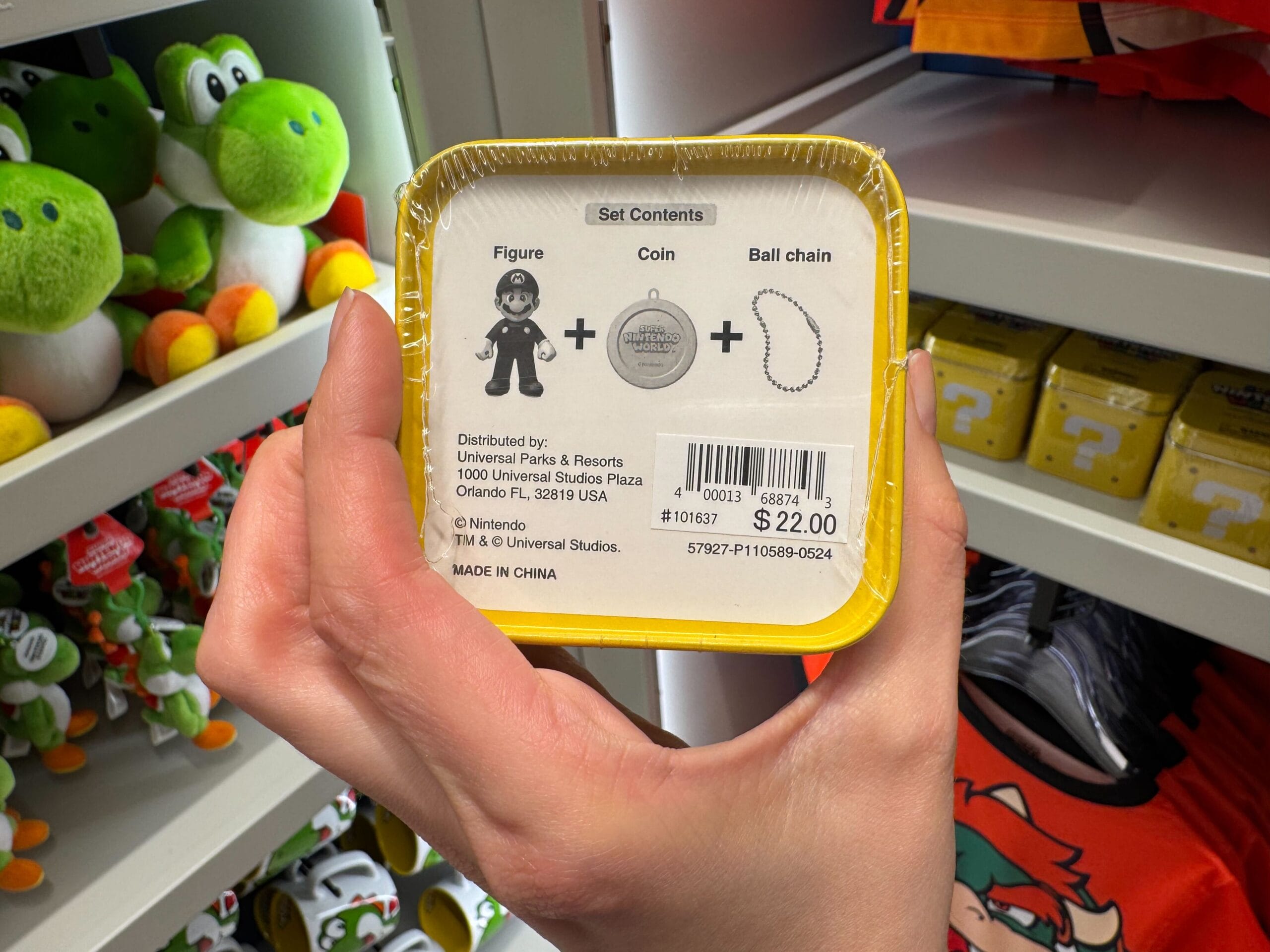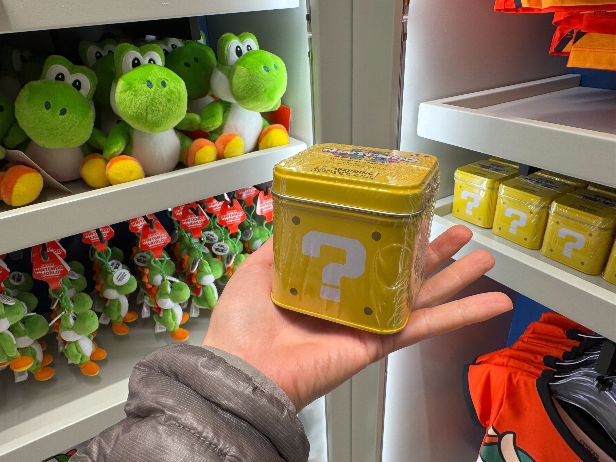 This yellow tin resembles a ? block. It has the Super Nintendo World logo on the lid.