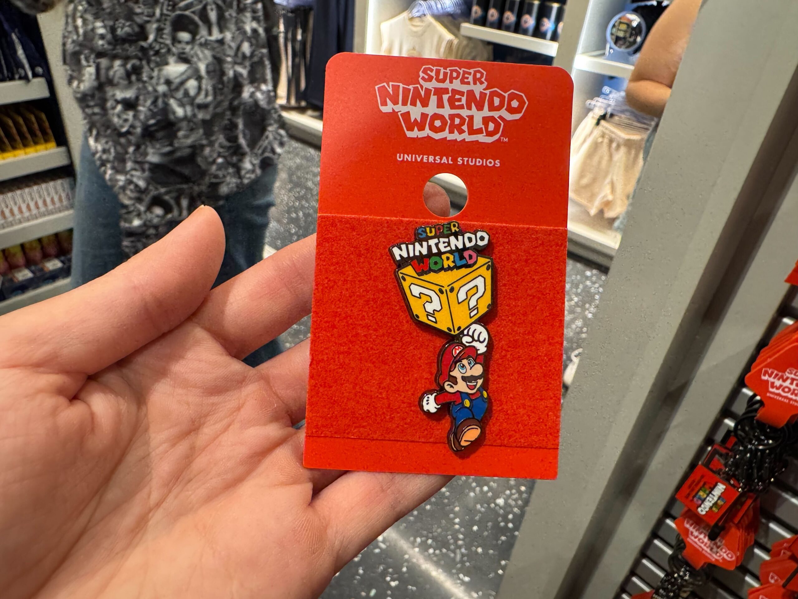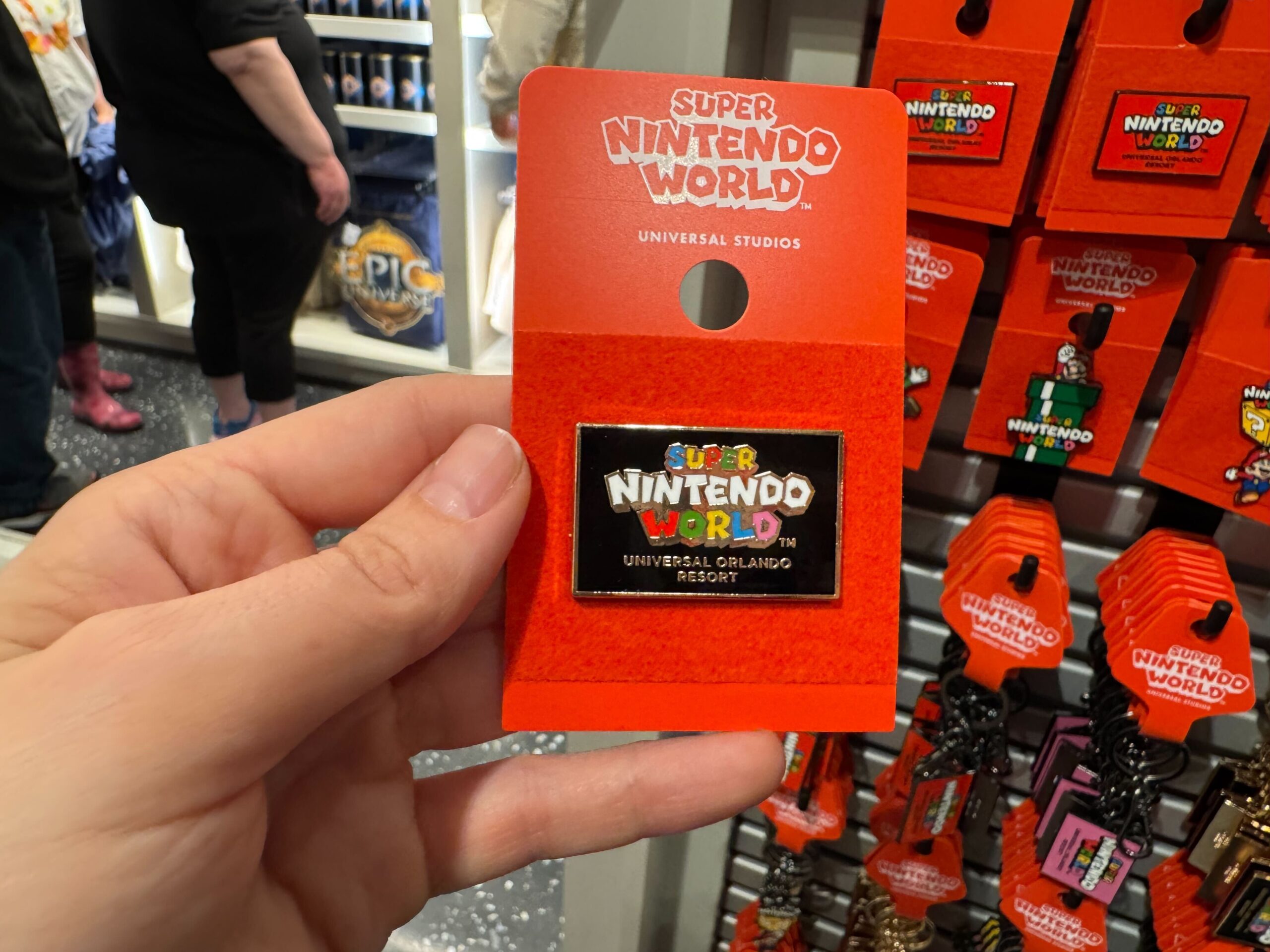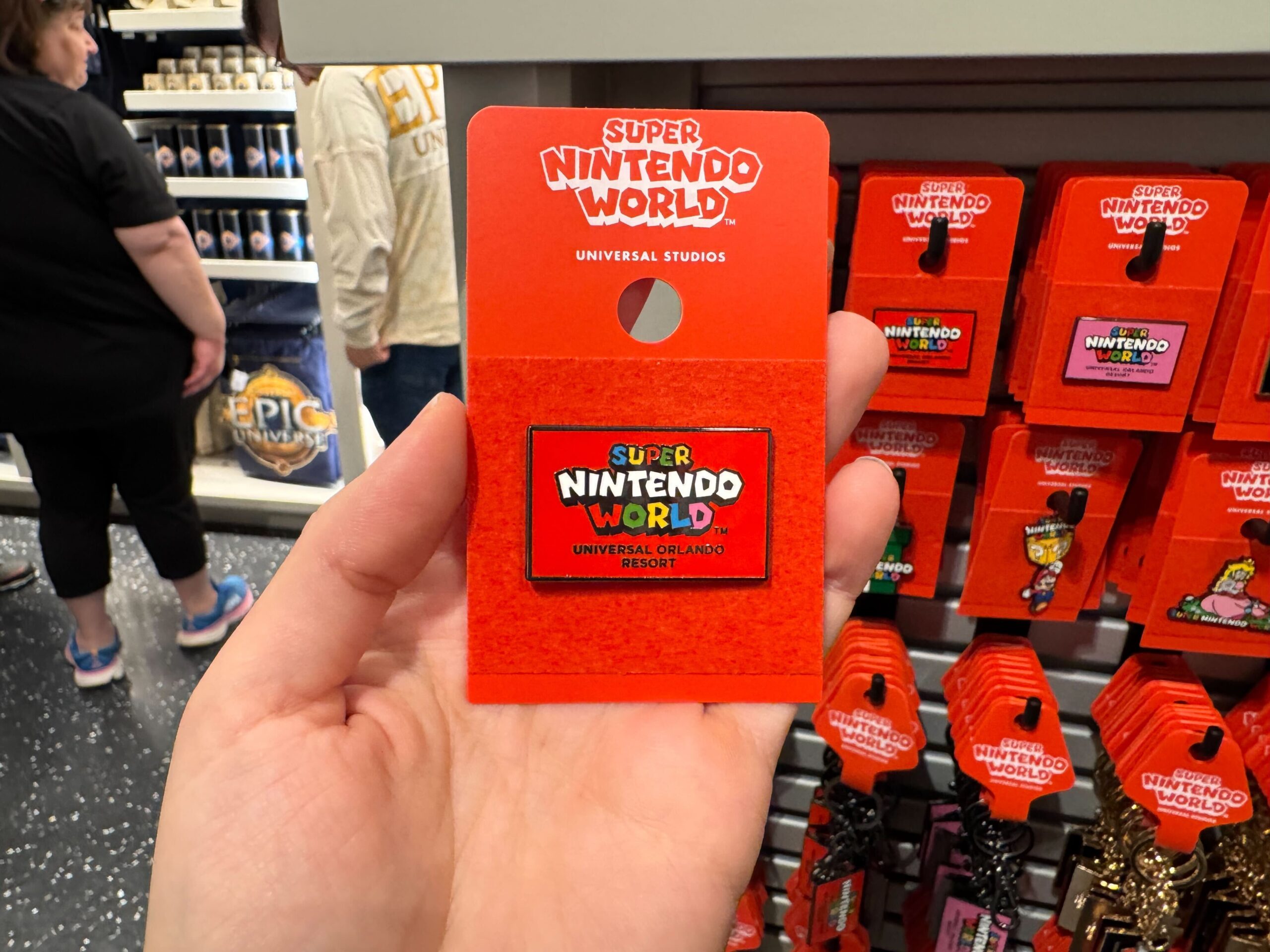 These pins are rectangular with the Super Nintendo World logo in the center and “Universal Orlando Resort” in black. The first pin has a red background.
