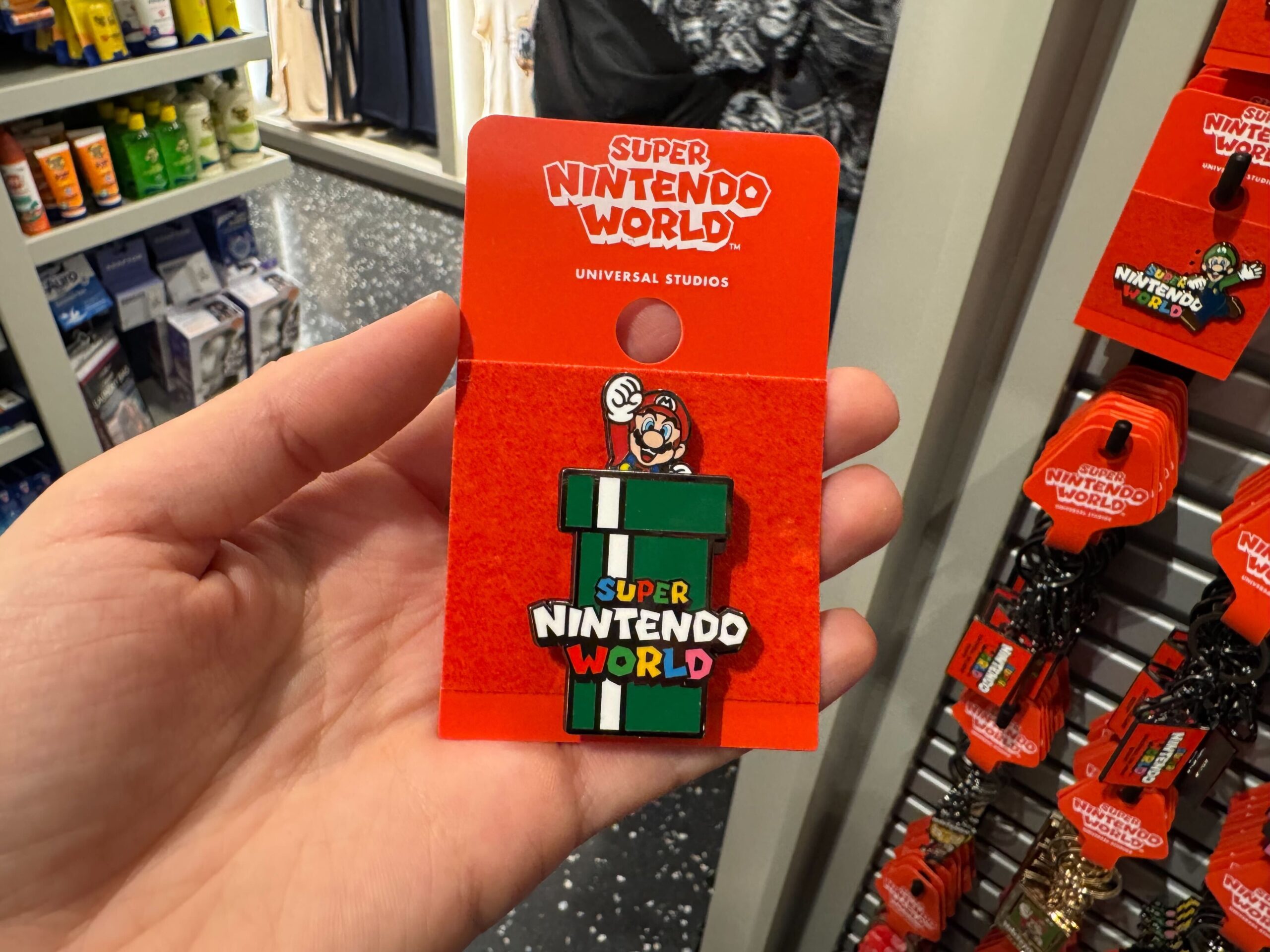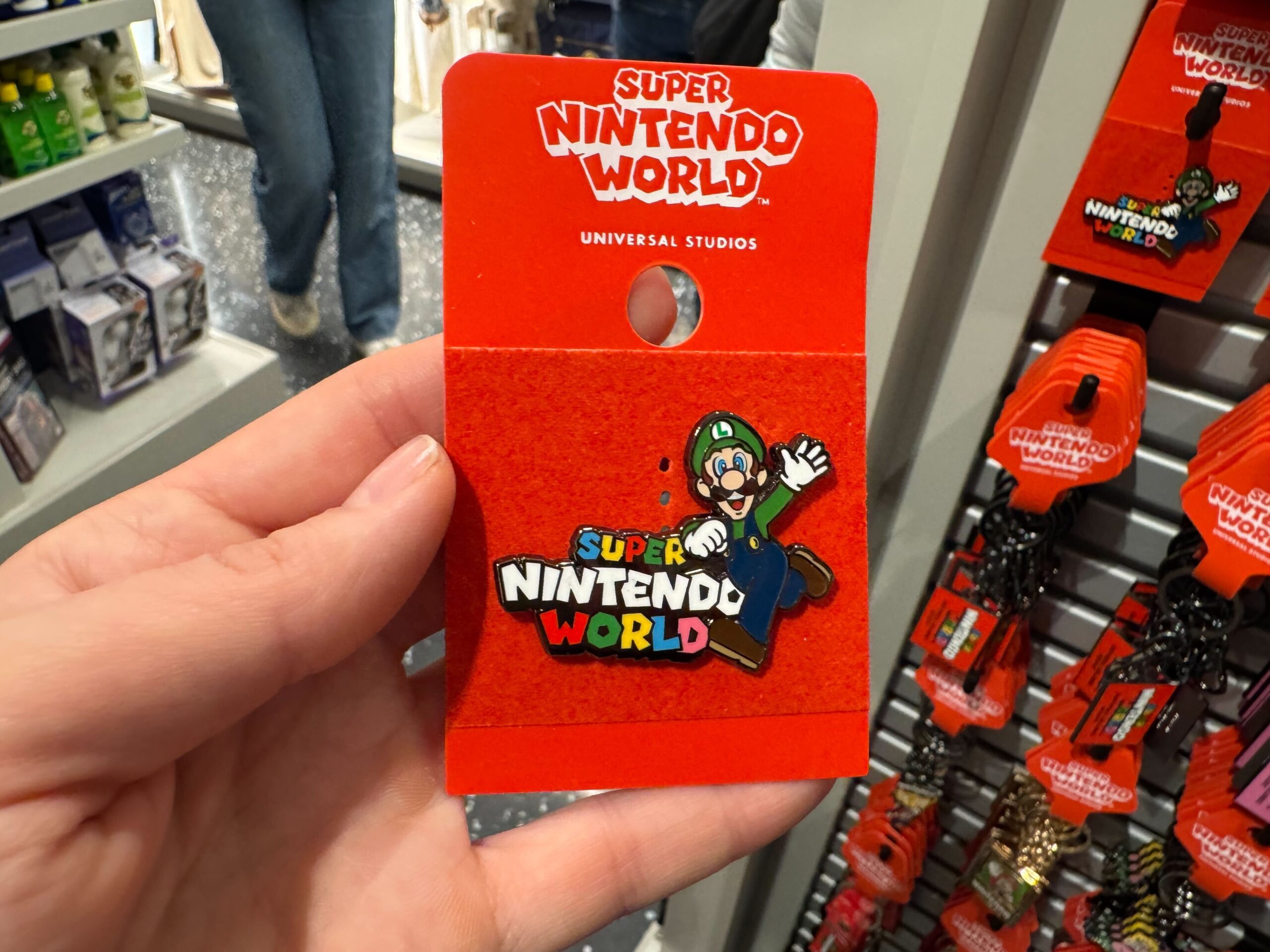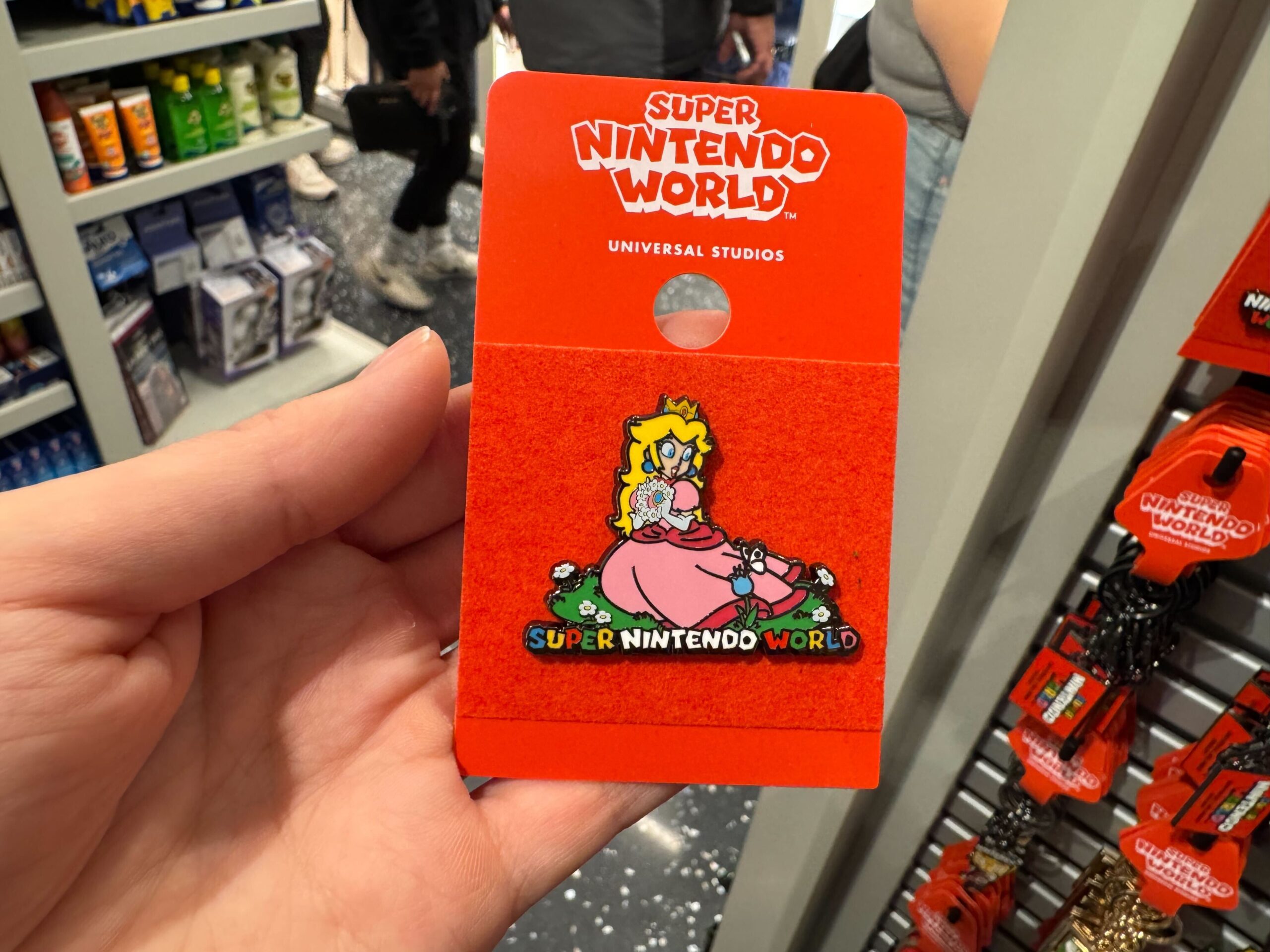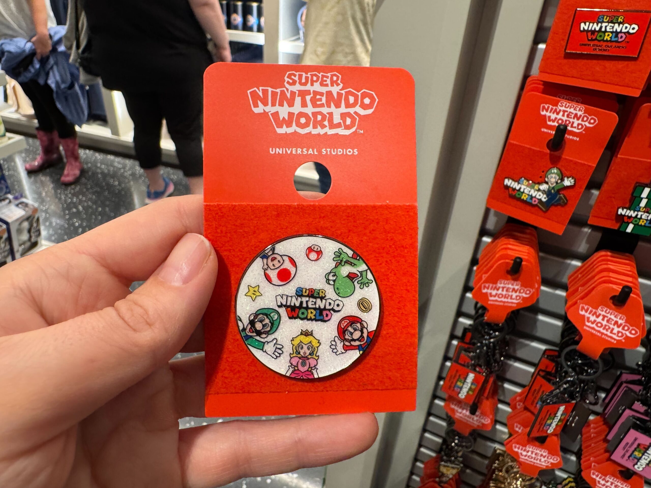 These pins are rectangular with the Super Nintendo World logo in the center and “Universal Orlando Resort” in black. The first pin has a red background.