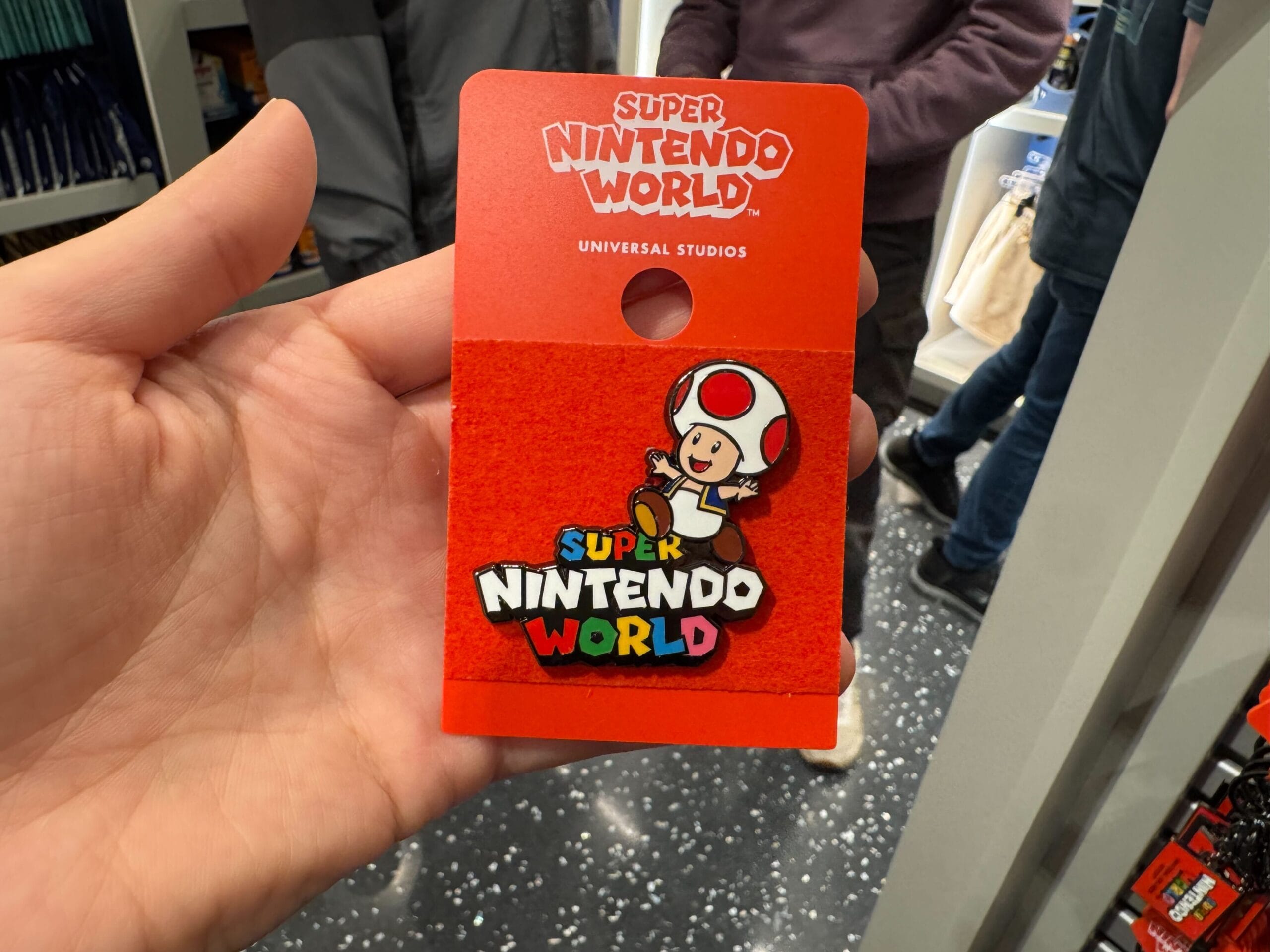 Toad is pictured alongside the Super Nintendo World logo on this pin.