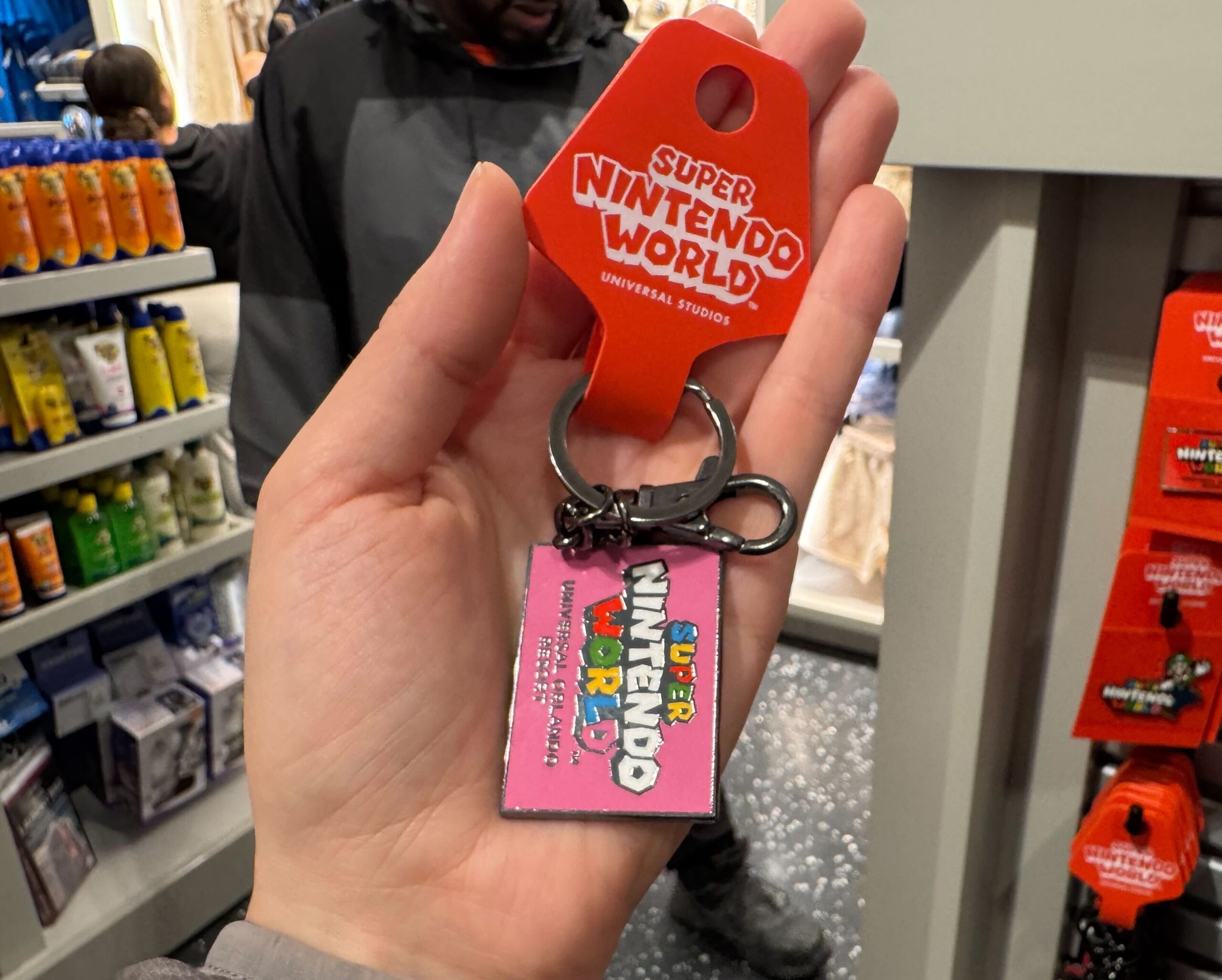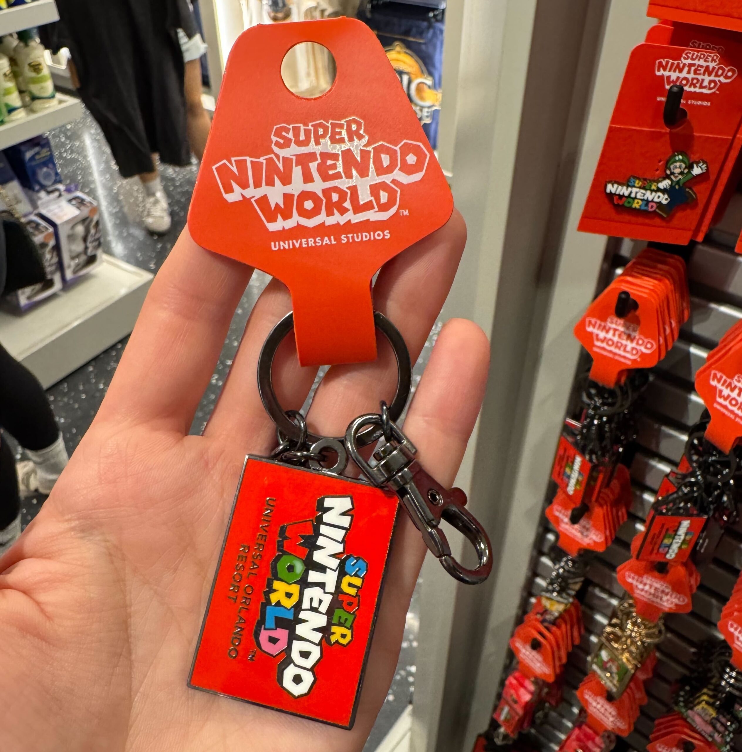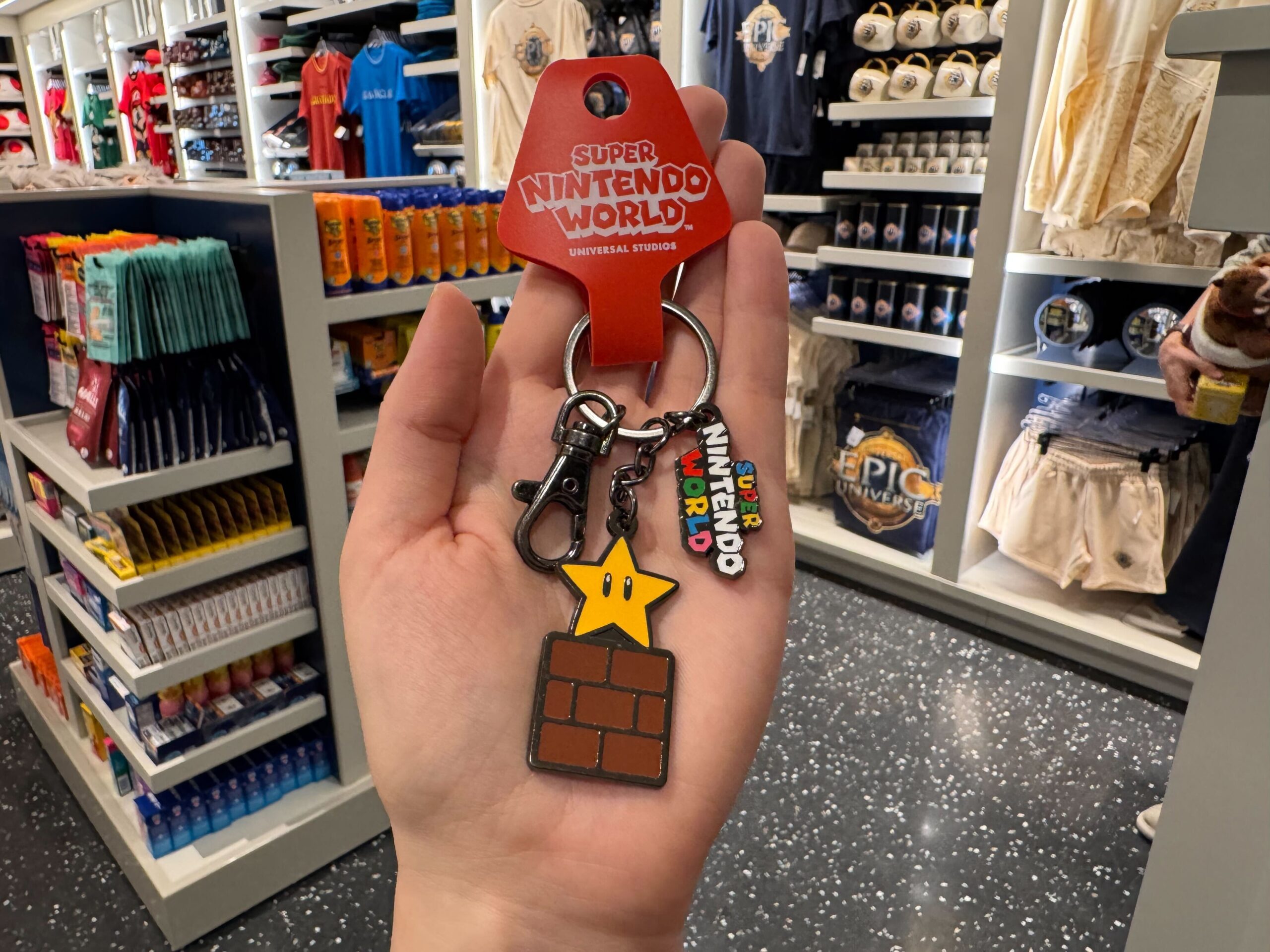 This keychain has two charms. One depicts a Super Star atop a brown brick block. The other is the Super Nintendo World logo.