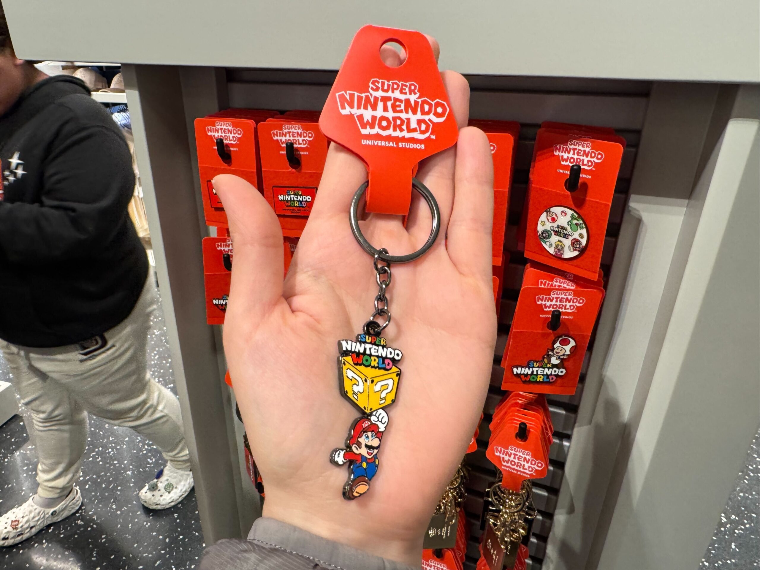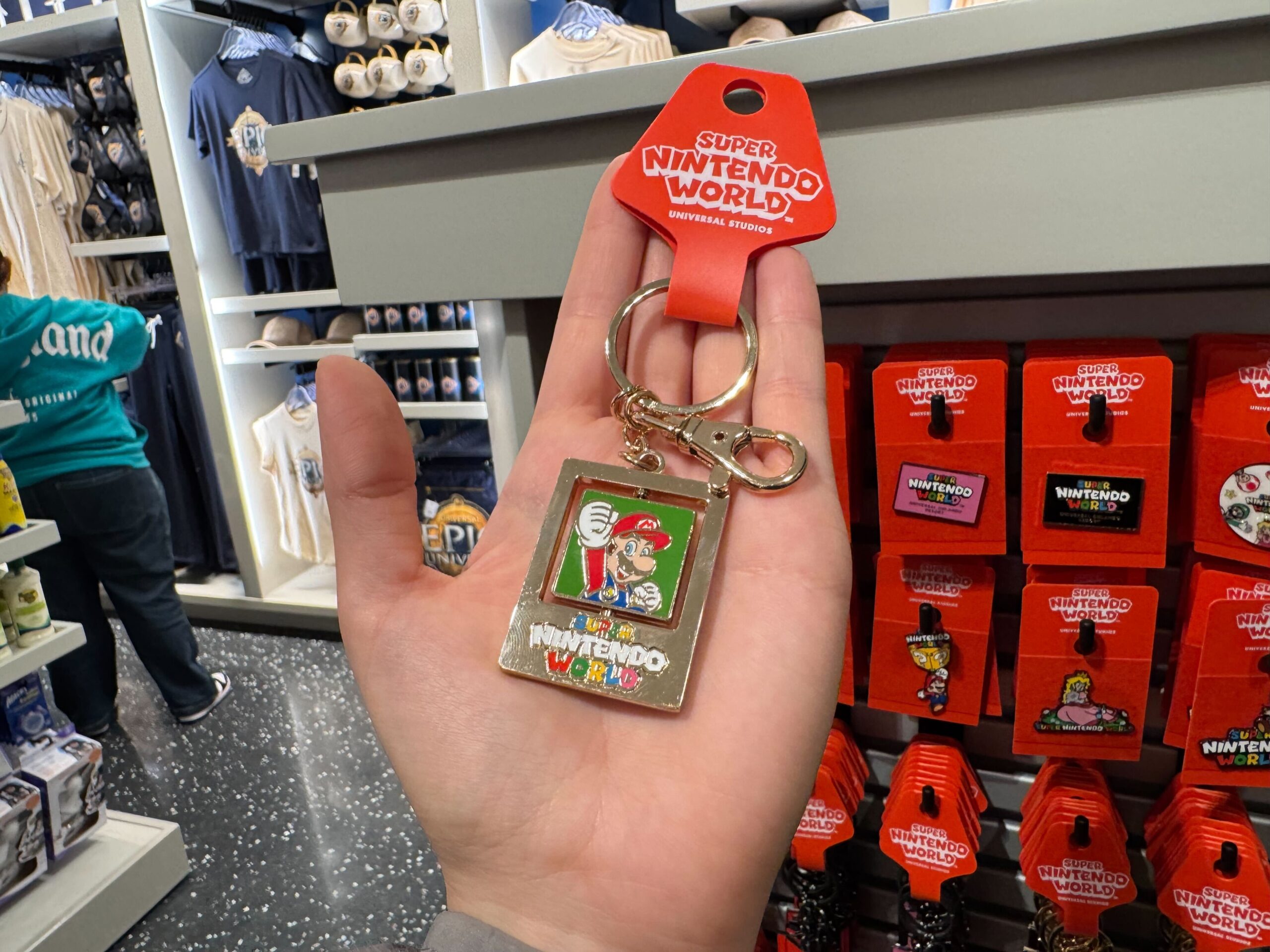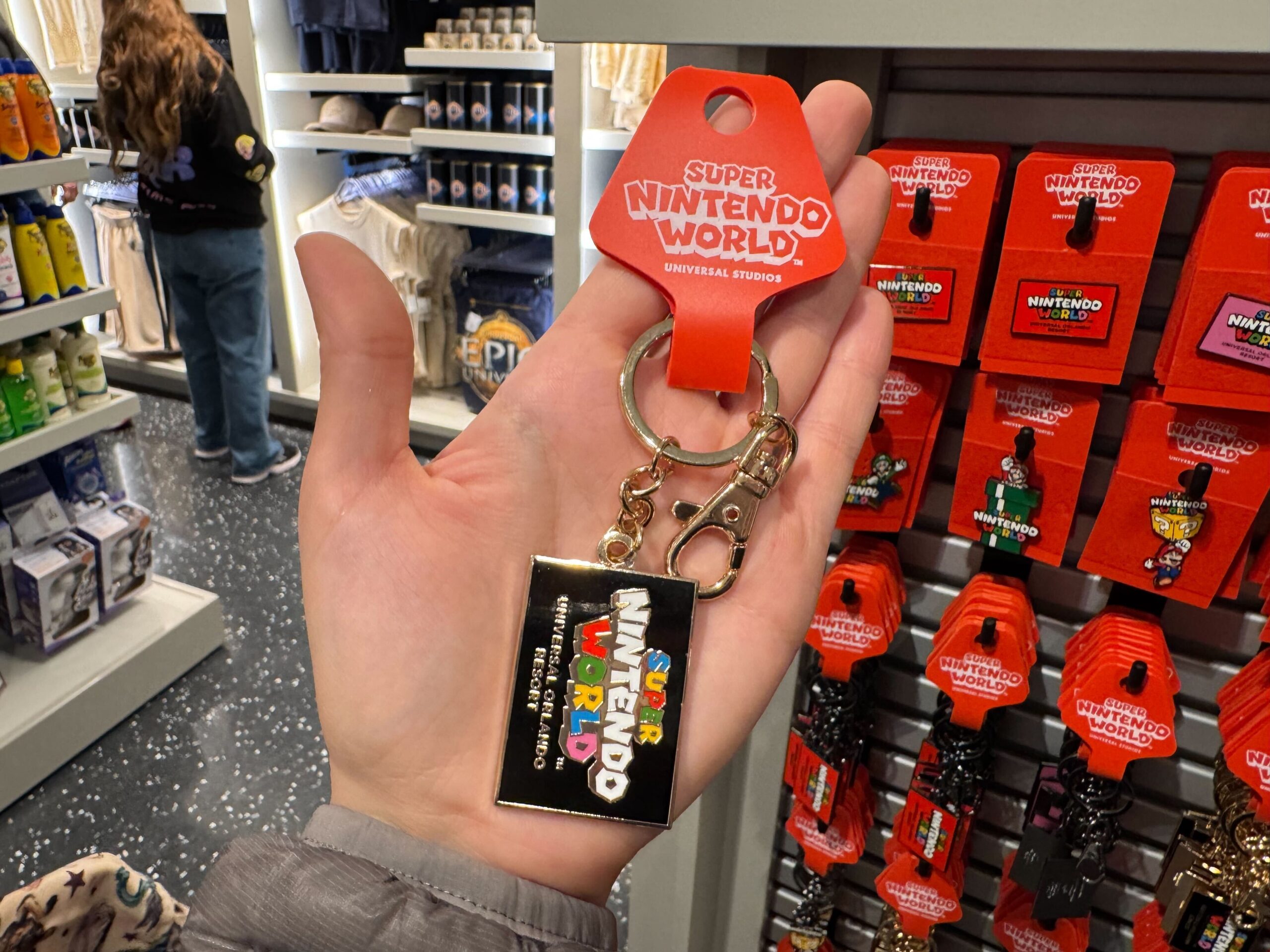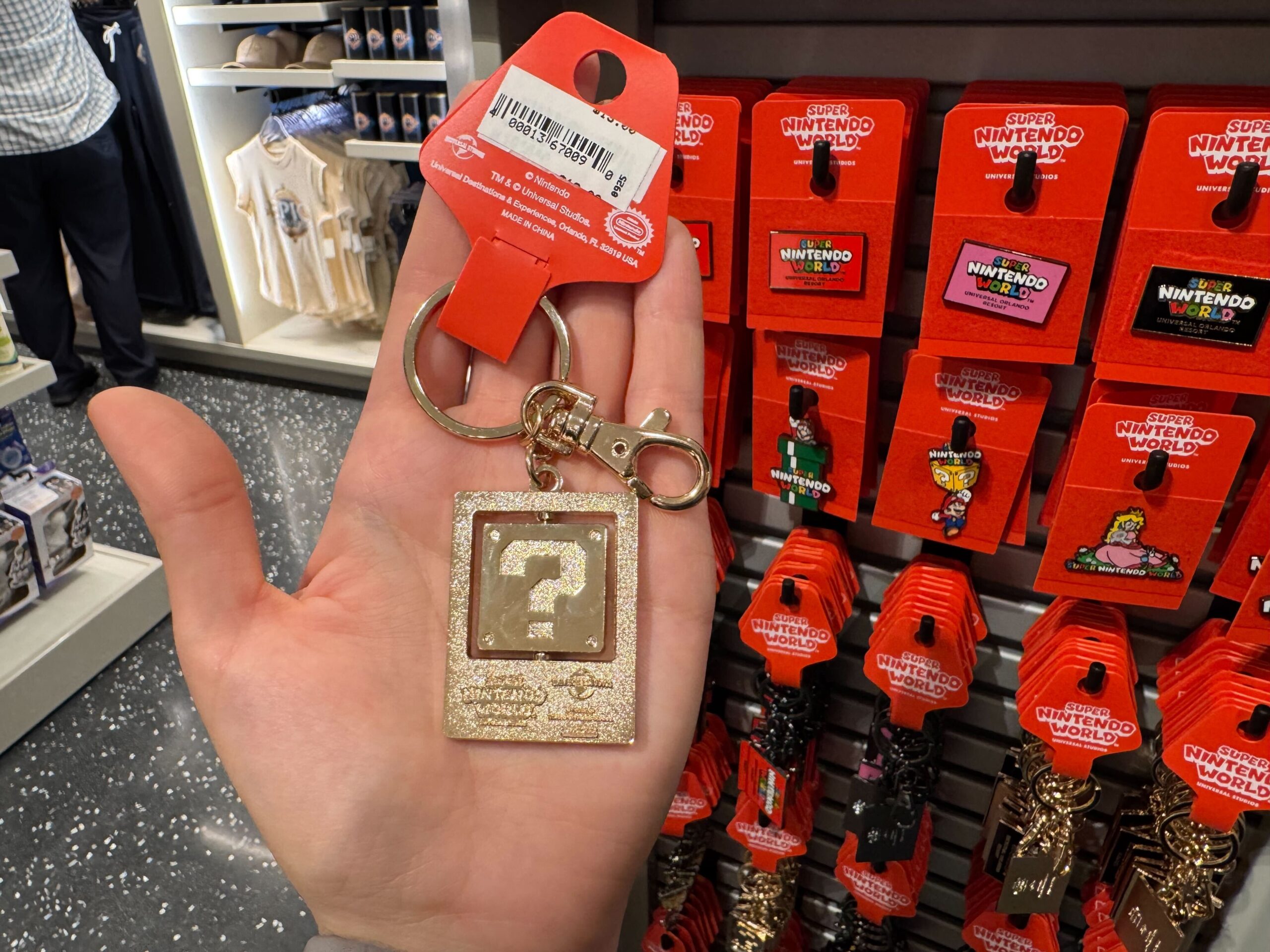 The other side of the spinner features a question mark. The back of each keychain has the Super Nintendo World and Universal Orlando Resort logos.