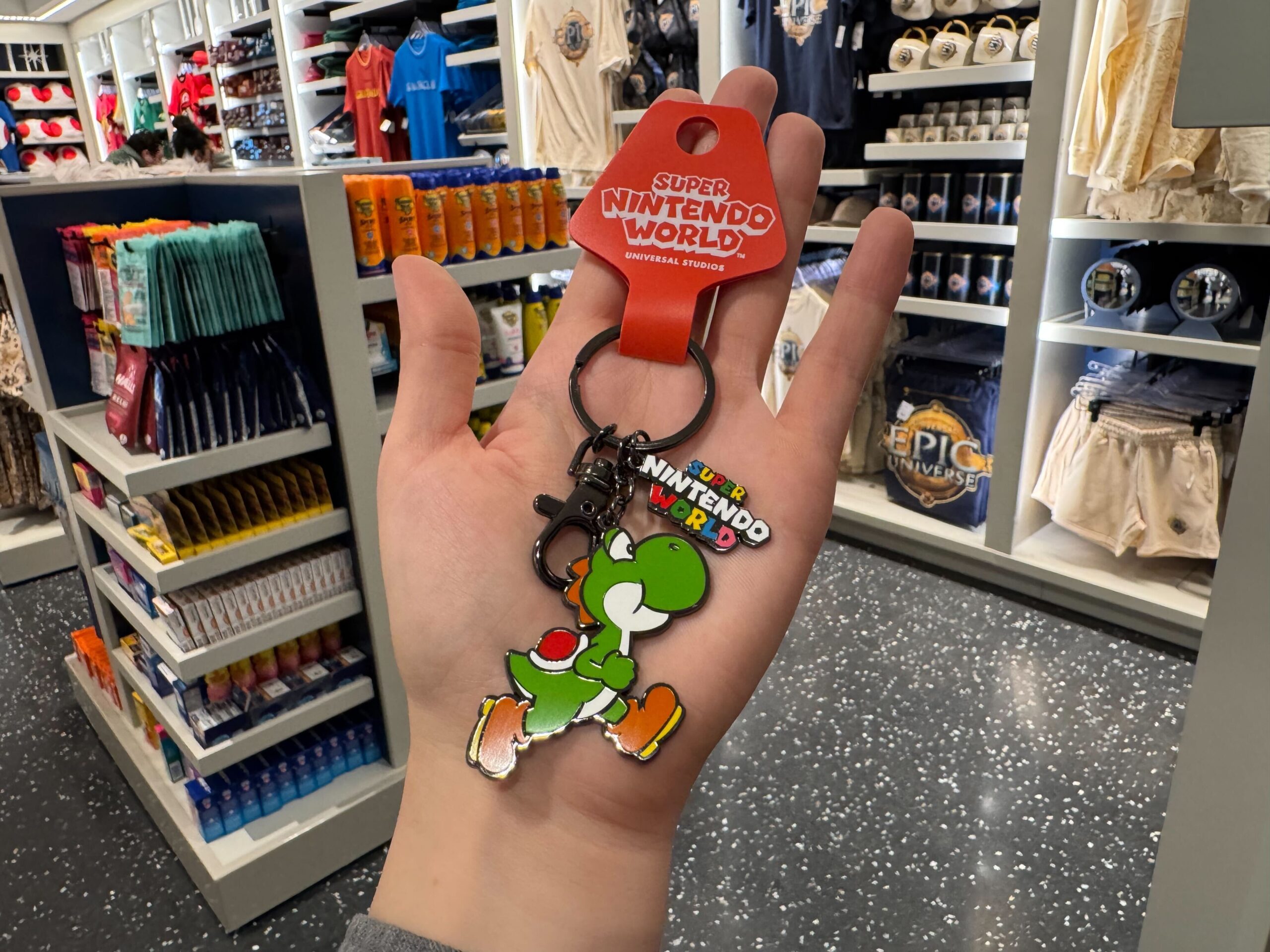 Yoshi is pictured running on one of this keychain’s charms. The other charm is the land logo.