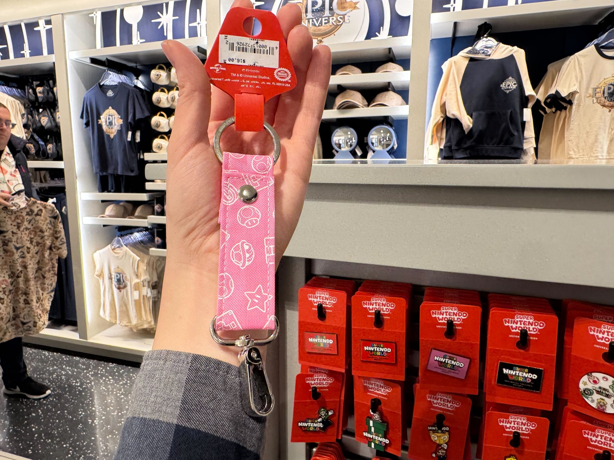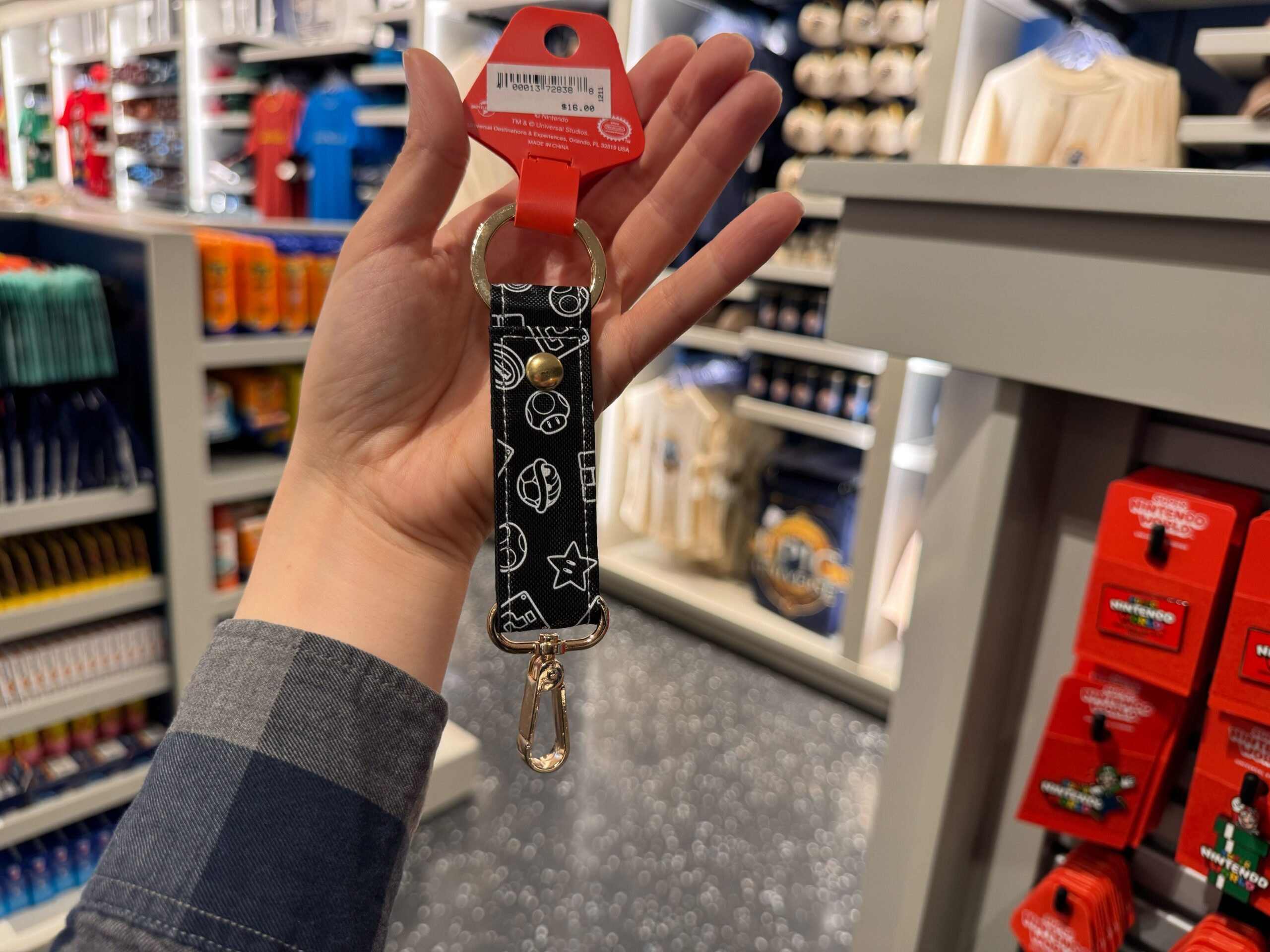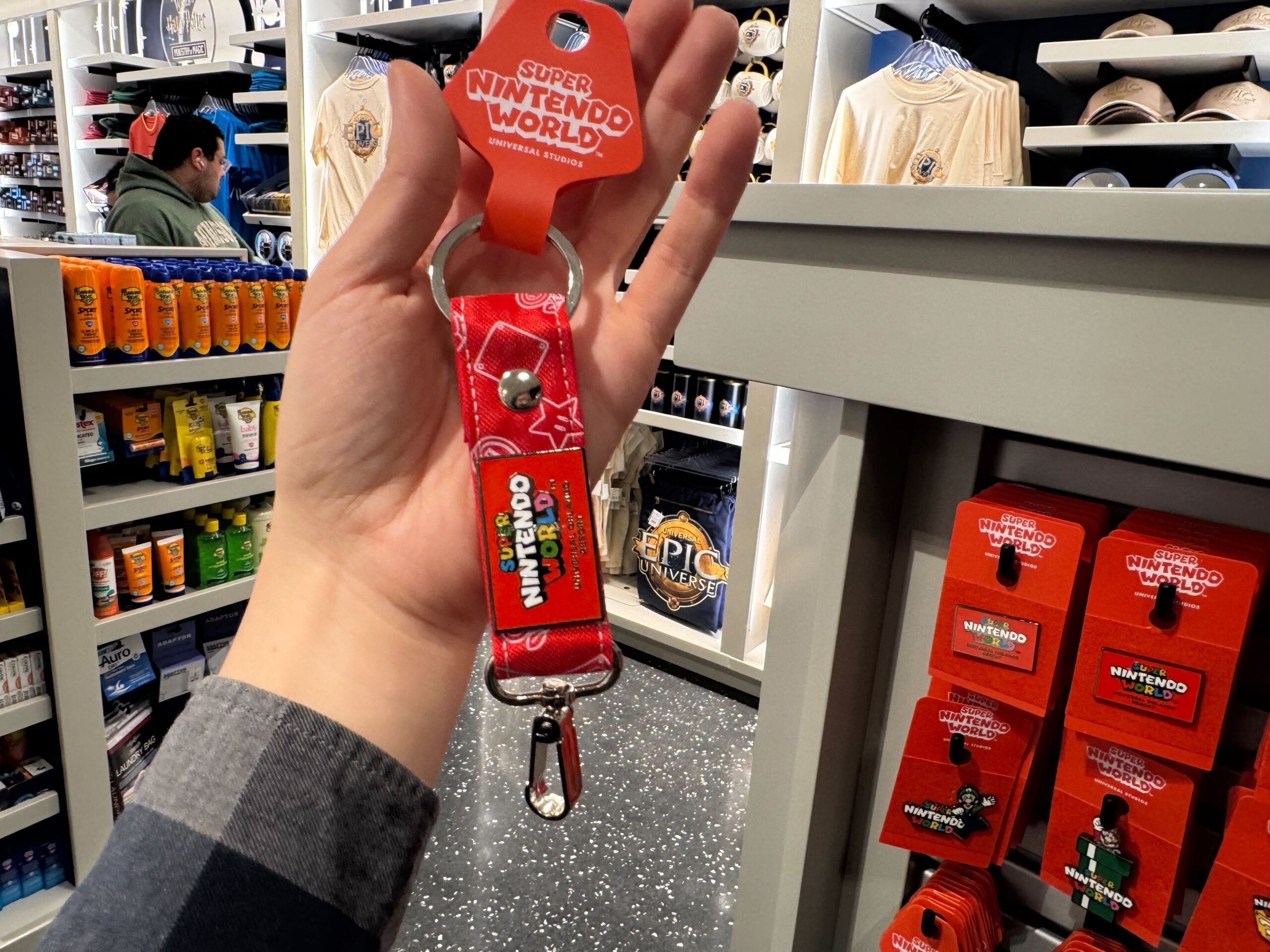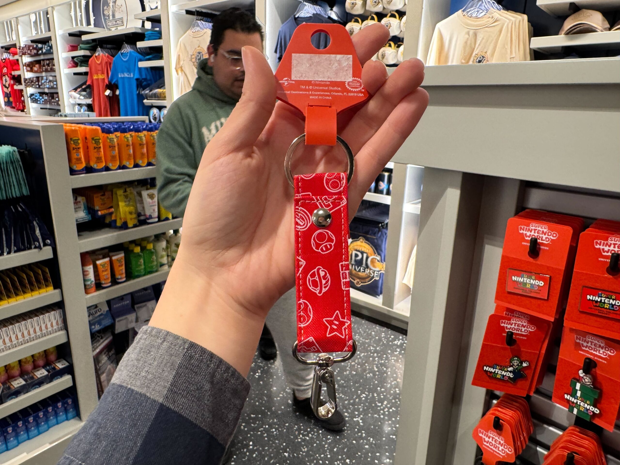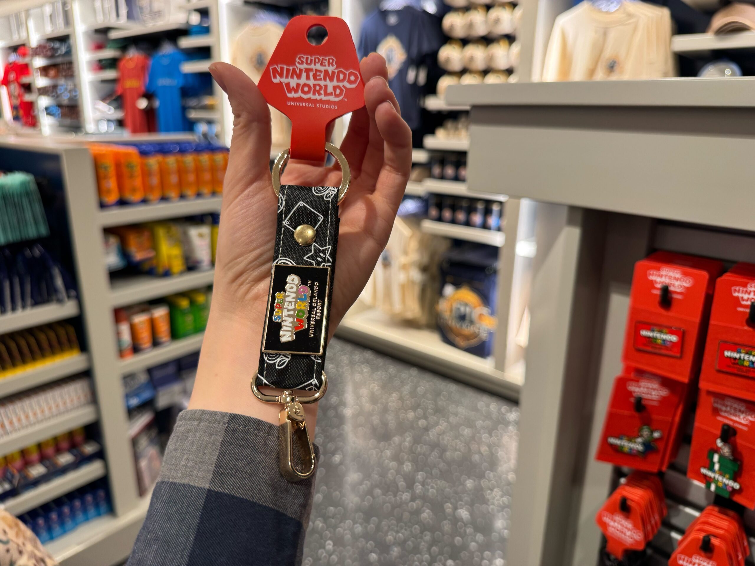These straps come on keyrings with lobster claw clips on the other end. This strap is red with a white pattern of Nintendo iconography. A metal Super Nintendo World label is on one side.