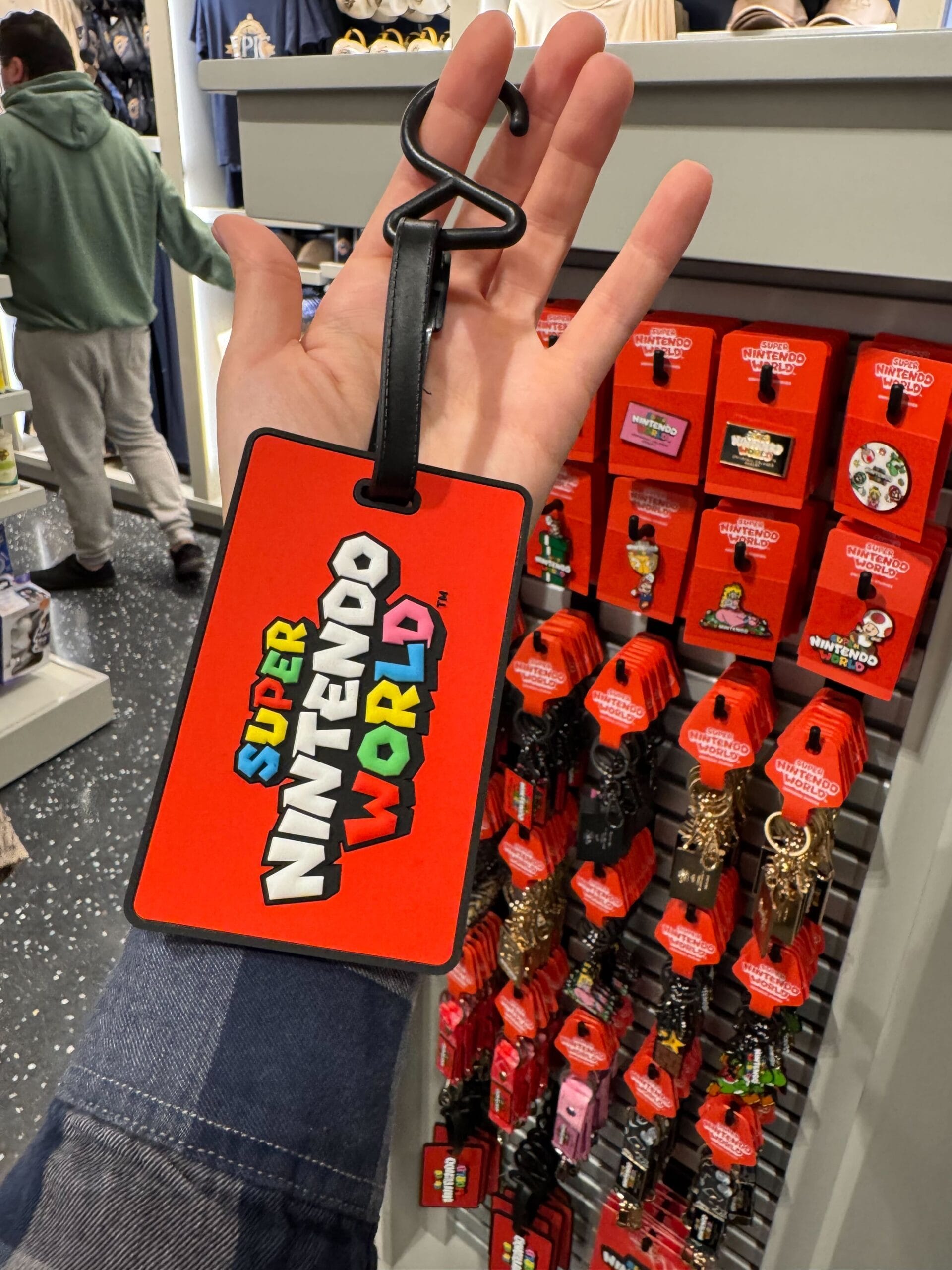 The luggage tag is red with a black strap and edges. The Super Nintendo World logo is on the red side. The back has a clear window showing the contact information paper.