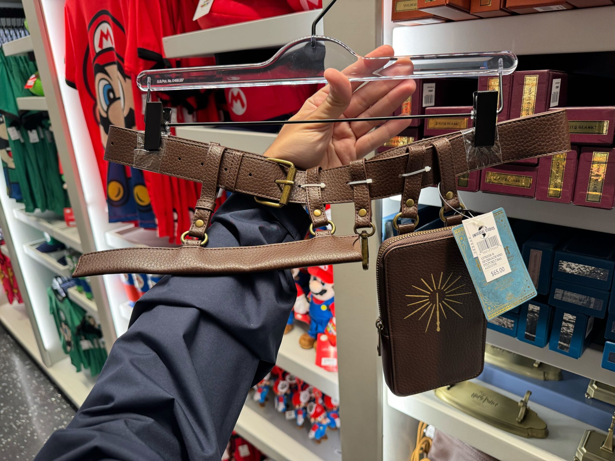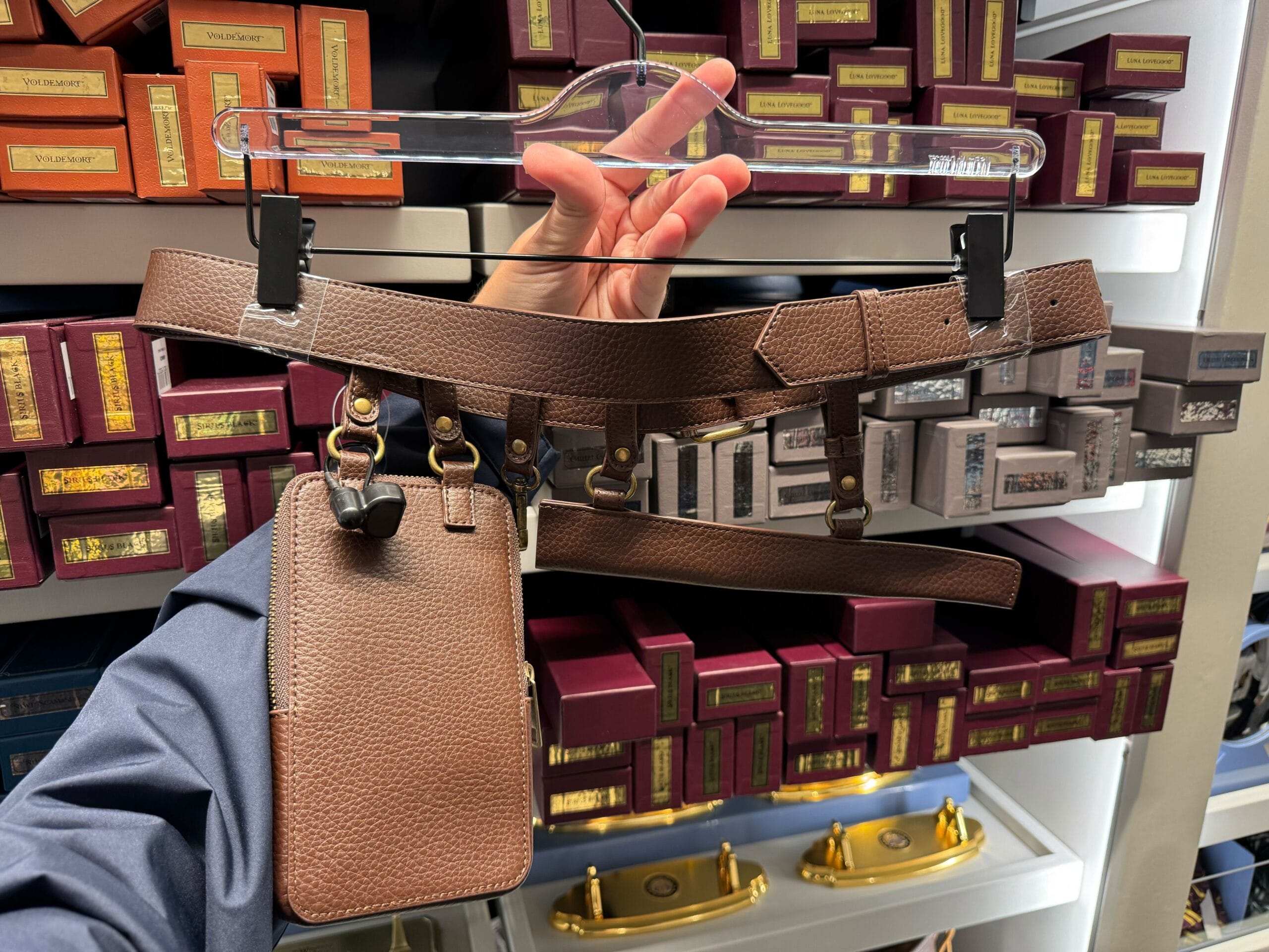 This brown belt includes a dangling wand holster and a zipper pouch. A golden wand symbol is on the zipper pouch. This appears to be the logo for Cosme Acajor Baguettes Magique, the land’s wand shop.