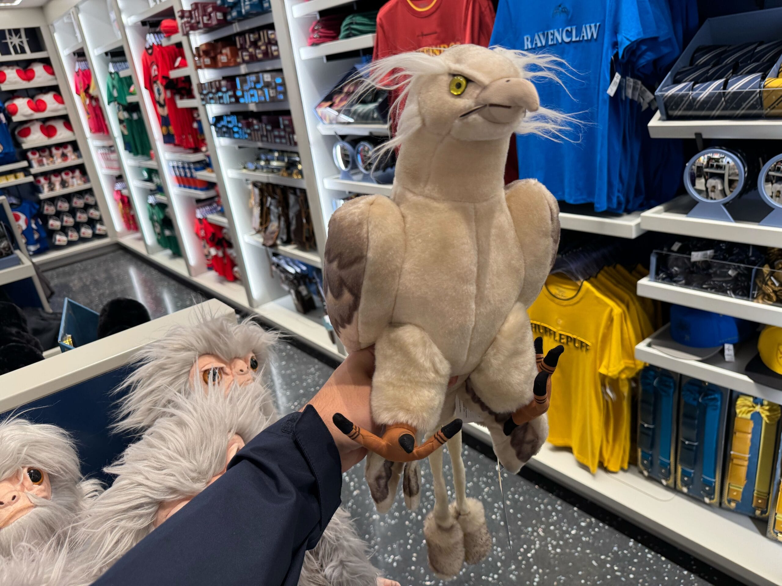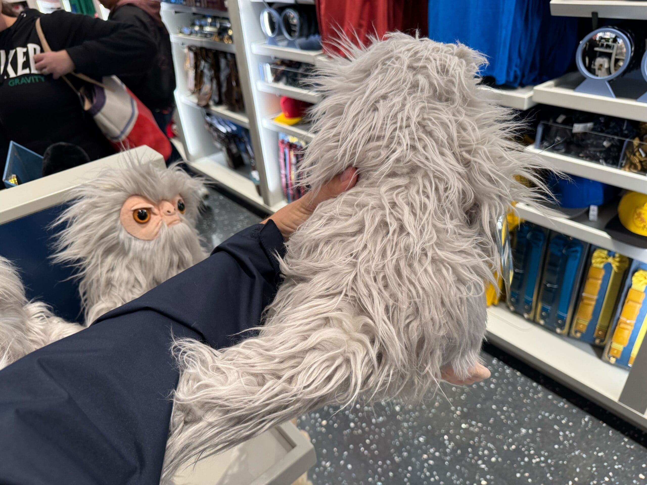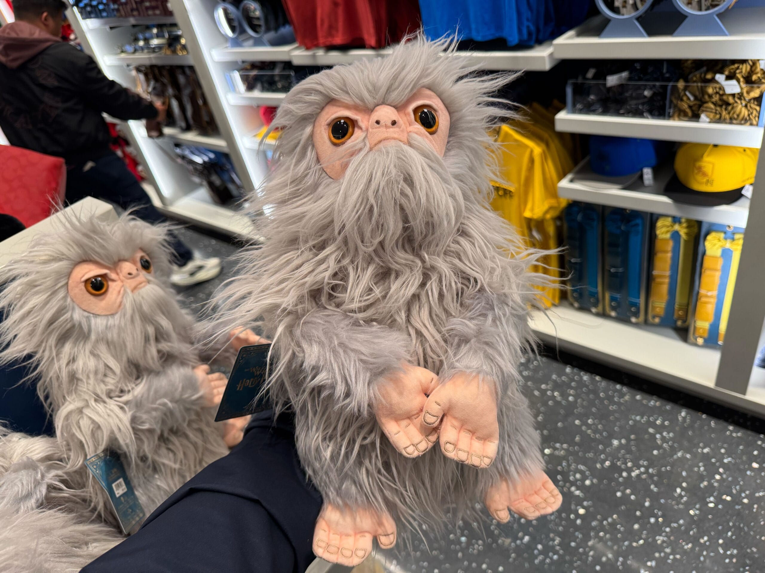 Another famous creature is the Demiguise, which is capable of turning invisible. This Demiguise plush won’t disappear on you, though. It has long light gray fur. Its face, hands, and feet are tan. It has yellow eyes.