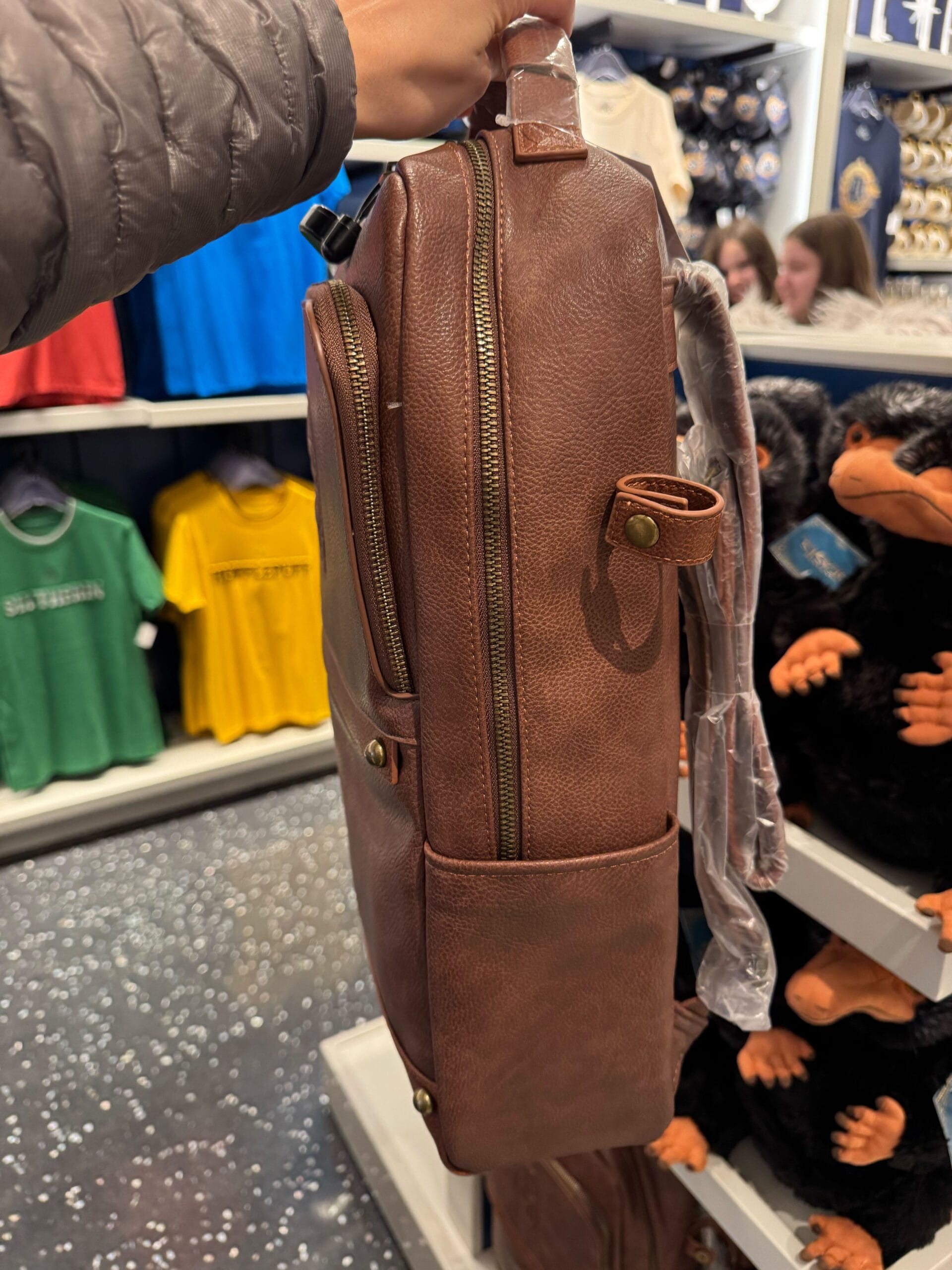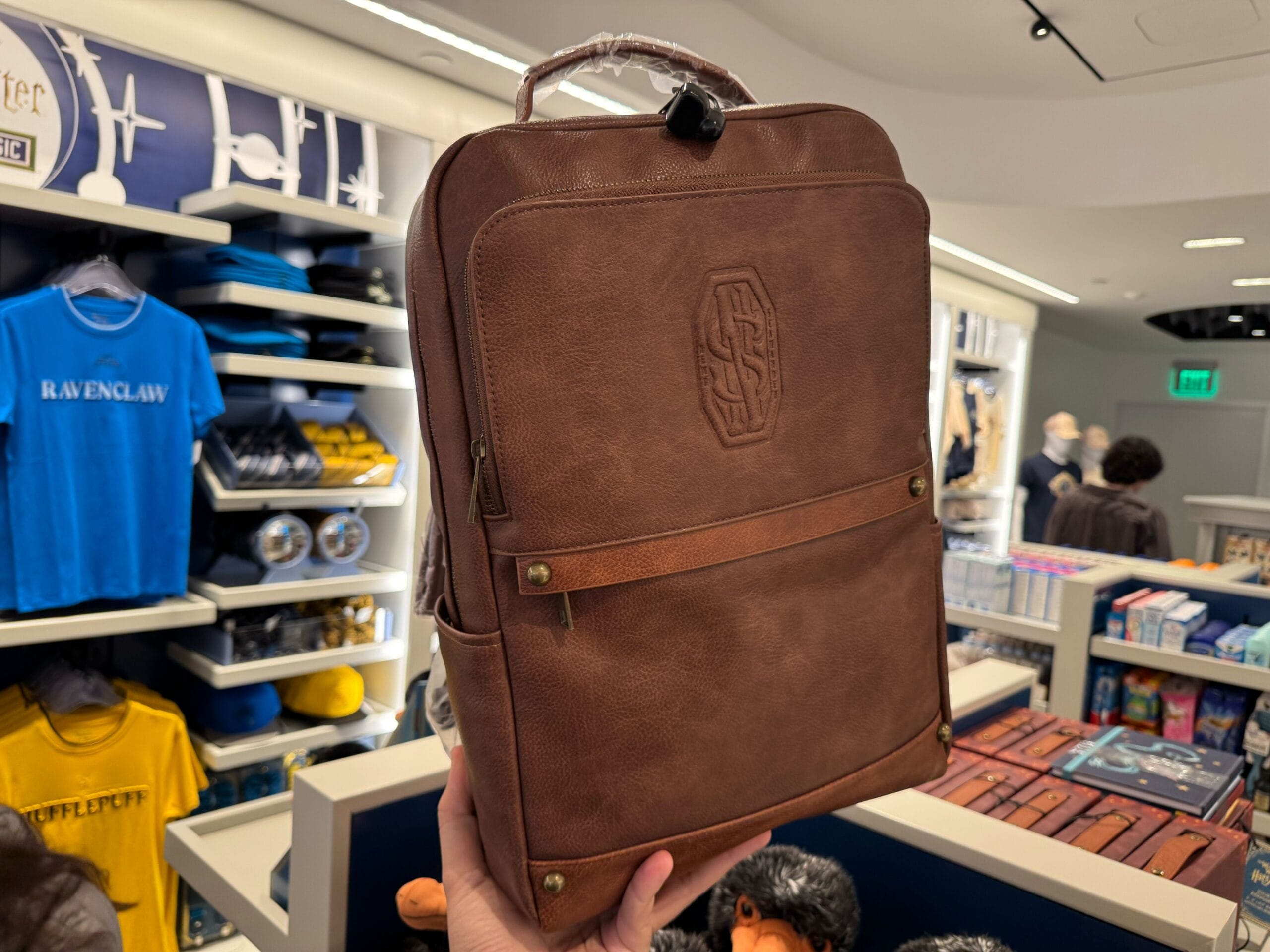 This brown pleather backpack features Newt Scamander’s “NS” monogram on the front. It has bronze hardware, including the zippers. There are two small front zip pockets.