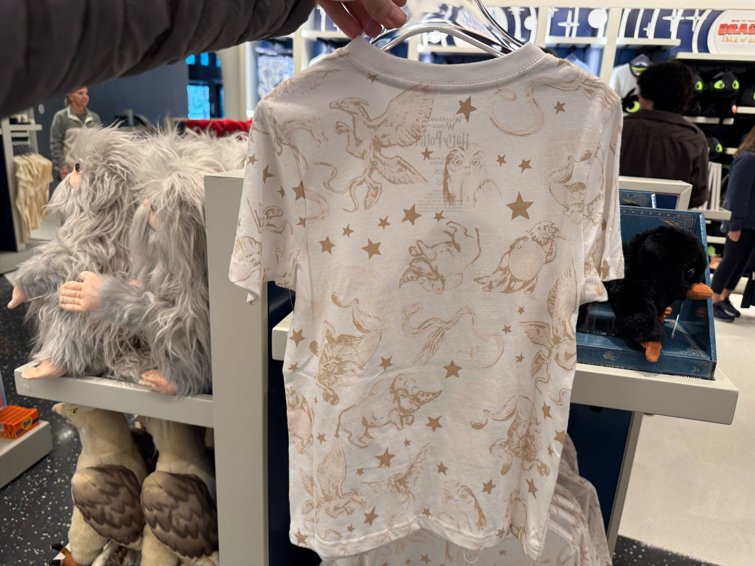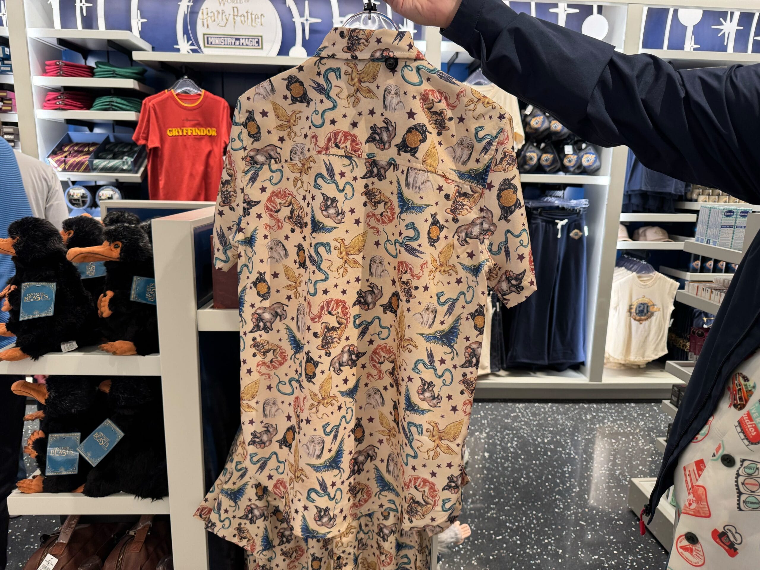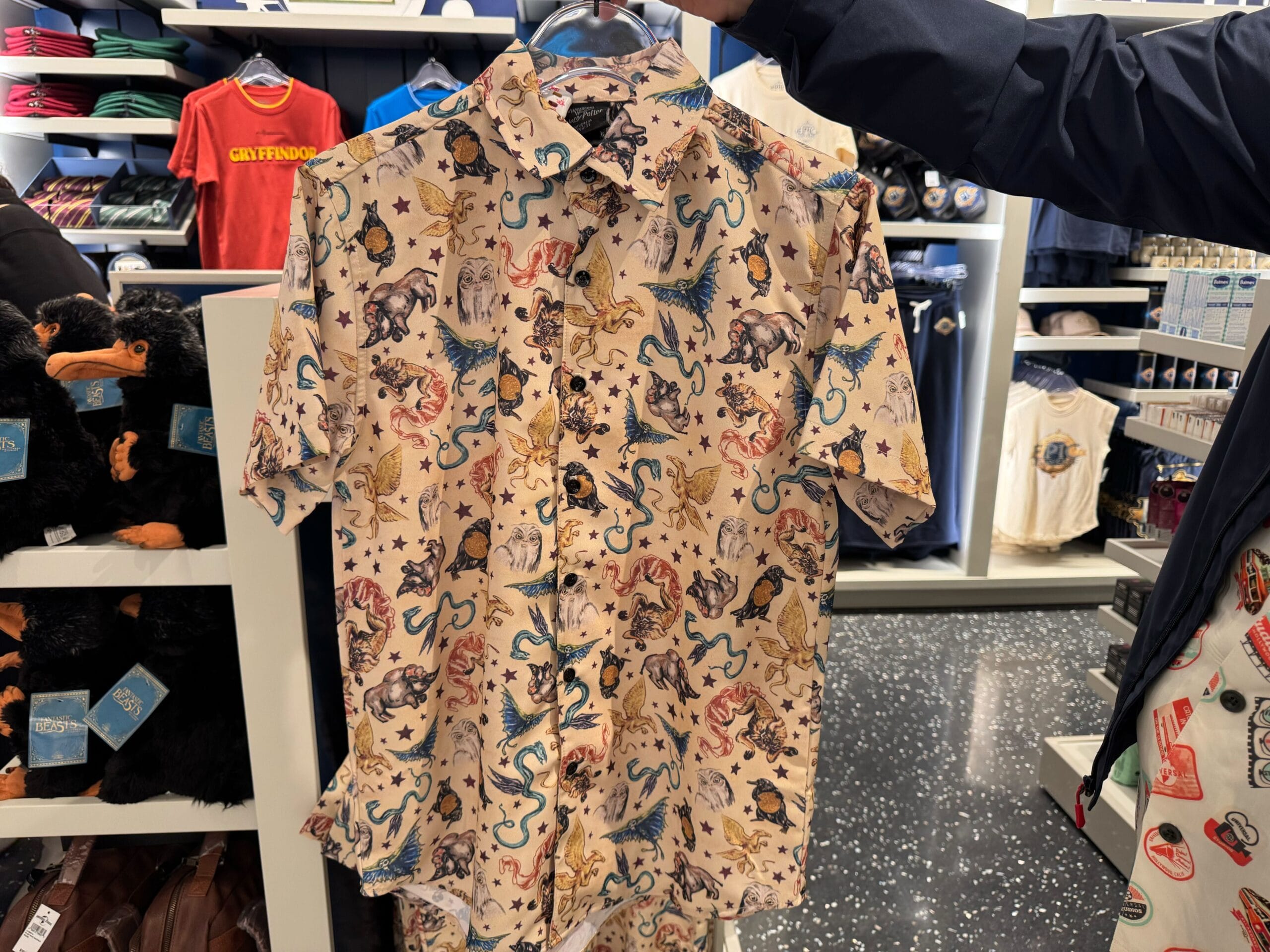The button-up is a light beige with an all-over pattern of fantastic beasts. It has black buttons and a collar.