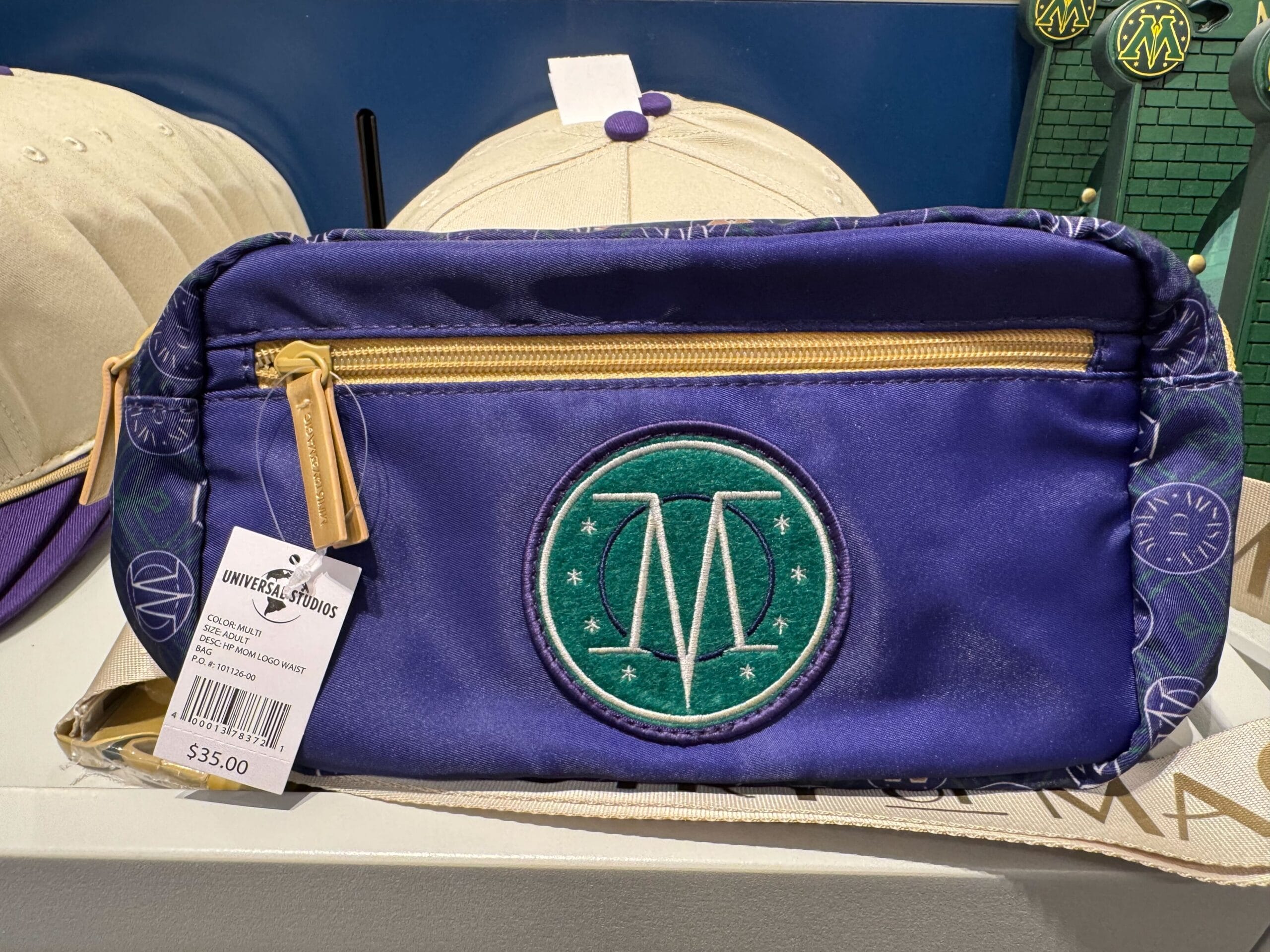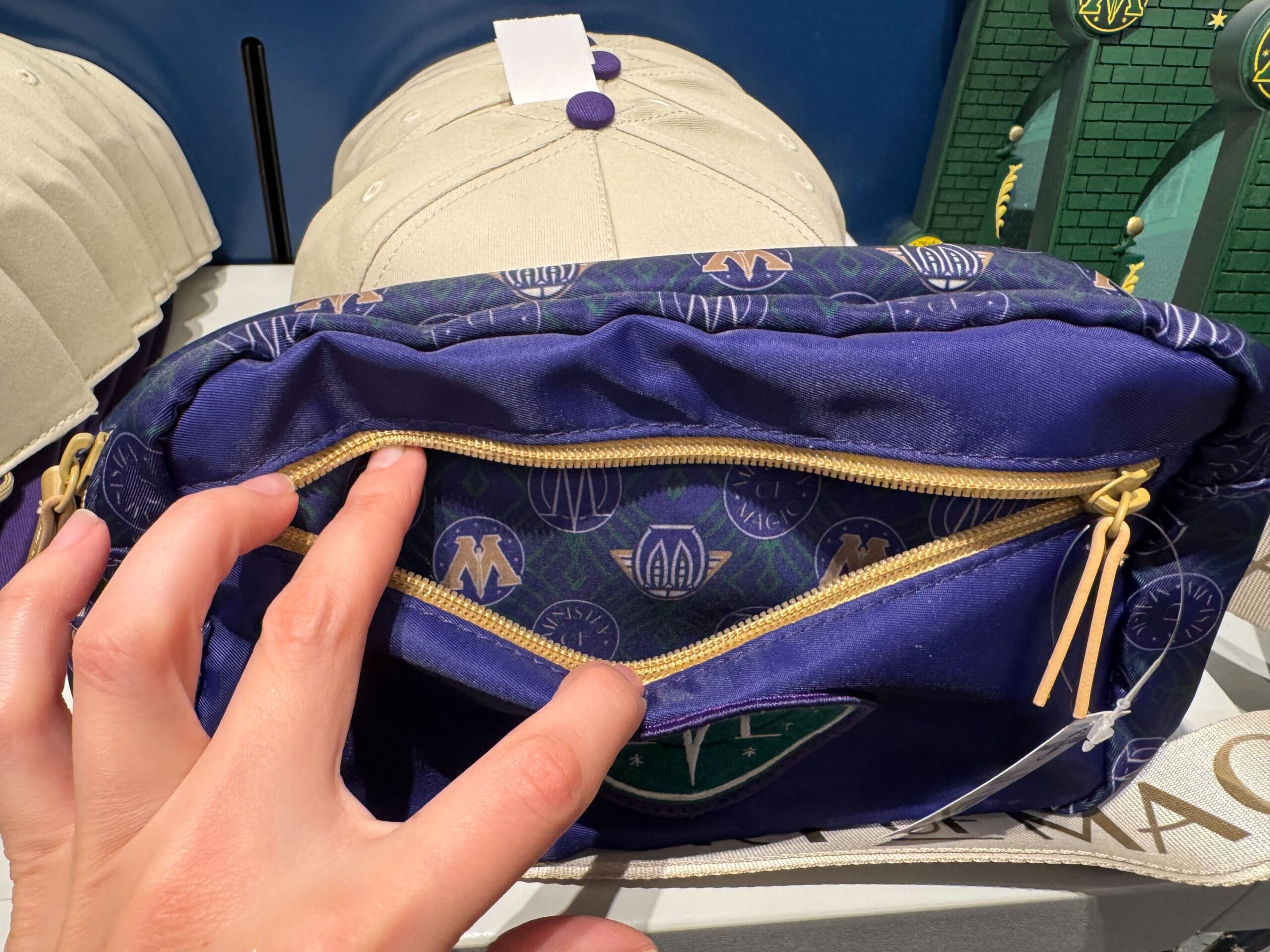The front of this bag is solid blue. The Epic Universe logo is a patch just barely wider than the bag. It has a small front pocket with a bronze-tone zipper.