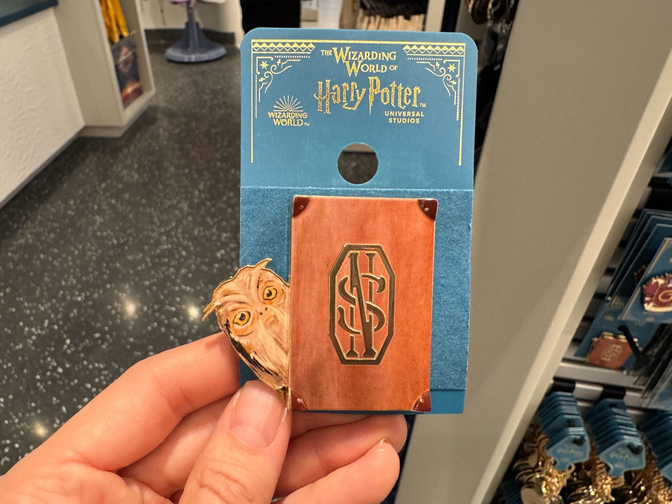 This pin also resembles Newt’s briefcase. A center piece flips back and forth, revealing a Demiguise or a Niffler.