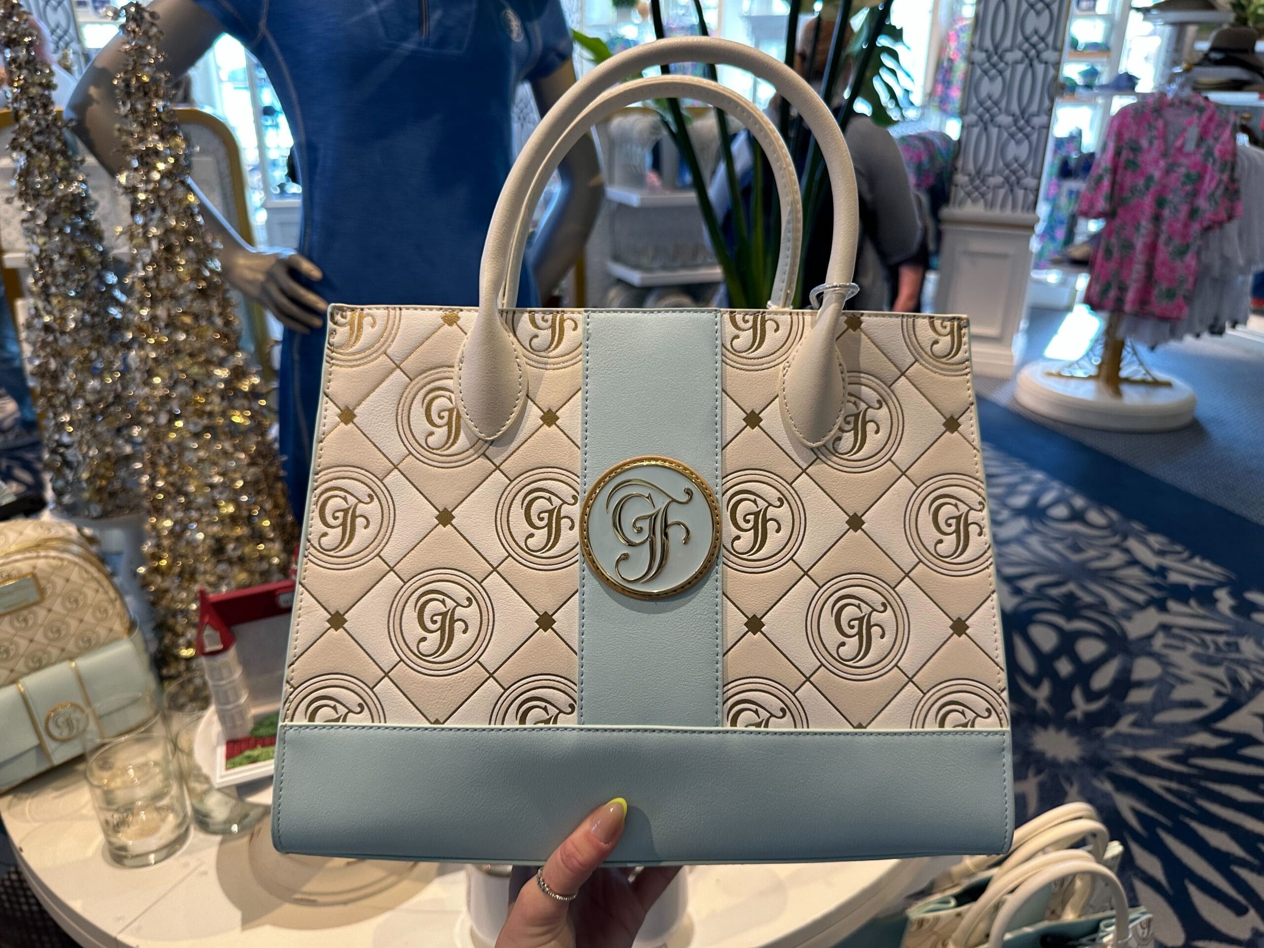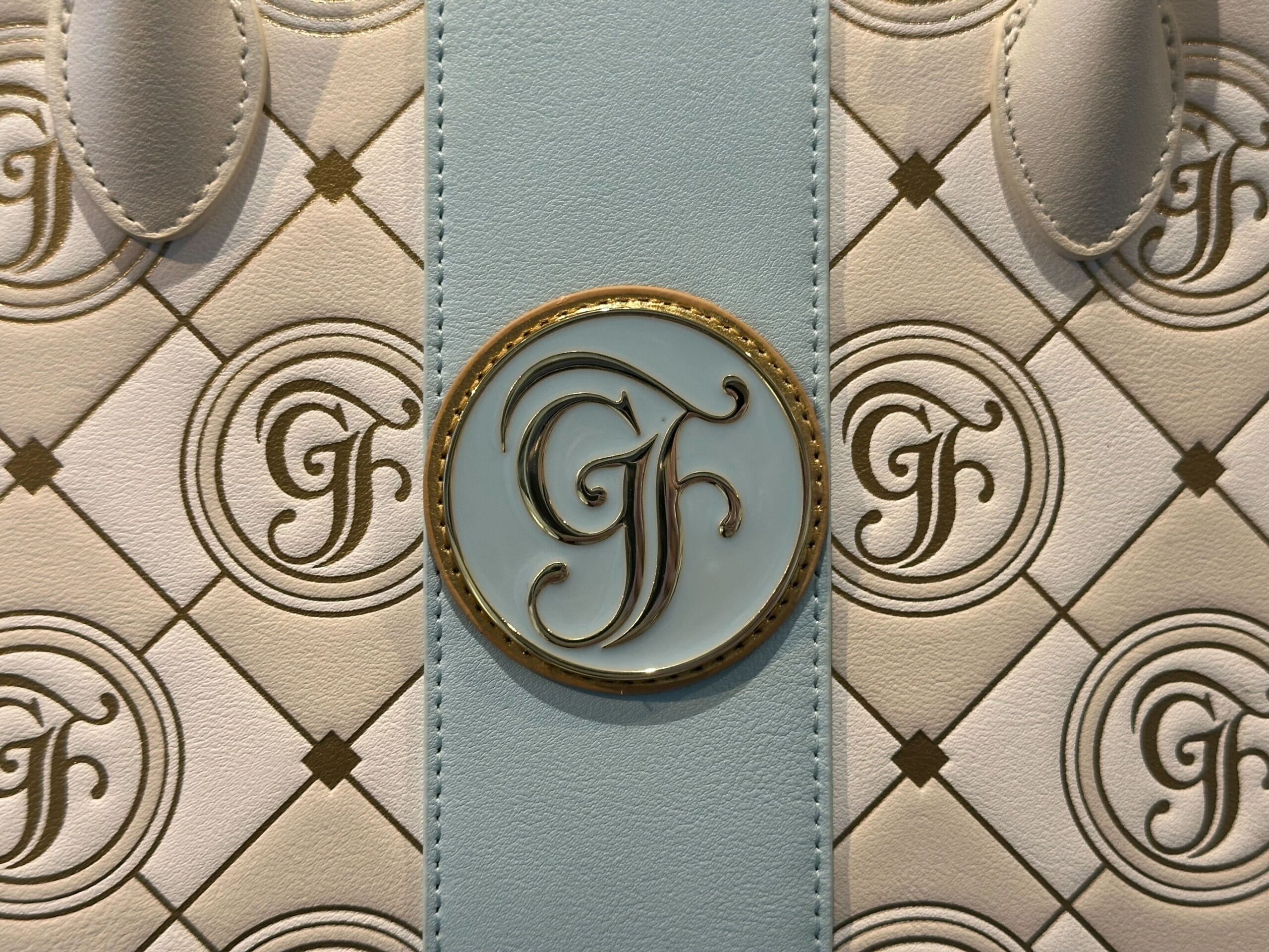 The tote features a pattern of shiny gold lines around white and beige diamonds, with gold diamonds at the corners. Stamped among the diamonds is the Grand Floridian “GF” logo.