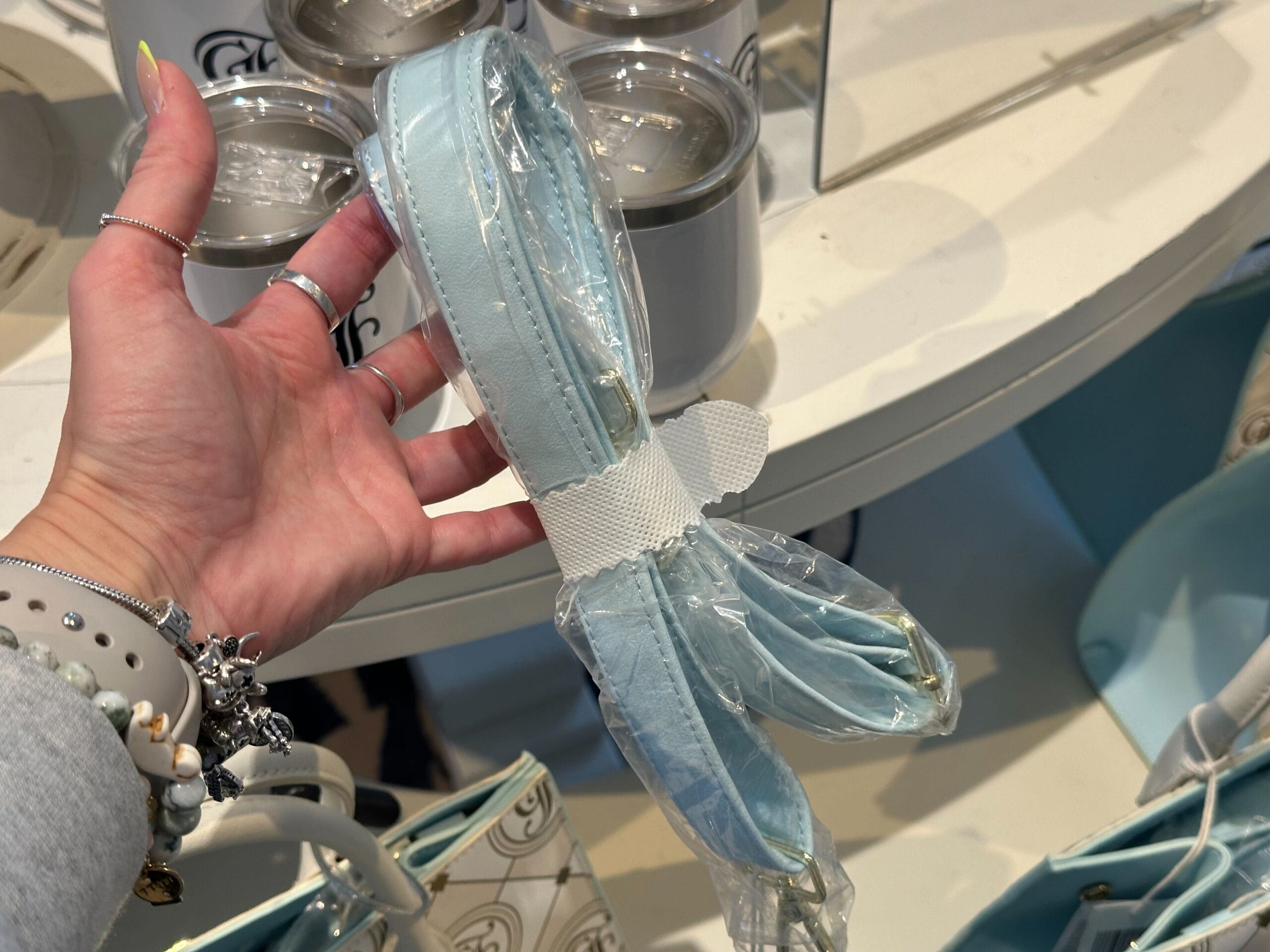 It includes a detachable blue crossbody strap.