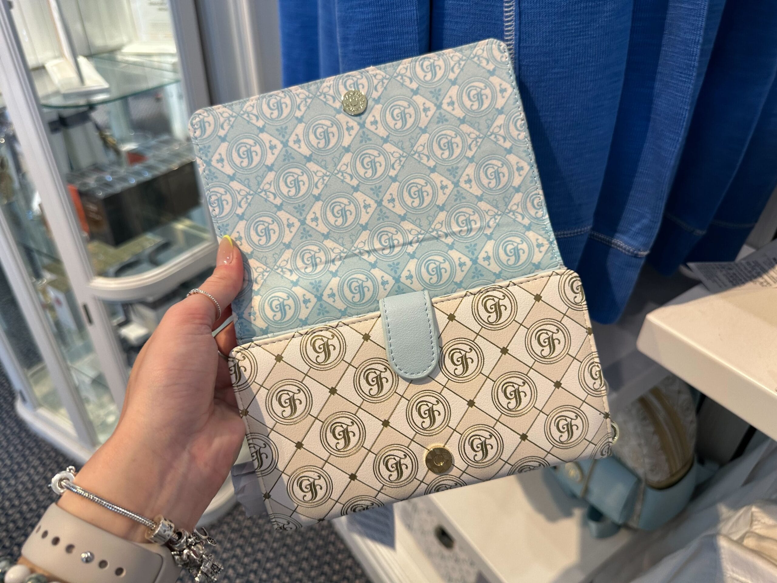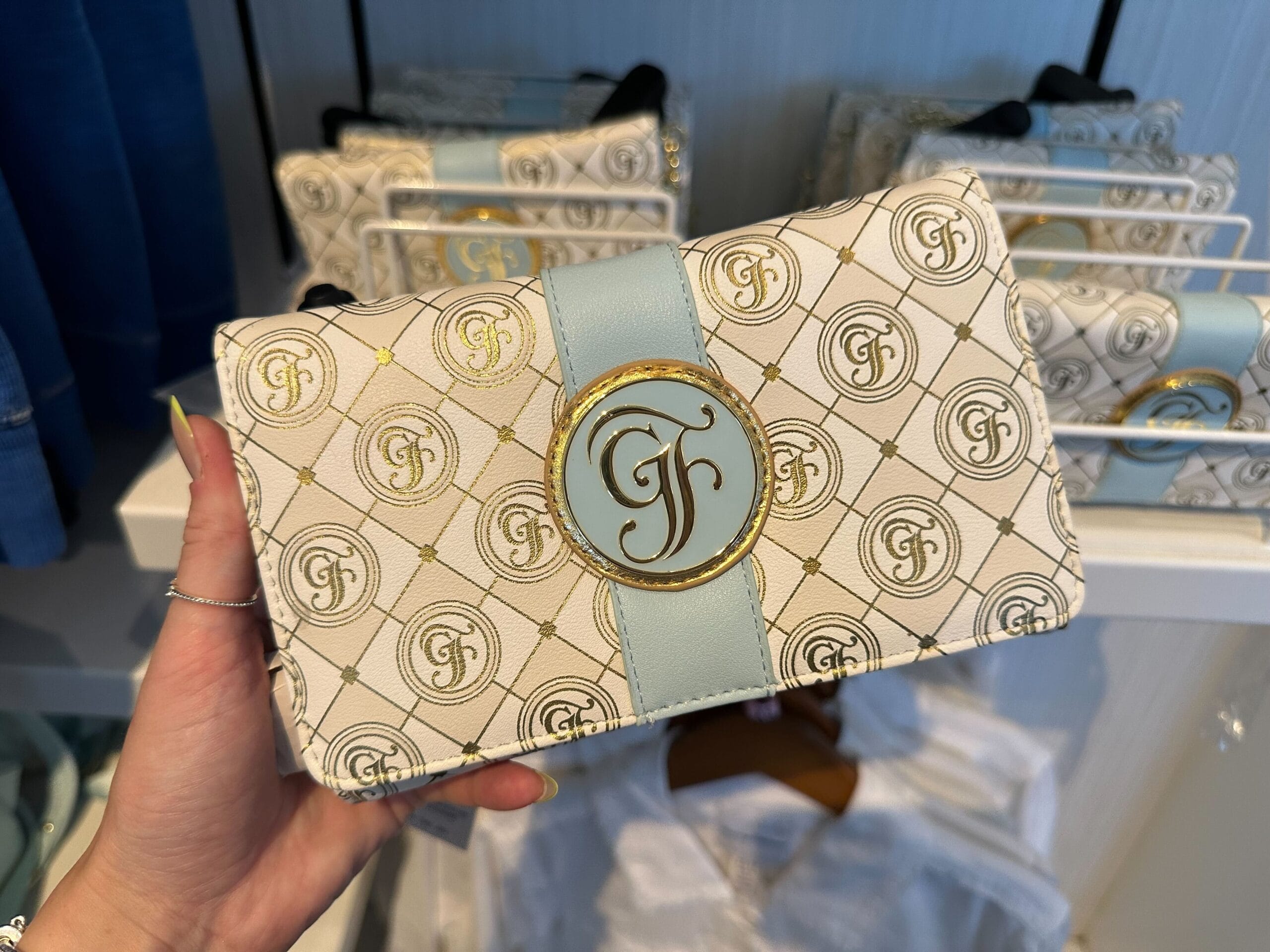 This wallet features the same diamond pattern as the tote. A light blue stripe runs down the front flap. The blue enamel “GF” logo medallion is against a gold patch on the stripe.