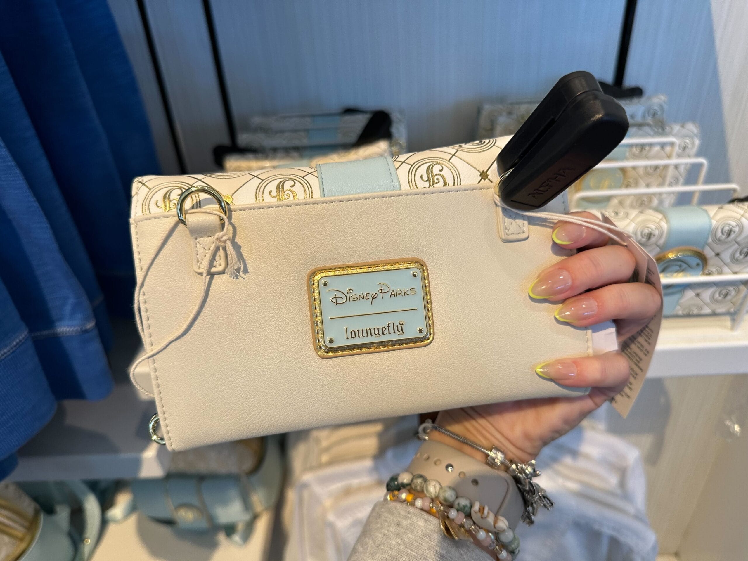 The back is solid beige. A blue Disney Parks | Loungefly label sits on a gold patch. It has metal rings for an included chain strap to use the wallet as a crossbody purse.