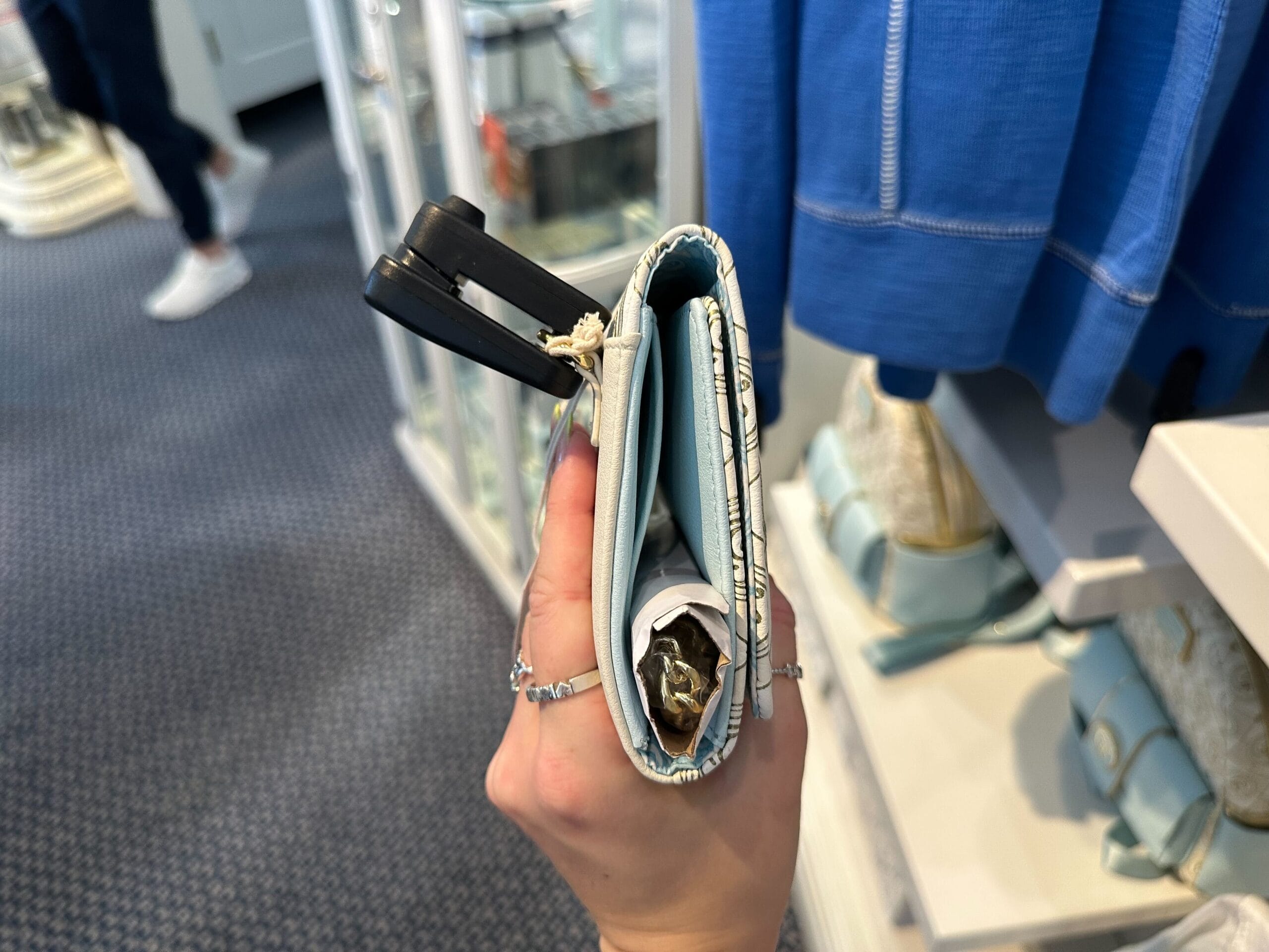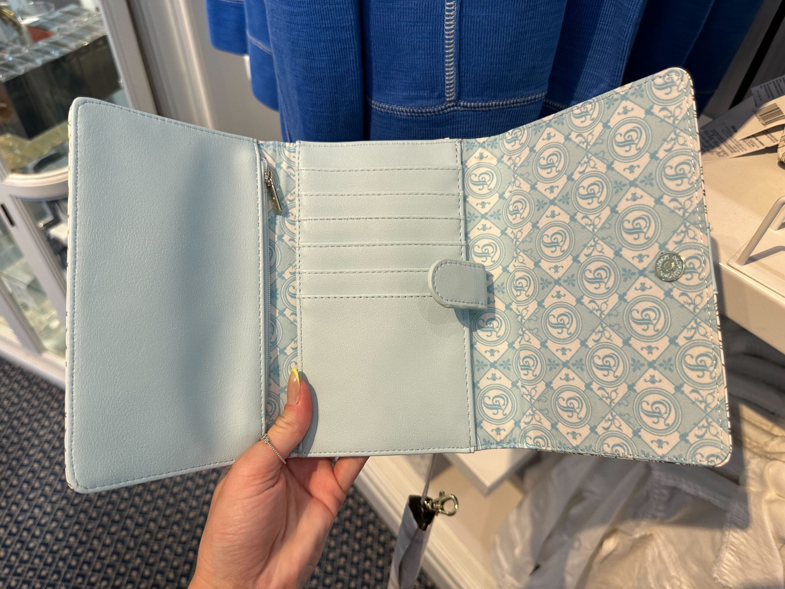 The wallet is lined with a blue and white fabric featuring a version of the exterior pattern with more filigree. The card slots and zip coin purse are made of solid blue pleather.