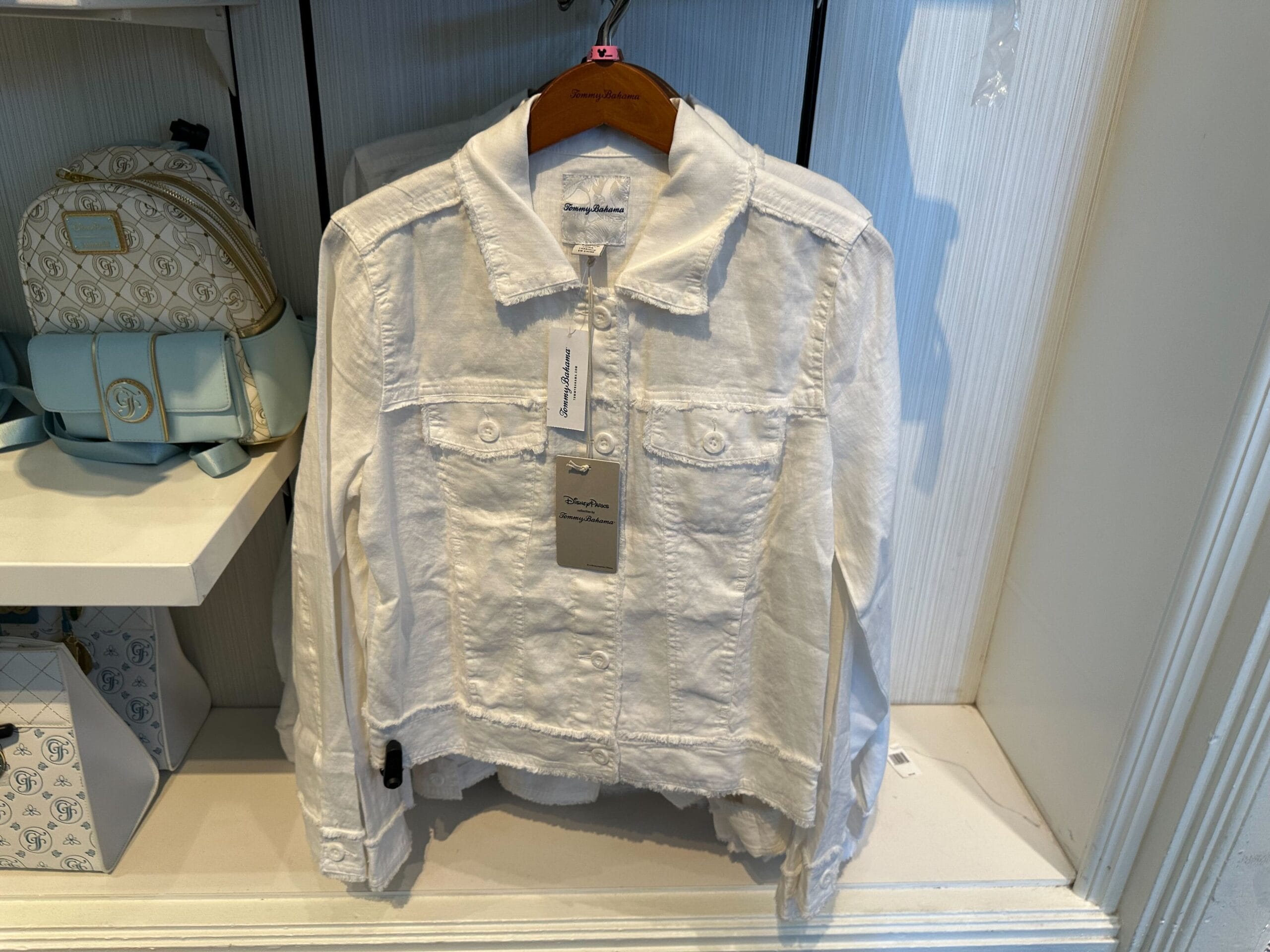 The Tommy Bahama shirt is a white button-up with breast pockets. It has unfinished edges.