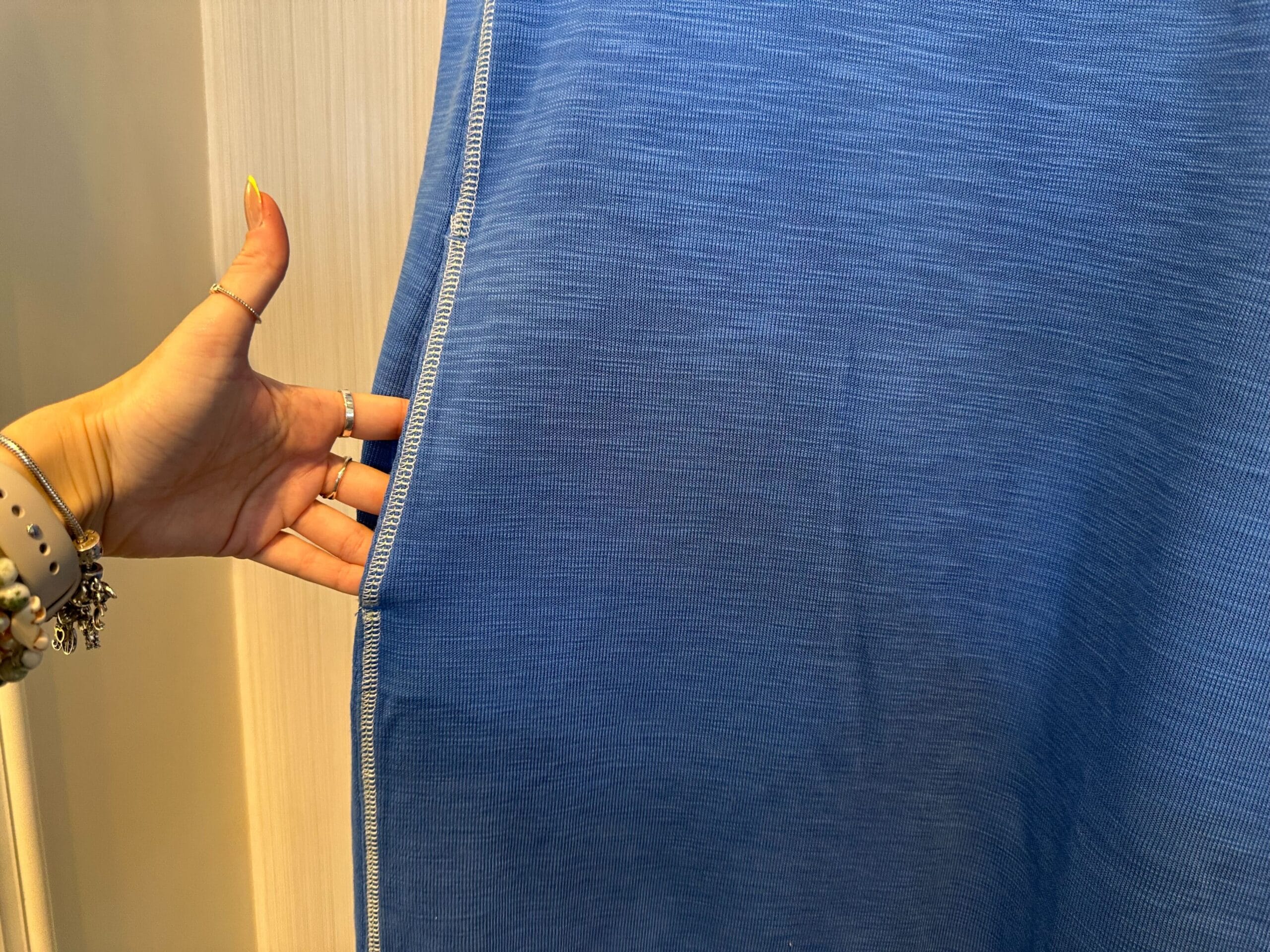 This new shift dress is blue with a half-zip down the chest. It has visible white stitching down the sides and around the short sleeves.