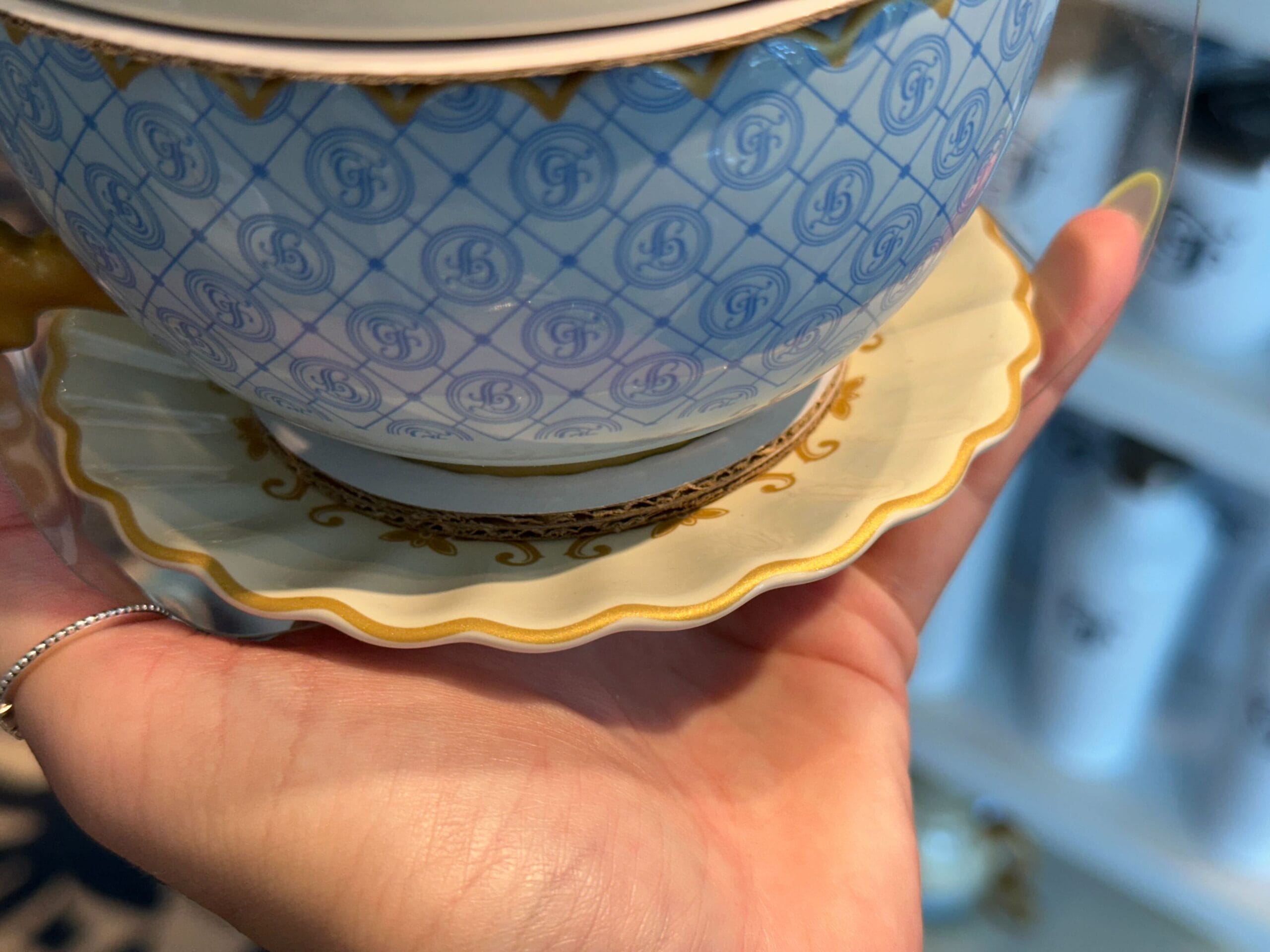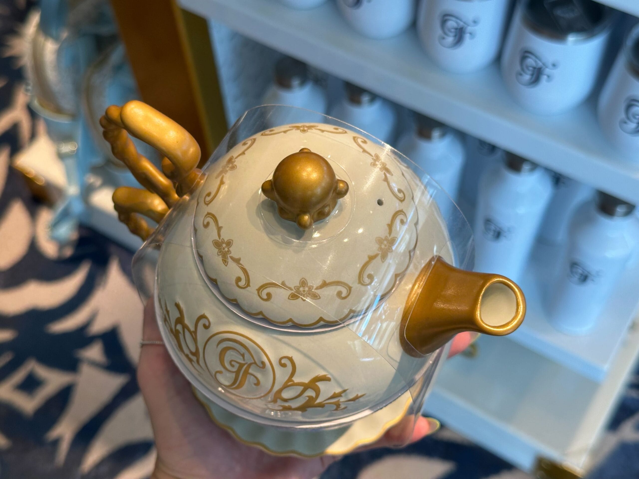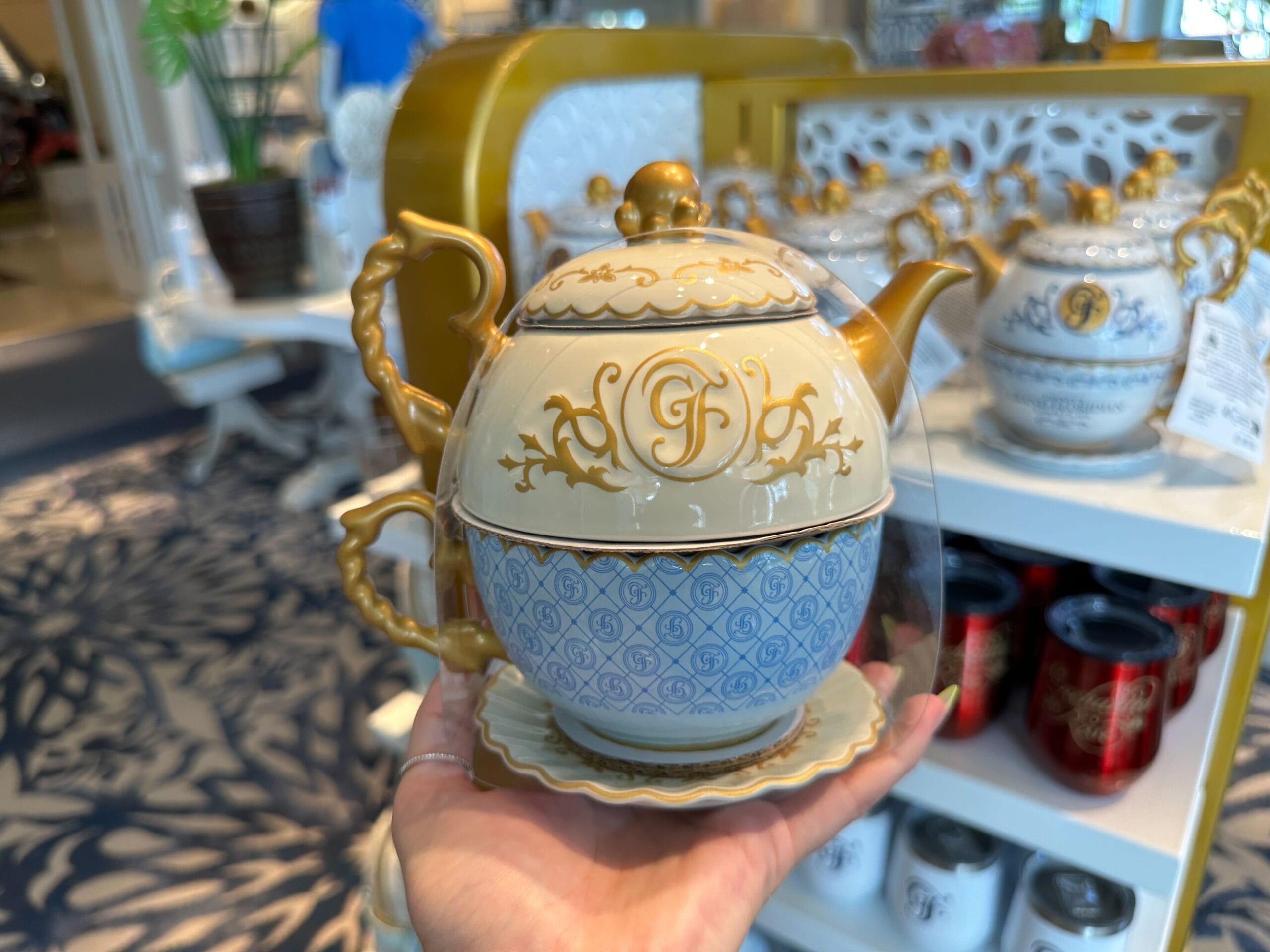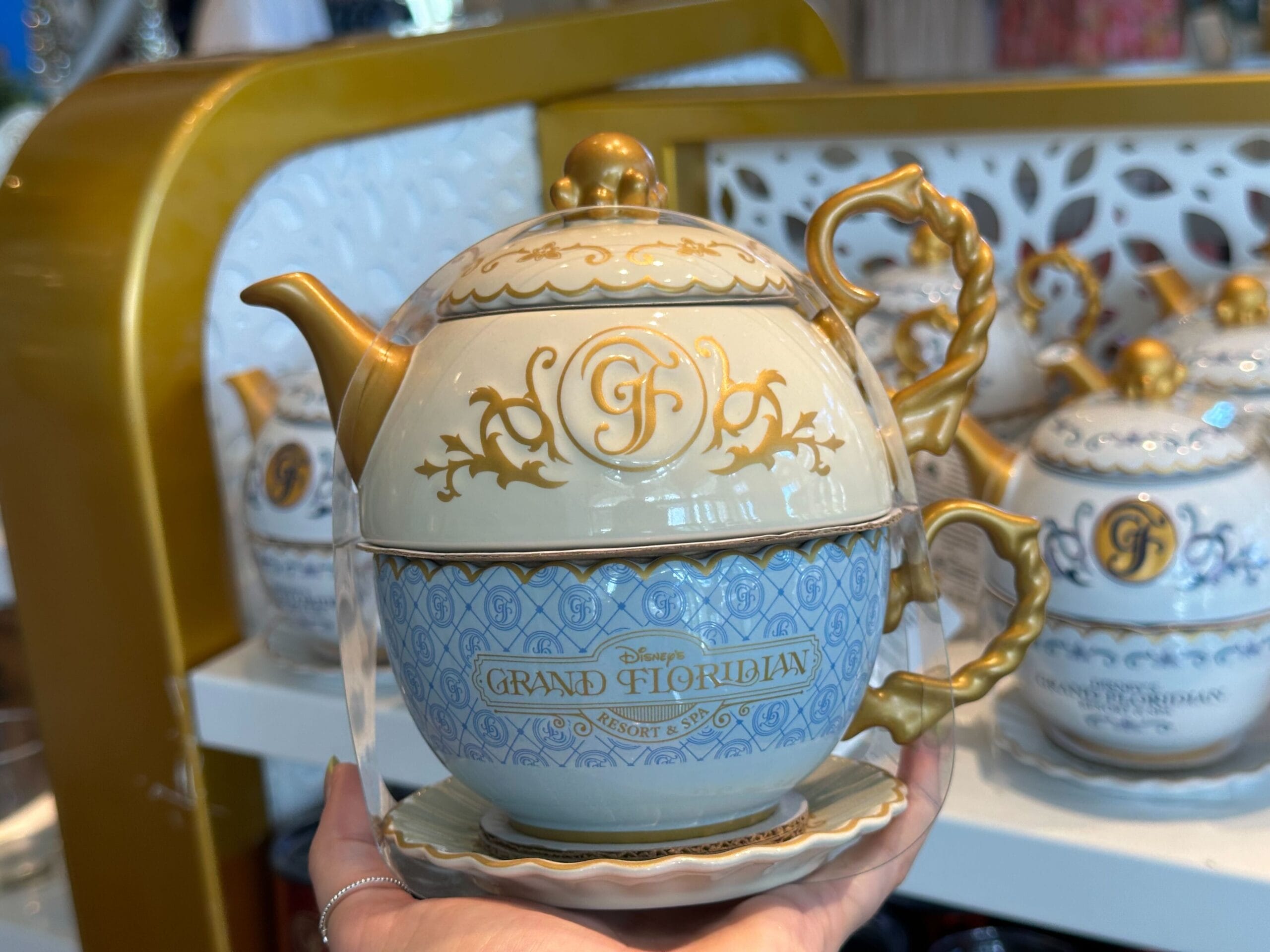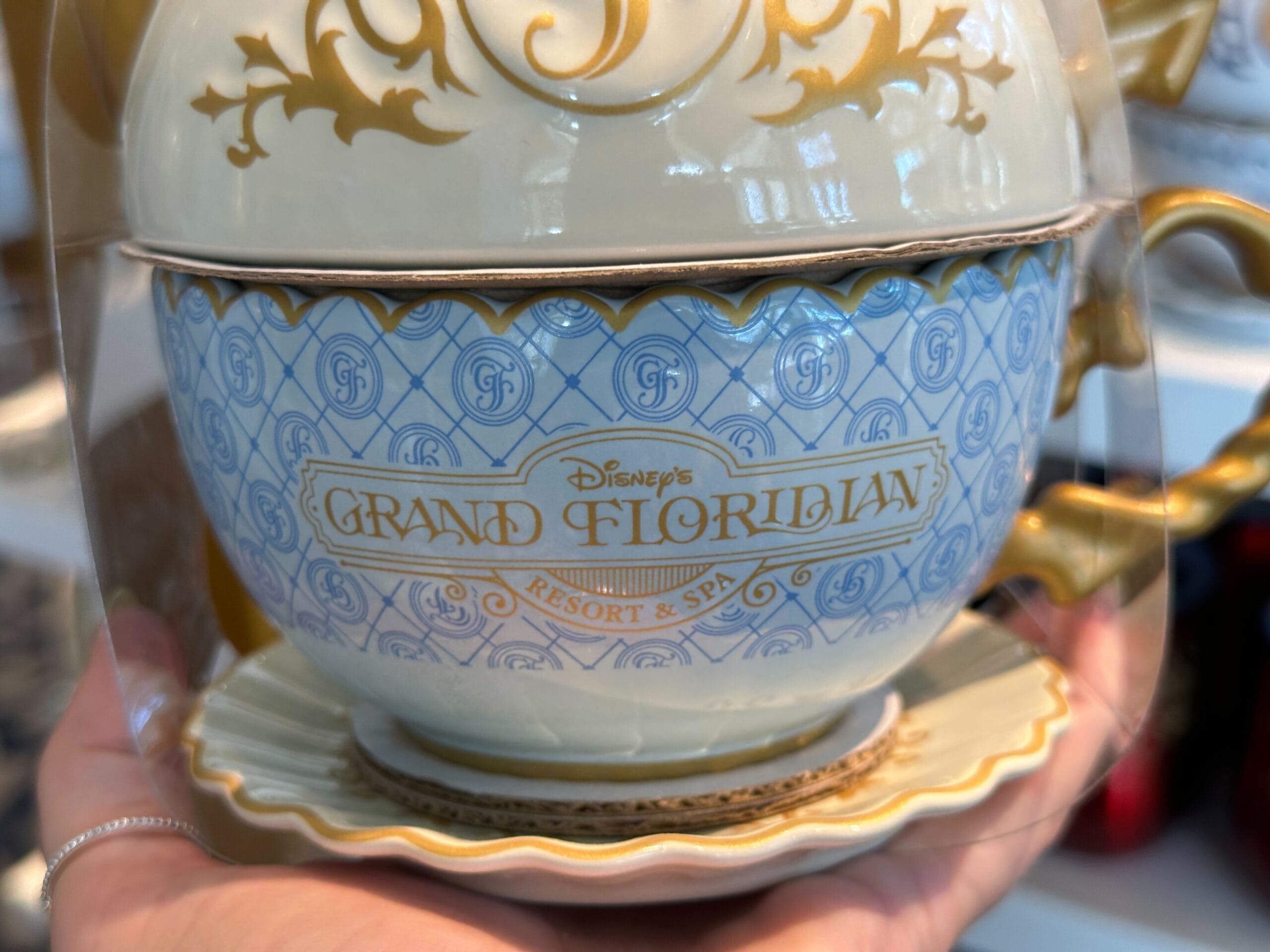 The teacup is light blue with the pattern of diamonds and the “GF” logo. The full Grand Floridian wordmark is in gold on the side. It has gold trim around its scalloped rim.
