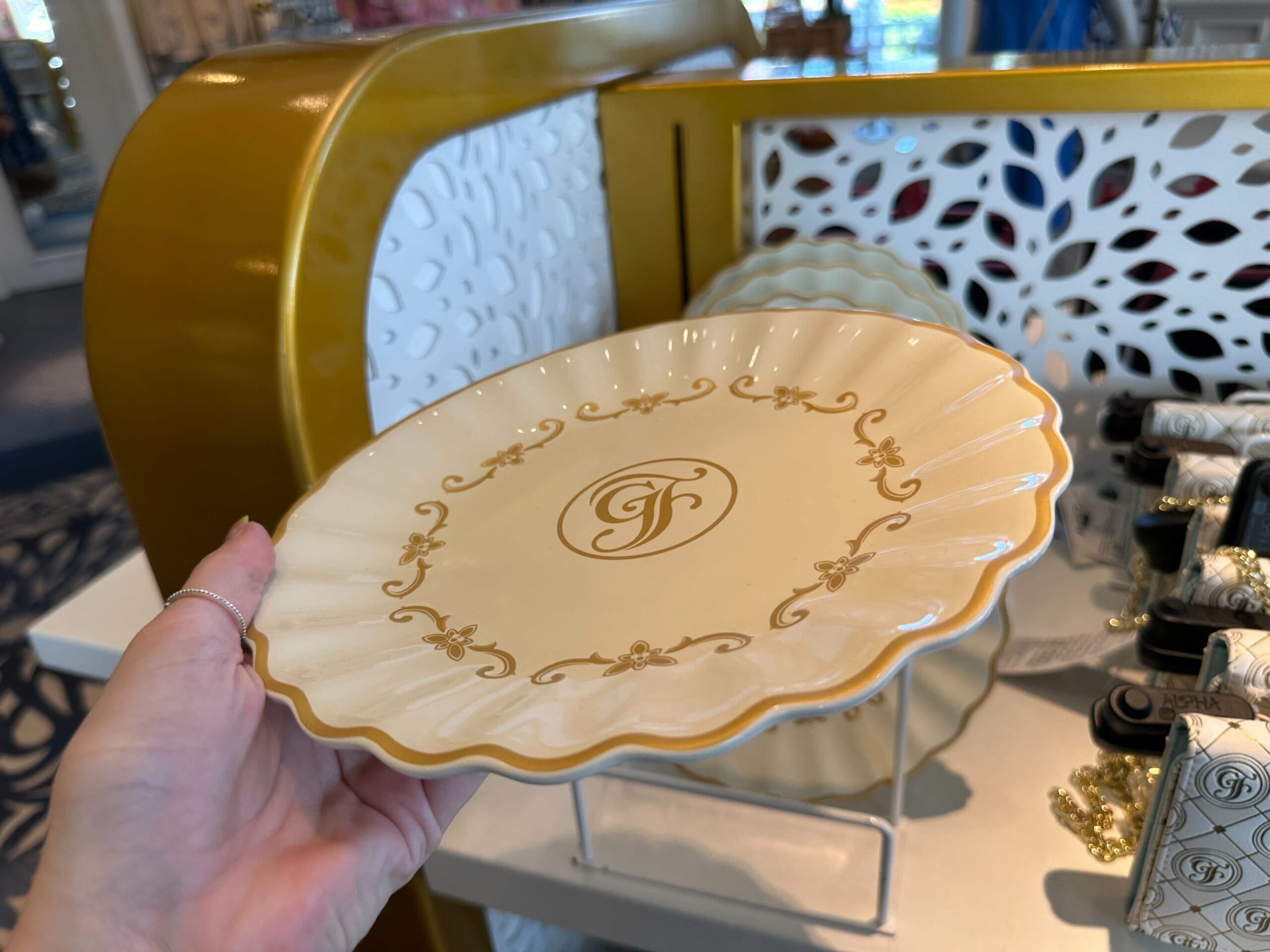 Gold filigree is in a ring around the center of the plate, which features a gold version of the Grand Floridian logo.