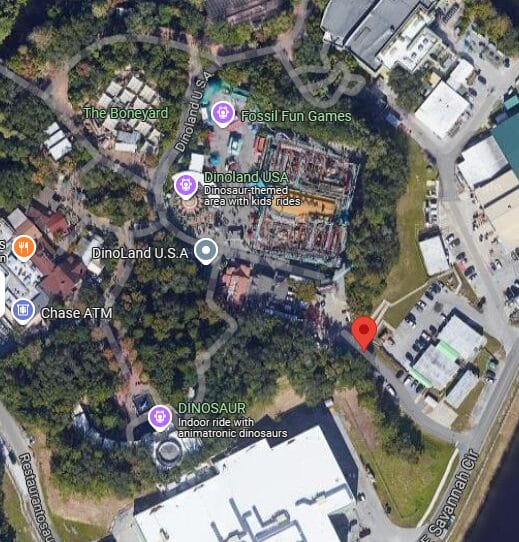According to WDWMagic, this permit entails demolition specifically for the TriceraTop Spin and Fossil Fun Games area in Chester & Hester’s Dino-Rama, which are both set to close alongside Chester & Hester’s Dinosaur Treasures on January 13. Above is a screenshot from Google Maps, with a red tag marking the permit address location.