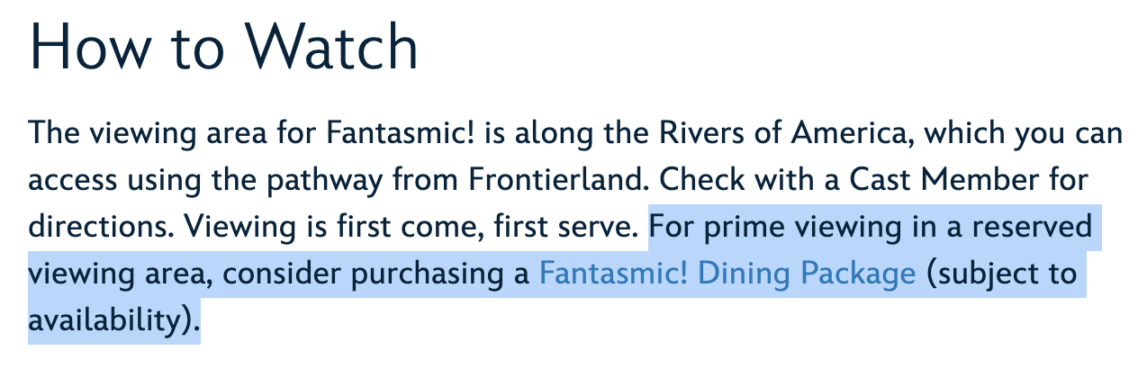 WHY? Because I must stand to watch the show UNLESS I purchase a dining package. It is crazy. Back in the day, we all could’ve sat and watched. But now, you have to buy a dining package to sit and watch.