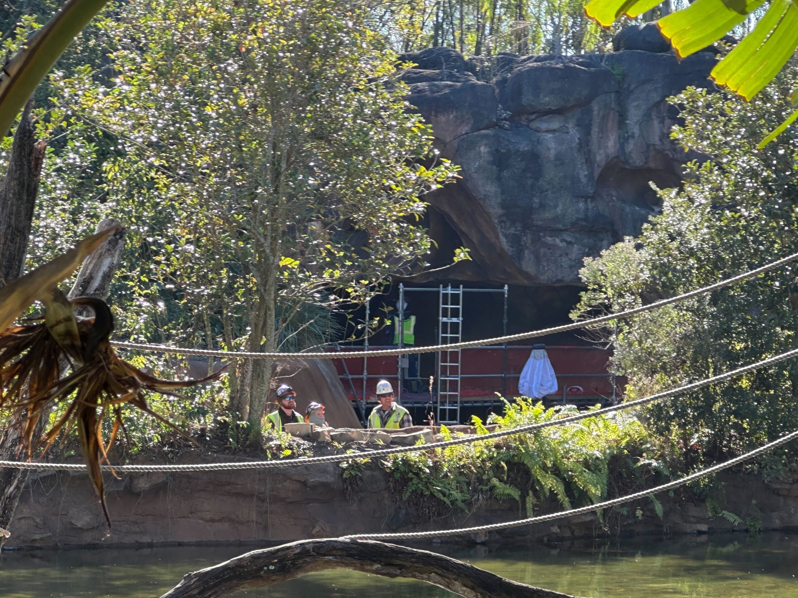 Views across the water of the Gibbons exhibit show construction crews actively working on the ride and scaffolding has been erected.