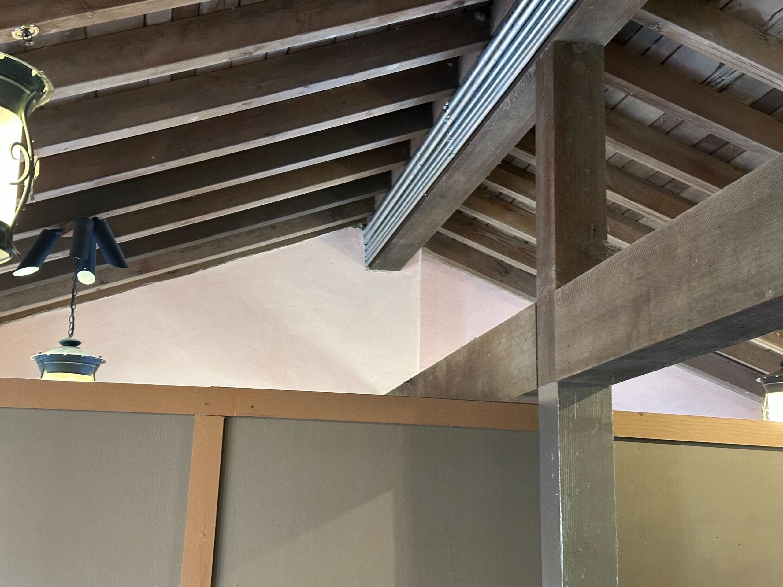 The walls are painted a light beige color. Some parts of the ceiling are not complete, with exposed sheathing and insulation. Plastic is wrapped around the ceiling’s themed beams to keep them protected during painting.