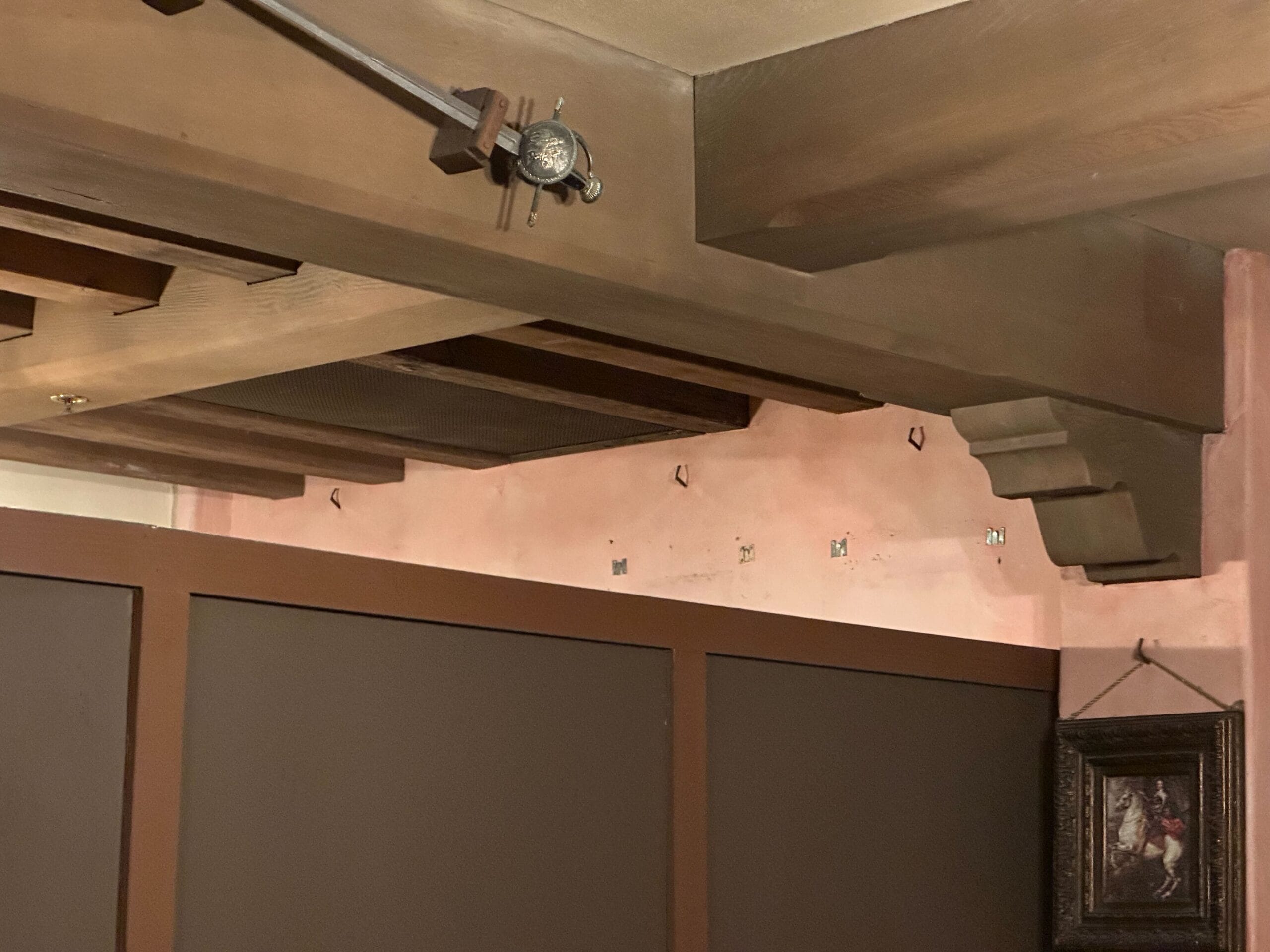 Along one wall is various hardware that once supported props. This wall may also be cleaned up and repainted before the Pirates of the Caribbean tavern opens in late 2025.