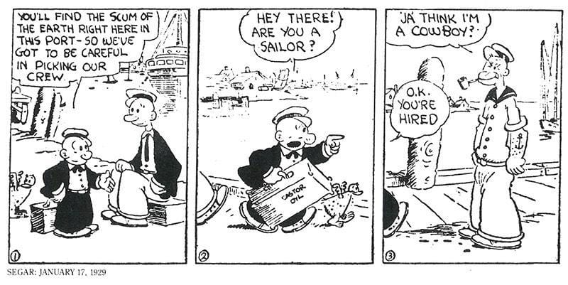 Popeye debuted in the daily King Features comic strip “Thimble Theatre” on January 17, 1929. Though “Thimble Theatre” had already existed for 10 years, Popeye’s popularity led to him becoming the main character, and the strip was ultimately renamed “Popeye.” After Segar died in 1938, several other writers and artists, including Bud Sagendorf, carried on with the “Popeye” comics. New “Popeye” comics continue to be produced, currently written and drawn by R. K. Milholland.