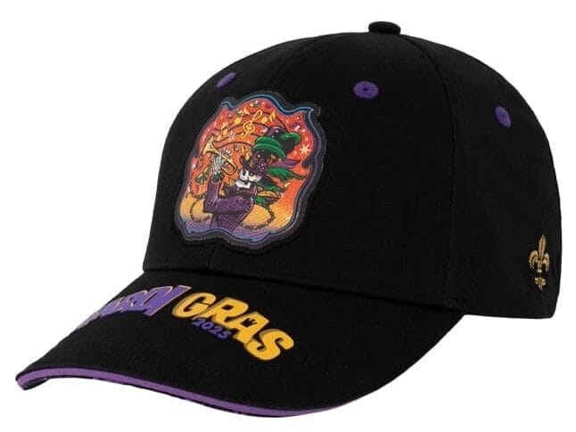 This black cap features an embroidered patch of Baron Tonton on the front with a screen-printed “Mardi Gras 2025” on the bill. An embroidered Fleur de Lis emblem is depicted on the side of the cap.