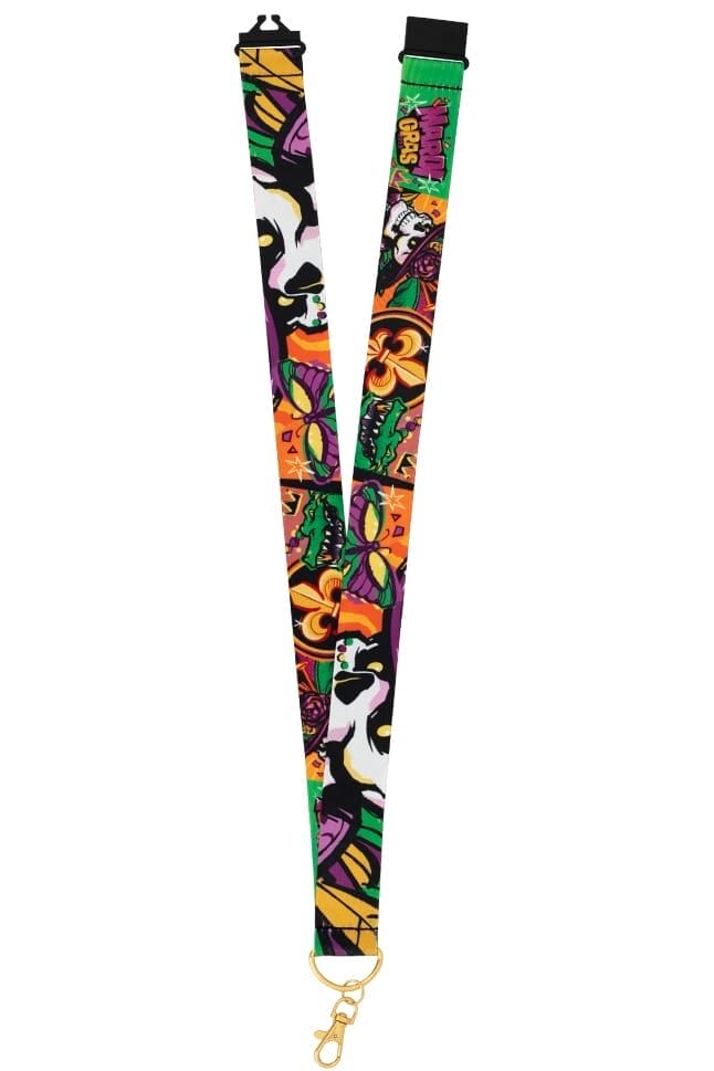 This Mardi Gras lanyard features a colorful all-over print of Baron Tonton, a gator, and Fleur de Lis emblem. It has a black plastic breakaway closure with a metal ring and lobster claw clip.