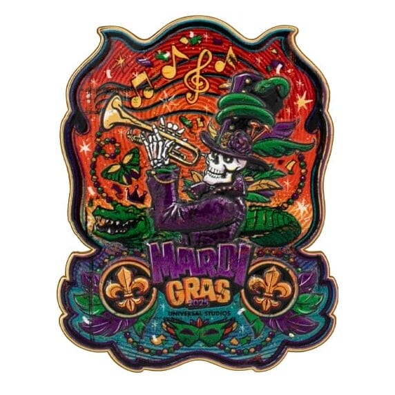 This limited edition pin features Baron Tonton on a colorful background of orange, yellow, and blue. Music notes, beads, and masks. Beneath him is the Mardi Gras 2025 Universal Studios logo.