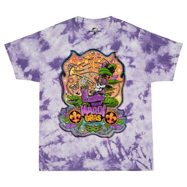 This adult shirt features a purple tie-dye design with Baron Tonton screen printed on the front along with the Mardi Gras 2025 Universal Studios wordmark.