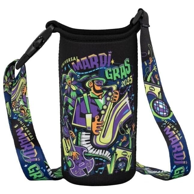 This beverage holder also has the same festive design as both the keychain and the magnet above. The strap of the beverage holder features an all-over design that includes the bass and saxophone players, the jester, the Universal Studios Florida entrance, a disco ball, and mardi gras beads. The Universal Mardi Gras 2025″ logo is also depicted throughout the design.
