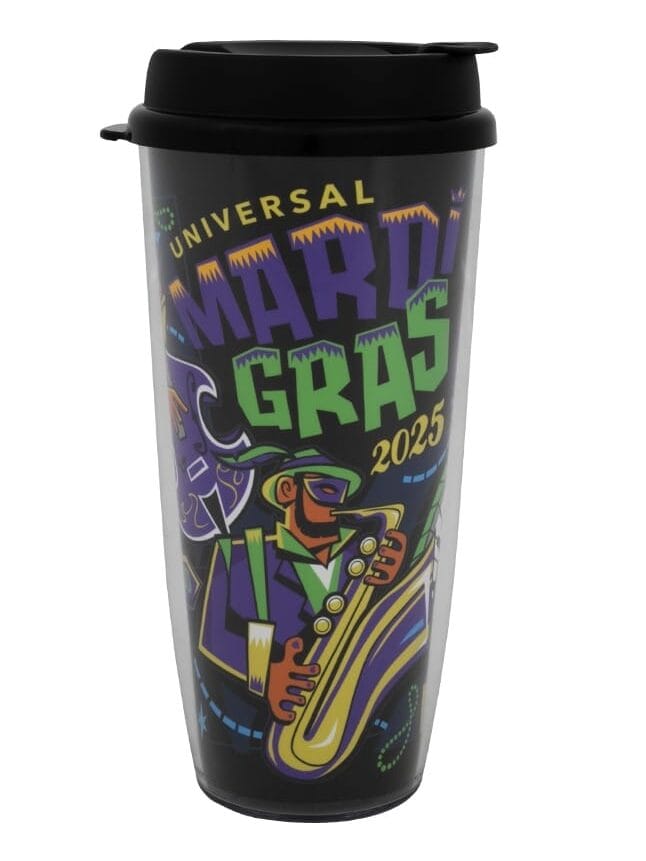 This tumbler features “Universal Mardi Gras 2025” across the front in yellow, gold, and green text on a black background. The saxophone player is also featured along with the bass player and beads are scattered throughout.